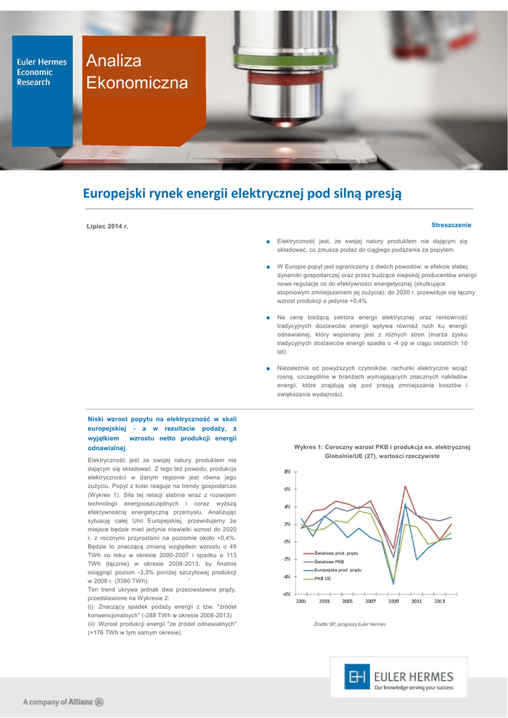 Analiza Ekonomiczna Europejski rynek energii elektrycznej pod silną presją Streszczenie Lipiec 2014 r. ■ Elektryczność jest, ze swojej natury produktem nie dającym się składować, co zmusza podaż do ciągłego podążania za popytem. ■ W Europie popyt jest ograniczony z dwóch powodów: w efekcie słabej dynamiki gospodarczej oraz przez budzące niepokój producentów energii nowe regulacje co do efektywności energetycznej (skutkujące stopniowym zmniejszaniem jej zużycia); do 2020 r. przewiduje się łączny wzrost produkcji o jedynie +0,4%. ■ Na cenę bieżącą sektora energii elektrycznej oraz rentowność tradycyjnych dostawców energii wpływa również ruch ku energii odnawialnej, który wspierany jest z różnych stron (marża zysku tradycyjnych dostawców energii spadła o -4 pp w ciągu ostatnich 10 lat). ■ Niezależnie od powyższych czynników, rachunki elektryczne wciąż rosną, szczególnie w branżach wymagających znacznych nakładów energii, które znajdują się pod presją zmniejszania kosztów i zwiększania wydajności. Niski wzrost popytu na elektryczność w skali europejskiej - a w rezultacie podaży, z wyjątkiem wzrostu netto produkcji energii odnawialnej. Elektryczność jest ze swojej natury produktem nie dającym się składować. Z tego też powodu, produkcja elektryczności w danym regionie jest równa jego zużyciu. Popyt z kolei reaguje na trendy gospodarcze (Wykres 1). Siła tej relacji słabnie wraz z rozwojem technologii energooszczędnych i coraz wyższą efektywnością energetyczną przemysłu. Analizując sytuację całej Unii Europejskiej, przewidujemy że miejsce będzie mieć jedynie niewielki wzrost do 2020 r. z rocznymi przyrostami na poziomie około +0,4%. Będzie to znaczącą zmianą względem wzrostu o 49 TWh co roku w okresie 2000-2007 i spadku o 113 TWh (łącznie) w okresie 2008-2013, by finalnie osiągnąć poziom -3,3% poniżej szczytowej produkcji w 2008 r. (3380 TWh). ' Ten trend ukrywa jednak dwa przeciwstawne prądy, przedstawione na Wykresie 2: (i) Znaczący spadek podaży energii z tzw. "źródeł konwencjonalnych" (-288 TWh w okresie 2008-2013) (ii) Wzrost produkcji energii "ze źródeł odnawialnych" (+176 TWh w tym samym okresie). Wykres 1: Coroczny wzrost PKB i produkcja en. elektrycznej Globalnie/UE (27), wartości rzeczywiste Światowa prod. prądu Światowe PKB Europejska prod. prądu PKB UE Źródła: BP, prognozy Euler Hermes Wzrost energii odnawialnej wynika z hojnych systemów wsparcia, finansowanych przez UE. Europejskie prawo wymusza na każdym kraju członkowskim, by zwiększało udział energii ze źródeł odnawialnych (np. z wiatru i słonecznej), w celu osiągnięcia 20% w 2020 r dla całej Unii. Niestety, koszt produkcji odnawialnej energii elektrycznej wciąż znacząco przekracza cenę, po jakiej może być ona sprzedana. We Francji państwo subsydiuje ten rozwój, wymagając od krajowego dostawcy elektryczności EDF by nabywał energię pochodzącą ze źródeł odnawialnych po cenach zamrożonych na wiele lat (od 15 do 20). Z racji wysokich kosztów produkcji, ta zamrożona cena jest o wiele wyższa niż cena bieżąca. Finansowanie tej różnicy cenowej jest realizowane za pomocą specjalnego podatku CSPE, który doliczany jest do wszystkich rachunków za elektryczność. W rezultacie, wraz ze wzrostem udziału energii odnawialnej w łącznej produkcji energii, podatek CPSE powoduje ciągły wzrost wydatków na elektryczność, łączne koszty elektryczności wzrosły z 560 milionów euro do 3 miliardów euro w okresie 2009-2013, a do 2017 r. spodziewany jest wzrost do 5 miliardów euro. Najgorsza jest sytuacja w Niemczech. Podatek CPSE wynosi średnio 10% każdego rachunku za elektryczność we Francji, jego niemiecki ekwiwalent (EEG) wynosi ponad 30%. Wynika z tego, że im większa różnica między ceną gwarantowaną a ceną bieżącą, tym większy będzie podatek CPSE. Z tego właśnie powodu administracja Kanclerz Merkel zapewnia klientom przemysłowym dodatkowe subsydia, które obniżają finalne rachunki za elektryczności. Przy braku tego rozwiązania, niemiecka konkurencyjność ucierpiałaby. Te różne systemy wsparcia w znaczący sposób wpłynęły na rynek przez redukcję hurtowej ceny elektryczności (-8% od Tabela 2: Wzrost Europejskiej produkcji energii w czasie (w TWh) Średni roczny wzrost (UE) 2013 2020 (p) 2000 - 2007 2008 - 2012 Światowa produkcja prądu 1,5% -0,7% 0,4% Produkcja prądu ze źródeł odnawialnych 3% 7% 5% , Źródła: IHS Global Insight prognozy Euler Hermes Wykres 3: Zmiany w hurtowej (bieżącej) cenie elektryczności w EUR/MWh Niemcy Francja Hiszpania Zjednoczone Królestwo Źródła: Bloomberg, Euler Hermes 2008 r.) prowadząc do nadwyżki mocy u dostawców energii. Europejski rynek elektryczności działa według tak zwanego systemu "rankingu cenowego": w odpowiedzi na popyt na elektryczność, dostawcy wybierani są na podstawie najniższych kosztów. W teorii, ten proces powinien faworyzować elektrownie wodne i atomowe, następnie węglowe, a na końcu gazowe. Dlatego też Europejski rynek elektryczności jest ograniczony przez dwa główne czynniki: - konieczna jest stała podaż energii, gdzie sieć dostawcza musi być w stanie natychmiastowo zastępować brakujące źródła energii. - koszt energii dla dostaw energii pochodzących od konwencjonalnych dostawców. Wynika to z faktu, że dostawcy energii odnawialnej korzystają z priorytetowego dostępu do rynku wraz z gwarantowaną stałą ceną sprzedaży W rezultacie nadwyżki produkcji energii spowodowanej erozją popytu, wspartej ponadto konkurencją ze strony silnie subsydiowanych odnawialnych źródeł energii nastąpił silny nacisk na bieżące ceny energii elektrycznej (wykres nr.3) Tabela 4: Najwięksi unijni dostawcy (1), według kraju i obrotu Obrót (miliony euro) 2002 2013 Średni trend (2) Niemcy 79,180 173,840 7% Francja 62,905 164,890 9% Włochy 28,415 77,260 10 % 33,2