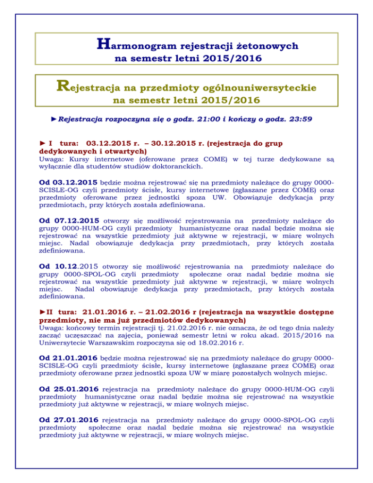 Harmonogram rejestracji żetonowych na semestr letni 2015/2016 Rejestracja na przedmioty ogólnouniwersyteckie na semestr letni 2015/2016 ►Rejestracja rozpoczyna się o godz. 21:00 i kończy o godz. 23:59 ► I tura: 03.12.2015 r. – 30.12.2015 r. (rejestracja do grup dedykowanych i otwartych) Uwaga: Kursy internetowe (oferowane przez COME) w tej turze dedykowane są wyłącznie dla studentów studiów doktoranckich. Od 03.12.2015 będzie można rejestrować się na przedmioty należące do grupy 0000SCISLE-OG czyli przedmioty ścisłe, kursy internetowe (zgłaszane przez COME) oraz przedmioty oferowane przez jednostki spoza UW. Obowiązuje dedykacja przy przedmiotach, przy których została zdefiniowana. Od 07.12.2015 otworzy się możliwość rejestrowania na przedmioty należące do grupy 0000-HUM-OG czyli przedmioty humanistyczne oraz nadal będzie można się rejestrować na wszystkie przedmioty już aktywne w rejestracji, w miarę wolnych miejsc. Nadal obowiązuje dedykacja przy przedmiotach, przy których została zdefiniowana. Od 10.12.2015 otworzy się możliwość rejestrowania na przedmioty należące do grupy 0000-SPOL-OG czyli przedmioty społeczne oraz nadal będzie można się rejestrować na wszystkie przedmioty już aktywne w rejestracji, w miarę wolnych miejsc. Nadal obowiązuje dedykacja przy przedmiotach, przy których została zdefiniowana. ►II tura: 21.01.2016 r. – 21.02.2016 r (rejestracja na wszystkie dostępne przedmioty, nie ma już przedmiotów dedykowanych) Uwaga: końcowy termin rejestracji tj. 21.02.2016 r. nie oznacza, że od tego dnia należy zacząć uczęszczać na zajęcia, ponieważ semestr letni w roku akad. 2015/2016 na Uniwersytecie Warszawskim rozpoczyna się od 18.02.2016 r. Od 21.01.2016 będzie można rejestrować się na przedmioty należące do grupy 0000SCISLE-OG czyli przedmioty ścisłe, kursy internetowe (zgłaszane przez COME) oraz przedmioty oferowane przez jednostki spoza UW w miarę pozostałych wolnych miejsc. Od 25.01.2016 rejestracja na przedmioty należące do grupy 0000-HUM-OG czyli przedmioty humanistyczne oraz nadal będzie można się rejestrować na wszystkie przedmioty już aktywne w rejestracji, w miarę wolnych miejsc. Od 27.01.2016 rejestracja na przedmioty należące do grupy 0000-SPOL-OG czyli przedmioty społeczne oraz nadal będzie można się rejestrować na wszystkie przedmioty już aktywne w rejestracji, w miarę wolnych miejsc. Rejestracja na egzaminy językowe ►TERMIN REJESTRACJI NA EGZAMINY W SESJI ZIMOWEJ 2015/2016 17.11.2015 - 21.01.2016 Kurs repetytoryjny: 24.11.2015 - 19.01.2016 ►TERMIN REJESTRACJI NA EGZAMINY W SESJI POPRAWKOWEJ (MARCOWEJ) 2015/2016 20.02.2016 - 02.03.2016 Kurs repetytoryjny: 21.02.2016 - 27.02.2016 ►TERMIN REJESTRACJI NA EGZAMINY W SESJI LETNIEJ 2015/2016 15.04.2016 - 30.05.2016 Kurs repetytoryjny: 21.04.2016 - 26.05.2016 ►TERMIN REJESTRACJI NA EGZAMINY W SESJI JESIENNEJ 2015/2016 10.07.2016 - 24.08.2016 Kurs repetytoryjny: 17.07.2016 - 22.08.2016 INFORAMCJE DODATKOWE: • Lektoraty odbywają się w cyklach rocznych (z wyjątkiem e-lektoratów). Studenci, którzy zapisali się na semestr zimowy, na semestr letni zostaną przepisani automatycznie, nawet pomimo braku żetonów. Studenci, którzy z ważnych powodów zrezygnują z uczęszczania na zajęcia w semestrze letnim, będą mogli się wyrejestrować ( z semestru letniego) w terminie: 02.0221.02.2016 Rejestracja na przedmioty pedagogiczne na semestr letni roku akad. 2015/2016 ►Rejestracja rozpoczyna się o godz. 21:00 i kończy o godz. 23:59 ►I tura: 09.12.2015 r. - 30.12.2015 r. Rejestracja do grup dedykowanych. ►II tura: 18.01.2015 r. - 01.02.2016 r. Rejestracja do grup dedykowanych. ►02.02.2016 r. - 21.02.2016 r. Rejestracja do wszystkich dostępnych dedykowanych. grup, nie ma już przedmiotów Uwaga: końcowy termin rejestracji tj. 21 lutego 2016 r. nie oznacza, że od tego dnia należy zacząć uczęszczać na zajęcia, ponieważ semestr letni roku akad. 2015/2016 na Uniwersytecie Warszawskim rozpoczyna się 18 lutego 2016 roku. Rejestracja na zajęcia wychowania fizycznego na semestr letni roku akad. 2015/2016 ►I tura od 02.02.2016 godz. 21:00 do 08.08.2016 godz. 23.59 od 02.02.2016 godz. 21:00 do 08.02.2016 godz. 23.59 - zapisy na zajęcia: • Aqua – body shape • Aqua fitness • Judo • Piłka wodna • Pływanie • Tenis stołowy od 03.02.2016 godz. 21:00 do 08.02.2016 godz. 23.59 - zapisy zajęcia: • Body shape • Gry sportowe • Korektywa • Piłka koszykowa mężczyzn i grup mieszanych • Piłka nożna kobiet i mężczyzn • Piłka ręczna mężczyzn • Piłka siatkowa kobiet, mężczyzn i grup mieszanych od 04.02.2016 godz. 21:00 do 08.02.2016 godz. 23.59 – zapisy na zajęcia: • Aerobik • Badminton • BODY ART® • Nordic walking • Pilaste • Stretching • TBC • Taniec jazzowy • Taniec towarzyski • ZUMBA®Fitness od 05.02.2016 godz. 21:00 08.02.2016 godz. 23.59 – zapisy na zajęcia: • Ergometr wioślarski • Siłownia • Szermierka rekreacyjna • Wspinaczka od 06.02.2016 godz. 21:00 do 08.02.2016 godz. 23.59 – zapisy na zajęcia: • Zajęcia płatne prowadzone przez AZS: - Aikido – Badminton – Boks - Capoeira - Cross training - Jazda konna - Joga (sivananda i sportowa) - Ju-Jitsu Brazylijskie - Karate - Kraw-maga (samoobrona) - MMA – Salsa - Taniec brzucha - Taniec nowoczesny - Taniec towarzyski - Tenis ziemny - Wspinaczka sportowa - ZUMBA®Fitness • Zajęcia płatne prowadzone przez jednostki zewnętrzne: - Jazda konna Patataj - Szermierka rekreacyjna - Szkoła Tańca Egurrola Dance Studio - Szkoła Tańca K. Polańskiego ►II tura od 10.02.2016 godz. 21.00 do 16.02.2016 godz. 23.59 Od 18.02.2016 godz. 10:00 do 24.02.2016 godz. 14:00 zapisy ręczne NA WOLNE MIEJSCA TYLKO DLA FAKULTETÓW Studenci fakultatywni to studenci, którzy zaliczyli obowiązkowe 4 semestry WF (BEZ STRATY ŻETONÓW i ubiegają się o bezpłatne żetony). ►III tura (INTERNE