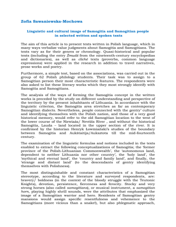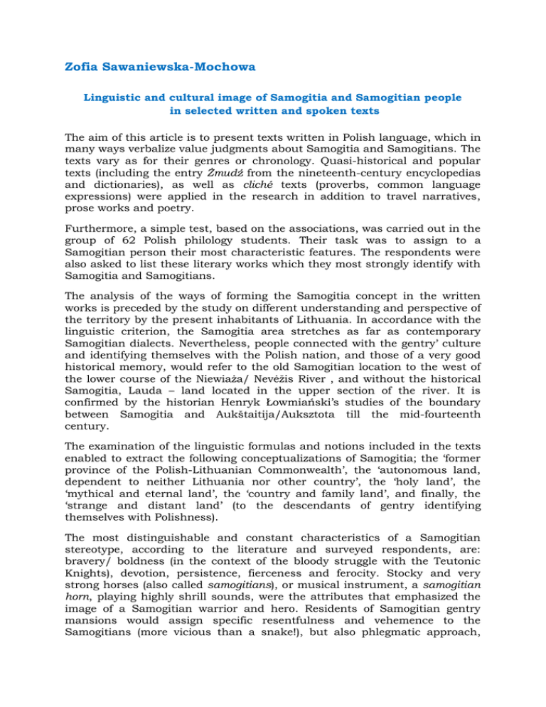 Zofia Sawaniewska-Mochowa Linguistic and cultural image of Samogitia and Samogitian people in selected written and spoken texts The aim of this article is to present texts written in Polish language, which in many ways verbalize value judgments about Samogitia and Samogitians. The texts vary as for their genres or chronology. Quasi-historical and popular texts (including the entry Żmudź from the nineteenth-century encyclopedias and dictionaries), as well as cliché texts (proverbs, common language expressions) were applied in the research in addition to travel narratives, prose works and poetry. Furthermore, a simple test, based on the associations, was carried out in the group of 62 Polish philology students. Their task was to assign to a Samogitian person their most characteristic features. The respondents were also asked to list these literary works which they most strongly identify with Samogitia and Samogitians. The analysis of the ways of forming the Samogitia concept in the written works is preceded by the study on different understanding and perspective of the territory by the present inhabitants of Lithuania. In accordance with the linguistic criterion, the Samogitia area stretches as far as contemporary Samogitian dialects. Nevertheless, people connected with the gentry’ culture and identifying themselves with the Polish nation, and those of a very good historical memory, would refer to the old Samogitian location to the west of the lower course of the Niewiaża/ Nevėžis River , and without the historical Samogitia, Lauda – land located in the upper section of the river. It is confirmed by the historian Henryk Łowmiański’s studies of the boundary between Samogitia and Aukštaitija/Auksztota till the mid-fourteenth century. The examination of the linguistic formulas and notions included in the texts enabled to extract the following conceptualizations of Samogitia; the ‘former province of the Polish-Lithuanian Commonwealth’, the ‘autonomous land, dependent to neither Lithuania nor other country’, the ‘holy land’, the ‘mythical and eternal land’, the ‘country and family land’, and finally, the ‘strange and distant land’ (to the descendants of gentry identifying themselves with Polishness). The most distinguishable and constant characteristics of a Samogitian stereotype, according to the literature and surveyed respondents, are: bravery/ boldness (in the context of the bloody struggle with the Teutonic Knights), devotion, persistence, fierceness and ferocity. Stocky and very strong horses (also called samogitians), or musical instrument, a samogitian horn, playing highly shrill sounds, were the attributes that emphasized the image of a Samogitian warrior and hero. Residents of Samogitian gentry mansions would assign specific resentfulness and vehemence to the Samogitians (more vicious than a snake!), but also phlegmatic approach, simplicity and bluntness, and mental sluggishness. Surveyed students identified the Samogitians with the ethos of national struggle, the homeland defence and associated their characteristics with such works as The Teutonic Knights and The Deluge by Henryk Sienkiewicz and Grażyna by Adam Mickiewicz. Językowo-kulturowy wizerunek Żmudzi i Żmudzinów w wybranych tekstach pisanych i mówionych Celem tego artykułu było zaprezentowanie zróżnicowanych chronologicznie i gatunkowo tekstów w języku polskim, w których w różny sposób werbalizowane były sądy wartościujące o Żmudzi i Żmudzinach. Oprócz relacji typu podróżniczego, utworów prozatorskich i wierszowanych wykorzystane zostały do badań także teksty quasi-historyczne i popularnonaukowe (w tym hasło „Żmudź” w XIX-wiecznych encyklopediach i słownikach) oraz teksty kliszowane (przysłowia, utarte formuły językowe). Przeprowadzony został ponadto w grupie 62 studentów filologii polskiej prosty test „skojarzeniowy”, polegający na przypisaniu Żmudzinowi cech, zdaniem respondentów, najbardziej charakterystycznych. Ankietowani mieli też wskazać utwory literackie, które najmocniej kojarzą się im ze Żmudzią i Żmudzinami. Przegląd sposobów konceptualizacji Żmudzi w tekstach pisanych poprzedzono rozważaniami na temat różnego pojmowania zasięgu tej krainy przez obecnych mieszkańców Litwy. Według kryterium językoznawczego obszar Żmudzi pokrywa się ze współczesnym zasięgiem gwar żmudzkich. Jednak osoby związane z kulturą szlachecką, mające polską identyfikację narodową i bardzo głęboką pamięć historyczną, odwołują się do dawnej lokalizacji Żmudzi na zachód od dolnego biegu Niewiaży. Nie zaliczają tym samym do historycznej Żmudzi Laudy – krainy położonej w górnym odcinku tej rzeki, co znajduje potwierdzenie w badaniach historyka Henryka Łowmiańskiego nad przebiegiem granicy między Żmudzią i Auksztotą do połowy XIV wieku. Zbadanie formuł językowych i konceptów zawartych w tekstach pozwoliło wyodrębnić następujące konceptualizacje Żmudzi: ‘prowincja dawnej Rzeczypospolitej’, ‘kraina odrębna, autonomiczna względem Litwy i innych obszarów’, ‘ziemia święta’, ‘kraina mityczna i wieczna’, ‘ziemia rodzinna, oswojona’, ‘ziemia obca i daleka (dla potomków szlachty identyfikujących się z polskością)’. Najbardziej charakterystyczne i zarazem stabilne cechy w stereotypowym wizerunku Żmudzina to w świetle literatury i odpowiedzi ankietowanych: waleczność/dzielność (w kontekście krwawych zmagań z Krzyżakami), pobożność, upór, zawziętość, dzikość. Atrybutami podkreślającymi wizerunek Żmudzina wojownika i bohatera były konie krępe i bardzo wytrzymałe (nazywany także żmudzinami) oraz instrument muzyczny rożek żmudzki, wydający przeraźliwe dźwięki. Mieszkańcy dworów żmudzkich, przypisywali Żmudzinom szczególną jadowitość i zapiekłość (bardziej jadowici niż żmija!), ale też flegmatyczność, prostotę i nieokrzesanie oraz 