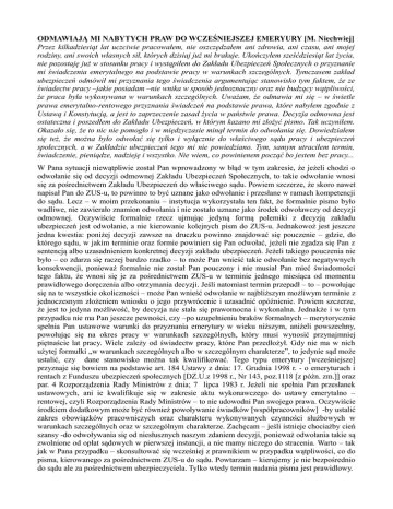 ODMAWIAJĄ MI NABYTYCH PRAW DO WCZEŚNIEJSZEJ EMERYURY [M. Niechwiej] Przez kilkadziesiąt lat uczciwie pracowałem, nie oszczędzałem ani zdrowia, ani czasu, ani mojej rodziny, ani swoich własnych sił, których dzisiaj już mi brakuje. Ukończyłem sześćdziesiąt lat życia, nie pozostaję już w stosunku pracy i wystąpiłem do Zakładu Ubezpieczeń Społecznych o przyznanie mi świadczenia emerytalnego na podstawie pracy w warunkach szczególnych. Tymczasem zakład ubezpieczeń odmówił mi przyznania tego świadczenia argumentując stanowisko tym faktem, że ze świadectw pracy –jakie posiadam –nie wnika w sposób jednoznaczny oraz nie budzący wątpliwości, że praca była wykonywana w warunkach szczególnych. Uważam, że odmawia mi się – w świetle prawa emerytalno-rentowego przyznania świadczeń na podstawie prawa, które nabyłem zgodnie z Ustawą i Konstytucją, a jest to zaprzeczenie zasad życia w państwie prawa. Decyzja odmowna jest ostateczna i poszedłem do Zakładu Ubezpieczeń, w którym kazano mi złożyć pismo. Tak uczyniłem. Okazało się, że to nic nie pomogło i w międzyczasie minął termin do odwołania się. Dowiedziałem się też, że można było odwołać się tylko i wyłącznie do właściwego sądu pracy i ubezpieczeń społecznych, a w Zakładzie ubezpieczeń tego mi nie powiedziano. Tym, samym utraciłem termin, świadczenie, pieniądze, nadzieję i wszystko. Nie wiem, co powinienem począć bo jestem bez pracy... W Pana sytuacji niewątpliwie został Pan wprowadzony w błąd w tym zakresie, że jeżeli chodzi o odwołanie się od decyzji odmownej Zakładu Ubezpieczeń Społecznych, to takie odwołanie wnosi się za pośrednictwem Zakładu Ubezpieczeń do właściwego sądu. Powiem szczerze, że skoro nawet napisał Pan do ZUS-u, to powinno to być uznane jako odwołanie i przesłane w ramach kompetencji do sądu. Lecz – w moim przekonaniu – instytucja wykorzystała ten fakt, że formalnie pismo było wadliwe, nie zawierało znamion odwołania i nie zostało uznane jako środek odwoławczy od decyzji odmownej. Oczywiście formalnie rzecz ujmując jedyną formą polemiki z decyzją zakładu ubezpieczeń jest odwołanie, a nie kierowanie kolejnych pism do ZUS-u. Jednakowoż jest jeszcze jedna kwestia: poniżej decyzji zawsze na druczku powinno znajdować się pouczenie – gdzie, do którego sądu, w jakim terminie oraz formie powinien się Pan odwołać, jeżeli nie zgadza się Pan z sentencją albo uzasadnieniem konkretnej decyzji zakładu ubezpieczeń. Jeżeli takiego pouczenia nie było – co zdarza się raczej bardzo rzadko – to może Pan wnieść takie odwołanie bez negatywnych konsekwencji, ponieważ formalnie nie został Pan pouczony i nie musiał Pan mieć świadomości tego faktu, że wnosi się je za pośrednictwem ZUS-u w terminie jednego miesiąca od momentu prawidłowego doręczenia albo otrzymania decyzji. Jeśli natomiast termin przepadł – to – powołując się na te wszystkie okoliczności – może Pan wnieść odwołanie w najbliższym możliwym terminie z jednoczesnym złożeniem wniosku o jego przywrócenie i uzasadnić opóźnienie. Powiem szczerze, że jest to jedyna możliwość, by decyzja nie stała się prawomocna i wykonalna. Jednakże i w tym przypadku nie ma Pan jeszcze pewności, czy –po uzupełnieniu braków formalnych – merytorycznie spełnia Pan ustawowe warunki do przyznania emerytury w wieku niższym, aniżeli powszechny, powołując się na okres pracy w warunkach szczególnych, który musi wynosić przynajmniej piętnaście lat pracy. Wiele zależy od świadectw pracy, które Pan przedłożył. Gdy nie ma w nich użytej formułki „w warunkach szczególnych albo w szczególnym charakterze”, to jedynie sąd może ustalić, czy dane stanowisko można tak kwalifikować. Tego typu emerytury [wcześniejsze] przyznaje się bowiem na podstawie art. 184 Ustawy z dnia: 17. Grudnia 1998 r. - o emeryturach i rentach z Funduszu ubezpieczeń społecznych [DZ.U.z 1998 r., Nr 143, poz.1118 [z późn. zm.]] oraz par. 4 Rozporządzenia Rady Ministrów z dnia; 7 lipca 1983 r. Jeżeli nie spełnia Pan przesłanek ustawowych, ani ie kwalifikuje się w zakresie aktu wykonawczego do ustawy emerytalno – rentowej, czyli Rozporządzenia Rady Ministrów – to nie udowodni Pan swojego prawa. Oczywiście środkiem dodatkowym może być również powoływanie świadków [współpracowników] -by ustalić zakres obowiązków pracowniczych oraz charakteru wykonywanych czynności służbowych w warunkach szczególnych oraz w szczególnym charakterze. Zachęcam – jeśli istnieje chociażby cień szansy -do odwoływania się od niesłusznych naszym zdaniem decyzji, ponieważ odwołania takie są zwolnione od opłat sądowych w pierwszej instancji, a nie mamy niczego do stracenia. Warto – tak jak w Pana przypadku – skonsultować się wcześniej z prawnikiem w przypadku wątpliwości, co do pisma, kierowanego za pośrednictwem ZUS-u do sądu. Powtarzam – kierujemy je nie bezpośrednio do sądu ale za pośrednictwem ubezpieczyciela. Tylko wtedy termin nadania pisma jest prawidłowy.