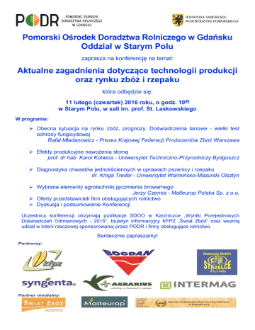 Pomorski Ośrodek Doradztwa Rolniczego w Gdańsku Oddział w Starym Polu zaprasza na konferencję na temat: Aktualne zagadnienia dotyczące technologii produkcji oraz rynku zbóż i rzepaku która odbędzie się: 11 lutego (czwartek) 2016 roku, o godz. 1000 w Starym Polu, w sali im. prof. St. Laskowskiego W programie: Obecna sytuacja na rynku zbóż, prognozy. Doświadczenia łanowe - wielki test ochrony fungicydowej Rafał Mładanowicz - Prezes Krajowej Federacji Producentów Zbóż Warszawa Efekty produkcyjne nawożenia słomą prof. dr hab. Karol Kotwica - Uniwersytet Techniczno-Przyrodniczy Bydgoszcz Diagnostyka chwastów jednoliściennych w uprawach pszenicy i rzepaku dr. Kinga Treder - Uniwersytet Warmińsko-Mazurski Olsztyn Wybrane elementy agrotechniki jęczmienia browarnego Jerzy Czernia - Malteurop Polska Sp. z o.o. Oferty przedstawicieli firm obsługujących rolnictwo Dyskusja i podsumowanie Konferencji Uczestnicy konferencji otrzymają publikacje SDOO w Karzniczce „Wyniki Porejestrowych Doświadczeń Odmianowych - 2015”, biuletyn informacyjny KFPZ „Świat Zbóż” oraz wezmą udział w loterii rzeczowej sponsorowanej przez PODR i firmy obsługujące rolnictwo. Serdecznie zapraszamy!