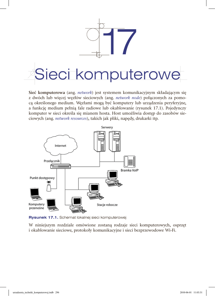 17 Sieci komputerowe Sieć komputerowa (ang. network) jest systemem komunikacyjnym składającym się z dwóch lub więcej węzłów sieciowych (ang. network node) połączonych za pomocą określonego medium. Węzłami mogą być komputery lub urządzenia peryferyjne, a funkcję medium pełnią fale radiowe lub okablowanie (rysunek 17.1). Pojedynczy komputer w sieci określa się mianem hosta. Host umożliwia dostęp do zasobów sieciowych (ang. network resources), takich jak pliki, napędy, drukarki itp. Rysunek 17.1. Schemat lokalnej sieci komputerowej W niniejszym rozdziale omówione zostaną rodzaje sieci komputerowych, osprzęt i okablowanie sieciowe, protokoły komunikacyjne i sieci bezprzewodowe Wi-Fi. urzadzenia_techniki_komputerowej.indb 296 2010-06-01 11:03:31 17.2. Fizyczne topologie sieci 17.1. Rodzaje sieci komputerowych Jednym z kryteriów podziału sieci komputerowych jest wielkość obszaru, na którym się znajdują: qq L AN (ang. Local Area Network — sieci lokalne). Najprostszy rodzaj sieci, na którą składają się komputery znajdujące się w obrębie jednego budynku, biura czy mieszkania. qq W AN (ang. Wide Area Network — sieci rozległe). Połączenie kilku sieci LAN za pomocą łączy światłowodowych, satelitarnych lub szybkich łączy dzierżawionych. qq I nternet. Internet to w rzeczywistości wiele sieci WAN, z których każda komunikuje się z innymi za pomocą protokołu TCP/IP. Użytkownicy korzystają z internetu przy użyciu programów takich jak przeglądarki WWW, klienty FTP, komunikatory itp. Coraz popularniejsze jest stosowanie mechanizmów internetu w sieciach lokalnych. W zależności od tego, czy dane w sieci są dostępne wyłącznie w jej obrębie, czy w jakimś zakresie udostępniane publicznie, wyróżniamy: qq I ntranet. Jest to zespół sieci lokalnych jednej firmy, w których węzłach zainstalowano oprogramowanie działające zazwyczaj w internecie (serwery: WWW, FTP, POP3, SMTP). Dostęp do zasobów ma grono upoważnionych przez firmę użytkowników. qq E xtranet. Odmiana intranetu, w której do części danych mają również dostęp osoby spoza organizacji. UWAGA Przykładowo intranet może zostać zainstalowany w kancelarii prawniczej, gdzie jeden z prawników ma za zadanie śledzić zmiany w prawie i opracowywać materiały dla pozostałych pracowników. Przygotowane konspekty publikuje za pomocą strony WWW zainstalowanej na serwerze WWW działającym w sieci lokalnej. Pozostali pracownicy mają dostęp do materiałów za pomocą przeglądarki internetowej. Przykładem extranetu będzie intranet hurtowni sprzętu komputerowego. Część danych udostępniana jest klientom, którzy po uwierzytelnieniu mogą sprawdzić przez internet dostępność i ceny sprzedawanego sprzętu. 17.2. Fizyczne topologie sieci Komputery połączone w sieci mogą wykorzystywać do wymiany danych różnego rodzaju media: okablowanie koncentryczne, skrętkę, światłowody czy fale radiowe. Fizyczny układ połączeń hostów w sieci określa się mianem topologii sieci (ang. network topology). Najważniejsze topologie fizyczne to: qq topologia magistrali (ang. bus topology), qq topologia pierścienia (ang. ring topology), qq topologia gwiazdy (ang. star topology). 297 urzadzenia_techniki_komputerowej.indb 297 2010-06-01 11:03:32 Rozdział 17 t Sieci komputerowe 17.3. Typy sieci kablowych Przez kilkadziesiąt lat rozwoju sieci komputerowych powstało kilka technologii sieciowych, takich jak ARC-Net, Token Ring czy Ethernet, które różnią się szybkością pracy, rodzajem medium, typem osprzętu sieciowego, oprogramowaniem sieciowym. Każda technologia ma możliwości i ograniczenia, które rzutują na ewentualny wybór. 17.3.1. ARC-Net, Token Ring (IEEE 802.5), FDDI Jedną z przestarzałych technologii sieciowych jest ARC-Net wykorzystująca 98-omowe okablowanie koncentryczne RG-68 lub UTP/STP. Standard opracowany został na użytek terminali firmy IBM. Umożliwiał maksymalny transfer danych z prędkością 2,5, 10 Mb/s i jednoczesne połączenie 255 stacji roboczych. Technologia Token Ring (IEEE 802.5) została opracowana przez IBM. Do realizacji połączeń wykorzystuje się okablowanie typu UTP/STP lub światłowody. Maksymalnie można połączyć 260 hostów. Sieci Token Ring pozwalają na pracę z prędkościami 4, 16, a nawet 100 Mb/s. Obecnie zostały one wyparte przez standardy Fast i Gigabit Ethernet. FDDI (ang. Fibre Distributed Data Interface — złącze danych sieci światłowodowych) jest siecią komputerową budowaną na bazie fizycznego pierścienia z kabla światłowodowego1 i dodatkowo zabezpieczaną przez dublujący pierścień zapasowy. Technologię stosuje się najczęściej do budowy sieci szkieletowych, uniwersyteckich itp. Można połączyć do 500 węzłów na odcinku do 100 km. Ewolucją FDDI jest standard CDDI (ang. Copper Data Distribution Interface — złącze danych sieci miedzianych), wykorzystujący protokoły FDDI w sieciach z okablowaniem miedzianym UTP. 17.3.2. Ethernet (IEEE 802.3) Jeszcze 15 lat temu wybór między Token Ringiem a Ethernetem nie był prosty. Początkowe wersje Ethernetu 10Base-5 i 10Base-2 wykorzystywały kabel koncentryczny i miały szereg wad wynikających z budowy magistralowej. Sieci Token Ring pozbawione były typowych niedogodności związanych z topologią magistrali, ponieważ opierały się na koncepcji pierścienia logicznego i dodatkowo dysponowały większą przepustowością. Sytuacja zmieniła się, gdy na rynku pojawił się Fast Ethernet 100Base-TX, który wyparł wszystkie inne technologie. Standard Ethernet został opisany w dokumencie IEEE 802.3 obejmującym specyfikację okablowania i sygnalizacji. Pierwsze odmiany standardu — 10Base-2 i 10Base-5 — wykorzystywały okablowanie koncentryczne: Thin Ethernet (cienki Ethernet) i Thick Ethernet (gruby Ethernet) umożliwiające transfer półdupleksowy (więcej na ten temat w podrozdziale 17.4). Ko1 Światłowód to cienki prz