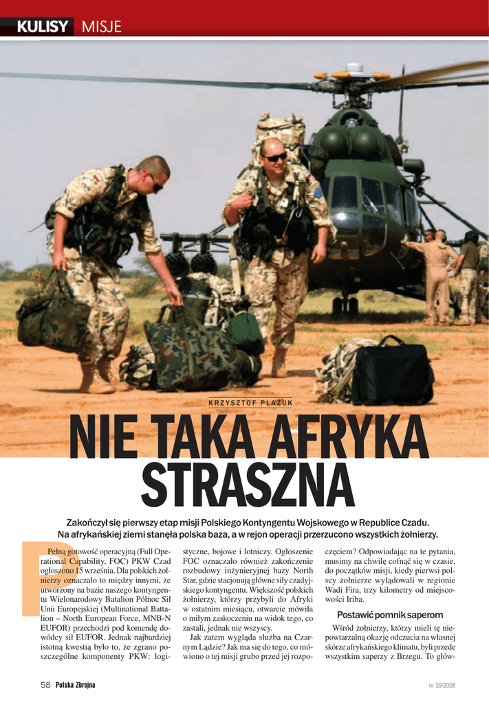 KULISY MISJE KRZYSZTOF PLAŻUK NIE TAKA AFRYKA STRASZNA Zakończył się pierwszy etap misji Polskiego Kontyngentu Wojskowego w Republice Czadu. Na afrykańskiej ziemi stanęła polska baza, a w rejon operacji przerzucono wszystkich żołnierzy. Pełną gotowość operacyjną (Full Operational Capability, FOC) PKW Czad ogłoszono 15 września. Dla polskich żołnierzy oznaczało to między innymi, że utworzony na bazie naszego kontyngentu Wielonarodowy Batalion Północ Sił Unii Europejskiej (Multinational Battalion – North European Force, MNB-N EUFOR) przechodzi pod komendę dowódcy sił EUFOR. Jednak najbardziej istotną kwestią było to, że zgrano poszczególne komponenty PKW: logi58 Polska Zbrojna styczne, bojowe i lotniczy. Ogłoszenie FOC oznaczało również zakończenie rozbudowy inżynieryjnej bazy North Star, gdzie stacjonują główne siły czadyjskiego kontyngentu. Większość polskich żołnierzy, którzy przybyli do Afryki w ostatnim miesiącu, otwarcie mówiła o miłym zaskoczeniu na widok tego, co zastali, jednak nie wszyscy. Jak zatem wygląda służba na Czarnym Lądzie? Jak ma się do tego, co mówiono o tej misji grubo przed jej rozpo- częciem? Odpowiadając na te pytania, musimy na chwilę cofnąć się w czasie, do początków misji, kiedy pierwsi polscy żołnierze wylądowali w regionie Wadi Fira, trzy kilometry od miejscowości Iriba. Postawić pomnik saperom Wśród żołnierzy, którzy mieli tę niepowtarzalną okazję odczucia na własnej skórze afrykańskiego klimatu, byli przede wszystkim saperzy z Brzegu. To głównr 39/2008 | | | | | | | | | ARMIE | | ŚWIATA ZAPIS FORUM NA CELOWNIKU WOJSKO PORADY PO SŁUŻBIE HISTORIA MILITARIA ŚWIAT PRASA KULISY TO I OWO KRZYSZTOF PLAŻUK 35 motogodzin rocznie. Podobnie było z innymi maszynami: UMI 9.5 przepracowała 550 motogodzin wobec 40 według norm w Polsce, koparka K-407C 202 motogodziny na 40. Również ciężarówki Iveco przekroczyły roczne normy, jeśli chodzi o przejechane kilometry – 4743 wobec 2700. To pokazuje, w jakim tempie, jak ogromnym nakładem sił pracowali nasi saperzy. Ważne jest także to, że sprzęt sprawował się naprawdę znakomicie przy temperaturach dochodzących do 53 stopni Celsjusza i pustynnych burzach, które wtłaczały piasek w każdy element maszyn. Utrzymanie sprawności sprzętu to w dużej mierze zasługa użytkowników, gdyż sami usuwali drobne awarie, nie czekając na części z kraju, bo tak naprawdę nie było na to czasu. Ci, którzy jeszcze mieszkali w namiotach i jedli posiłki podgrzewane w polowych kuchniach, doceniają pracę saperów. Wielu naszych żołnierzy uśmiecha się na wspomnienie kolegów z Brzegu i żartuje, że powinno się im wystawić pomnik w kraju za to, co zrobili. Pod wielkim wrażeniem rozbudowy inżynieryjnej polskiej bazy są wszyscy nie na ich barkach spoczęło zadanie wybudowania tymczasowej, a potem głównej bazy polskich sił w Czadzie. „To niesamowite uczucie – mieć świadomość, że tworzymy w jakiejś mierze historię, wznosząc pierwszy polski obóz w Afryce. Moi ludzie dali z siebie naprawdę wszystko”, wspomina kpt. Franciszek Książek, dowódca kompanii inżynieryjnej z Brzegu. Po zbilansowaniu czasu pracy poszczególnego sprzętu znajdującego się w wyposażeniu żołnierzy z 1 Brzeskiej Brygady Saperów okazało się, że każda z maszyn użytkowanych w Czadzie przez niespełna cztery miesiące znacznie przekroczyła roczne normy pracy obowiązujące w Polsce. I tak w przypadku spycharkoładowarki SŁ-34B liczba przepracowanych motogodzin to 600, podczas gdy w kraju wynosi jedynie nr 39/2008 JUŻ NIEBAWEM NASI ŻOŁNIERZE WEZMĄ UDZIAŁ W PIERWSZEJ OPERACJI POŁĄCZONEJ, W KTÓREJ BĘDĄ WSPÓŁDZIAŁAĆ Z KOLEGAMI Z INNYCH PAŃSTW. ZWIĘKSZY SIĘ LICZBA, ZAKRES ORAZ CZĘSTOTLIWOŚĆ PROWADZONYCH PATROLI przełożeni z dowództwa EUFOR oraz przedstawiciele ONZ-owskiej misji MINURCAT, której personel ma docelowo znaleźć się w North Star Camp. Żołnierze PKW Czad nie mają większych zastrzeżeń do wyposażenia osobistego i sprzętu, jakim dysponują. Owszem, wielu zakupiło oddychającą bieliznę czy zabrało dodatkowe koszulki. Jednak ostatecznie okazało się, że wojskowe należności pokrywają się z potrzebami naszego wojska w tym naprawdę ciężkim klimacie. Nie ma już także przedpotopowych jednorazowych golarek, pasty do zębów czy kremu do golenia nie do użycia. Jest za to całkiem dobra woda po goleniu, dziesięć opakowań nasączonych chusteczek – bardzo przydatnych do dezynfekcji rąk, duże opakowanie chusteczek higienicznych, fajny szampon do włosów czy mydełka antybakteryjne. Najwyższa zatem pora, by zaprzestać szukania dziury w całym i przyjąć do wiadomości, że „nasza firma” zadbała o swoich ludzi. Apteczka pierwszej pomocy ma świetne wyposażenie, jest poręczna i można ją zabrać ze sobą wszędzie bez obawy, że się rozleci. Są trzy komplety umundurowania, trzy pary dobrych, sprawdzonych w Iraku czy Afganistanie butów. Kiedy jeszcze przed wyjazdem na misję rozmawiałem z jednym z kolegów z Lublińca, który dopiero co wrócił z Afganistanu – chłopaki z tej jednostki są dla mnie autorytetami w zakresie sztuki przetrwania – usłyszałem, że w gorącym klimacie najlepiej sprawdzają się zwykłe bawełniane koszulki. Dostaliśmy kilka sztuk bawełnianych T-shirtów. Dobrze się noszą, podobnie jak bielizna osobista. Jest tylko jedna uwaga – koszulki koloru piaskowego z naramiennikami na dystynkcje mogłyby mieć zwykłe rzepy na przypięcie oznaczeń stopni, na przykład na piersi. To bardziej praktyczne. Z obserwacji oraz rozmów z naszymi sojusznikami biorącymi udział w operacji wynika, że w wielu przypadkach nasze wyposażenie osobiste jest dużo lepsze niż ich. Niektóre z nacji nie mają na przykład okularów przeciwsłonecznych, a nasze uvexy, choć dla niektórych zbyt duże (kwestia gustu), dobrze spełniają swoją rolę, szczeg