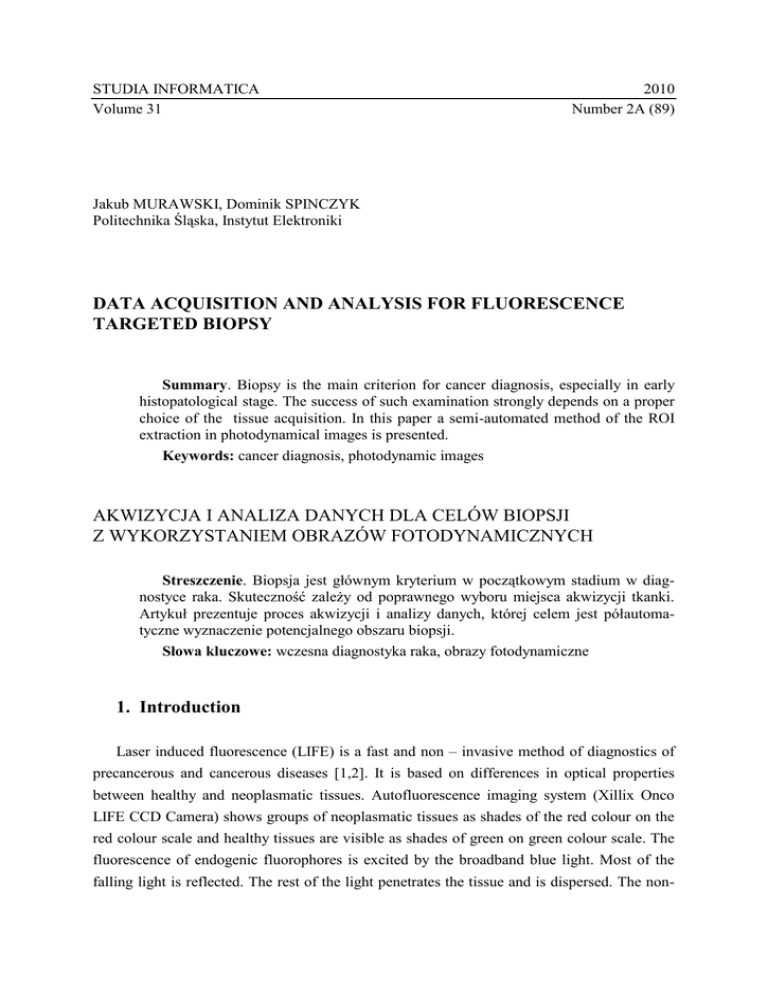 STUDIA INFORMATICA Volume 31 2010 Number 2A (89) Jakub MURAWSKI, Dominik SPINCZYK Politechnika Śląska, Instytut Elektroniki DATA ACQUISITION AND ANALYSIS FOR FLUORESCENCE TARGETED BIOPSY Summary. Biopsy is the main criterion for cancer diagnosis, especially in early histopatological stage. The success of such examination strongly depends on a proper choice of the tissue acquisition. In this paper a semi-automated method of the ROI extraction in photodynamical images is presented. Keywords: cancer diagnosis, photodynamic images AKWIZYCJA I ANALIZA DANYCH DLA CELÓW BIOPSJI Z WYKORZYSTANIEM OBRAZÓW FOTODYNAMICZNYCH Streszczenie. Biopsja jest głównym kryterium w początkowym stadium w diagnostyce raka. Skuteczność zależy od poprawnego wyboru miejsca akwizycji tkanki. Artykuł prezentuje proces akwizycji i analizy danych, której celem jest półautomatyczne wyznaczenie potencjalnego obszaru biopsji. Słowa kluczowe: wczesna diagnostyka raka, obrazy fotodynamiczne 1. Introduction Laser induced fluorescence (LIFE) is a fast and non – invasive method of diagnostics of precancerous and cancerous diseases [1,2]. It is based on differences in optical properties between healthy and neoplasmatic tissues. Autofluorescence imaging system (Xillix Onco LIFE CCD Camera) shows groups of neoplasmatic tissues as shades of the red colour on the red colour scale and healthy tissues are visible as shades of green on green colour scale. The fluorescence of endogenic fluorophores is excited by the broadband blue light. Most of the falling light is reflected. The rest of the light penetrates the tissue and is dispersed. The non- 314 J. Murawski, D. Spinczyk absorbed light passes the tissue. The energy dose of the absorbed light is re-emitted as fluorescence. The Xillix camera acquires two images: one of the green autofluorescence and the second one of the dispersed red light, reflected from the tissue. The image of the dispersed red light changes very little between healthy and pathological tissues while the green autofluorescence intensity decreases significantly. When a combined image is built, the colour changes in the pathological region [2, 3] (Fig. 2). 2. Methodology In this study a semi-automated analysis of photodynamic images is presented. The input data consist of the series of autofluorescence and fluorescence images, which have been acquired from Xillix Onco Life Systems. The aim of this programme is to analyse photodynamic images, captured and saved during patient examination, and mark the ROI. The advantages of the Onco LIFE system are of particular importance. They are real-time high resolution images in white and fluorescence modes of imaging, possibility of shifting from the white light imaging to fluorescence imaging with one button, ability of picture-inpicture viewing which enables simultaneous display of white light and fluorescence images. At the very beginning quantification of colour value is performed. Numerical Colour Value (NCV) is defined as the ratio of red to green colour components in each pixel [8]. Histogram [5] of the NCV matrix is displayed and can be used by a clinician to adjust the threshold value which allows to extract regions of interest. In the separate image a set of points corresponding to the selected regions is superimposed on the original image. Within the ROI the greatest value of the NCV is found and marked in the image. It shows the point of the probably highest histological stage to be confirmed by the histological procedure. The set of images is loaded from the database located on the local disk or on a remote server [4]. All images from this set are displayed and presented to the user, who can pick one of them for a detailed analysis. Such an analysis consists of following steps: Image loading, and initial calculations such as: calculating the NCV for each image pixel, finding the maximum of the NCV values within the whole image. After this step the NCV value of any image pixel in obtained by pointing it with the cursor on the Original Image tab (Fig 1). Calculating the grayscale representation of the image, which allows to adjust the threshold used for the background removal. This is done with a commonly used formula: Y 0,3 R 0,59 G 0,11 B (1) Data Acquisition and Analysis For Fluorescence Targeted Biopsy 315 where: R, G, B are colour components of the saturated image [9]. Background removal, performed using a simple threshold segmentation. Pixels for which the grayscale level is greater than a specified level are removed from the image. The background has to be removed because it is characterised by a high red to green ratio. The selection of the threshold is done manually by picking the intensity from a pixel selected on the boundary of the camera view. The result of this segmentation is presented on the separate tab in the application window. Extracting points in which the NCV value exceeds the value defined by a clinician according to case-dependent rules. The assumed level depends on the tissue and the disease, being called the critical value. A proper selection of this value may be confirmed by the classical biopsy examination. When using the programme a user can observe all four stages on the tab control placed in the main window of the application. In the first tab the original photodynamic image is presented where the NCV value and the pixel position can be tracked. Fig. 1. Application main window Rys. 1. Okno główne aplikacji The second tab presents the grayscale representation of the image. In this picture the value of the grayscale levels of separate pixels may be read. This representation is used only for the background removal. On the basis of this image a user can adjust the threshold value. The third and fourth tabs contain the original image with its background removed and the map of excessive the NCV values, drawn on the original image respectively. On this map five 316 J. Murawski, D. Spinczyk colours from dark blue to red mark 