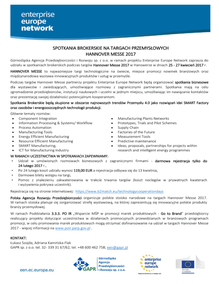 SPOTKANIA BROKERSKIE NA TARGACH PRZEMYSŁOWYCH HANNOVER MESSE 2017 Górnośląska Agencja Przedsiębiorczości i Rozwoju sp. z o.o. w ramach projektu Enterprise Europe Network zaprasza do udziału w spotkaniach brokerskich podczas targów Hannover Messe 2017 w Hanowerze w dniach 25 - 27 kwiecień 2017 r. HANNOVER MESSE to najważniejsze targi technologiczne na świecie, miejsce promocji nowinek branżowych oraz międzynarodowa wystawa innowacyjnych produktów i usług w przemyśle. Podczas targów Hannover Messe partnerzy projektu Enterprise Europe Network będą organizować spotkania biznesowe dla wystawców i zwiedzających, umożliwiające rozmowy z zagranicznymi partnerami. Spotkania mają na celu zgromadzenie przedsiębiorców, instytucji naukowych i uczelni w jednym miejscu, umożliwiając im nawiązanie kontaktów oraz prezentację swojej działalności potencjalnym kooperantom. Spotkania Brokerskie będą skupione w obszarze najnowszych trendów Przemysłu 4.0 jako rozwiązań idei SMART Factory oraz zasobów i energooszczędnych technologii produkcji. Główne tematy rozmów: Component Integration Information Processing & Systems/ Workflow Process Automation Manufacturing Tools Energy Efficient Manufacturing Resource Efficient Manufacturing SMART Manufacturing, ICT for Manufacturing Industry Manufacturing Plants Networks Prototypes, Trials and Pilot Schemes Supply Chain Factories of the Future Measurement Tools Predictive maintenance Ideas, proposals, partnerships for projects within research and intelligent energy programmes W RAMACH UCZESTNICTWA W SPOTKANIACH ZAPEWNIAMY: • Udział w umówionych rozmowach biznesowych z zagranicznymi firmami - darmowa rejestracja tylko do 24 lutego 2017 r., • Po 24 lutego koszt udziału wynosi 119,00 EUR a rejestracja odbywa się do 13 kwietnia, • Darmowe bilety wstępu na targi, • Pomoc z znalezieniu zakwaterowania w trakcie trwania targów (koszt noclegów w prywatnych kwaterach i wyżywienia pokrywa uczestnik). Rejestracja się na stronie internetowej: https://www.b2match.eu/technologycooperationdays Polska Agencja Rozwoju Przedsiębiorczości organizuje polskie stoisko narodowe na targach Hannover Messe 2017. W ramach stoiska planuje się zorganizować strefę wystawową, na której zaprezentują się innowacyjne polskie produkty branży przemysłowej. W ramach Poddziałania 3.3.3. PO IR „Wsparcie MŚP w promocji marek produktowych - Go to Brand” przedsiębiorcy realizujący projekty dotyczące uczestnictwa w działaniach promocyjnych przewidzianych w branżowych programach promocji, w celu promowania marek produktowych mogą otrzymać dofinansowanie na udział w targach Hannover Messe 2017 - więcej informacji na www.poir.parp.gov.pl . KONTAKT: Łukasz Szojda, Adriana Kamińska-Flak GAPR sp. z o.o. tel. 32- 339 31 67/62, tel. +48 600 462 758; [email protected] een.ec.europa.eu