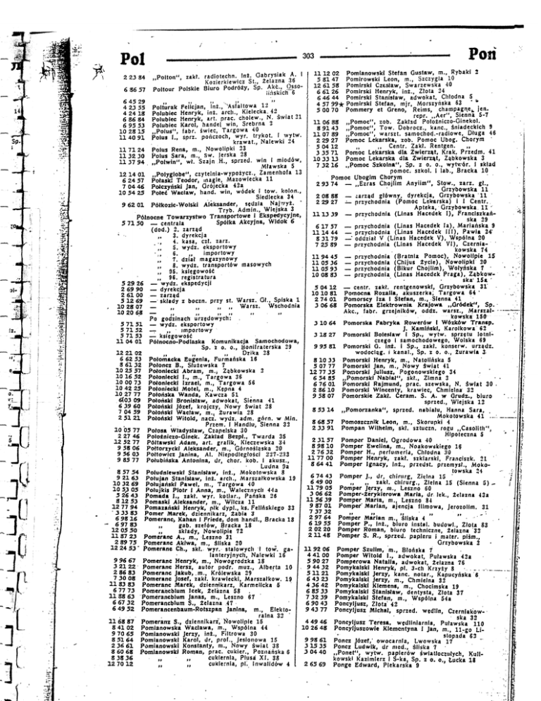 2 23 84 6 86 57 6 4 4 6 6 10 11 45 23 24 86 95 28 40 POI! 303 Pol „Polton", zakł. radiotechn. inż. Gabrysiak A. i Kozierkiewicz St., Żelazna 36 Poltour Polskie Biuro Podróży, Sp. Akc., Osso lińskich 6 29 55 Polturak 18 Polubiec 84 Poiubłec 53 Polubiec 15 „ P o l u s " , 91 Polus 1„ Pomianowski Stefan Gustaw, m., Rybaki 2 Pomirowski Leon, rn., Szczygła 10 Pomirski Czesław, Swarzewska 40 Pomirski Henryk, inż., Złota 24 Pomirski Stanisław, adwokat, Chłodna 5 Pomirski Stefan, mjr, Morszyńska 63 " Pommery et Greno, Reims, champagne jen. repr. ,,Aer", Sienna 5-7 11 06 88 „Pomoc", zob. Zakład Położniczo-Ginekol. „ P o m o c " , Tow. Dobrocz., kanc, Śniadeckich 8 91 43 11 07 89 „Pomoc", warszt. samochod.-radiowe, Długa 2 29 27 Pomoc Lekarska, zob. Pomoc Ubog. Chorym ,, Centr. Zakł. Rentgen. „ 5 04 12 3 35 71 Pomoc Lekarska dla Zwierząt, Krak. Przedm. 41 10 33 13 Pomoc Lekarska dla Zwierząt, Zabkowska 3 7 32 16 „Pomoc Szkolna", Sp. z o. o., wytwór, i skład pomoc, szkol. I lab., Bracka 10 Pomoc Ubogim Chorym 2 93 74 — „Ezras Chojlim Anyiim", Stow., zarz. gł., Grzybowska 11 2 08 88 — narząd główny, dyrekcja, Grzybowska 11 2 29 27 — przychodnia (Pomoc Lekarska) i I Centr. Apteka, Grzybowska 11 •' 1113 39 — przychodnia (Linas Hacedek I ) , Franciszkań ska 29 6 17 57 — przychodnia (Linas Hacedek la), Mariańska 9 1114 44 — przychodnia (Linas Hacedek I I I ) , Pawia 24* 8 31 79 —* oddział V (Linas Hacedek V), Wspólna 20 7 25 89 — przychodnia (Linas Hacedek V I ) , Czernia kowska 74 11 94 45 — przychodnia (Bratnia Pomoc), Nowolipie 15 11 05 36 — przychodnia (Chijus życie), Nowolipki 20 11 05 93 — przychodnia (Bikur Chojlim), Wołyńska 7 10 08 83 — przychodnia (Linas Hacedek Praga), Zabkow ska- 15a ' 5 04 12 — centr. zakł. rentgenowski, Grzybowska 31 10 10 81 Pomocna Rozalia, akuszerka; Targowa 64 * 2 74 01 Pomorscy Iza 1 Stefan, m., Sienna 41 3 06 68 Pomorska Elektrownia Krajowa „Gródek", Sp. A k c , fabr. grzejników, oddz. warsz., Marszał kowska 15fr Pomorska Fabryka Rowerów I Wózków Transp. 3 10 64 J. Kamiński, Karolkowa 62 3 18 27 Pomorski Bolesław 1 Sp., wytw. sprzętu lotni czego i samochodowego, Wolska 69 9 95 81 Pomorski G. inż. i Sp., zakł. konserw, urządź. wodociąg, i kanał., Sp. z o. o., Żurawia 3 8 10 33 Pomorski Henryk, m., Natolinska 5 5 07 77 Pomorski Jan, m., Nowy świat 41 12 77 35 Pomorski Juliusz, Pogonowskiego 34 6 54 85 „Pomorski Nabiał", skł., Zimna 3 6 76 01 Pomorski Rajmund, prac szewska, N. świat 30 2 36 10 Pomorski Wincenty, krawiec, Chmielna 32 9 58 07 Pomorskie Zakł. Ceram. S. A. w Orudz., biuro sprzed., Wiejska 12 3 53 14 „Pomorzanka", sprzed, nabiału, Hanna Sara, Mokotowska 41 '.. 8 68 57 Pomoszcznik Leon, m., Skorupki 4 2 33 91 Pompan Wilhelm, skł. sztuczn. rogu „Casolith", Hipoteczna 5 2 3157 Pomper Danie), Ogrodowa 40 8 98 10 Pomper Ewelina, m., Noakowskiego 16 2 76 32 Pomper H., perfumeria, Chłodna 30 11 77 00 Pomper Henryk, zakł. szklarski, Franciszk. 21 8 64 41 Pomper Ignacy, inż., przedst. przemysł., Moko towska 24 6 74 43 Pomper J., dr, chirurg, Zielna 15 ' 6 49 00 ,, zakł. chirurg., Zielna 15 (Sienna 5 ) . 11 79 05 Pomper Jerzy, m., Leszno 60 3 06 62 Pomper-żerykierowa Maria, dr lek., żelazna 43a 11 56 39 Pomper Maria, m., Leszno 84 9 87 01 Pomper" Marian, ajencja filmowa, Jerozolim. 31 7 37 32 2 97 64 Pomper Marian m., śliska 4 6 19 55 Pomper P., Inż., biuro instal. budowl., Złota 83 2 02 20 Pomper Roman, biuro techniczne, Żelazna 32 21148 Pomper S. R., sprzed, papieru i mater. piśm., Grzybowska 2 11 92 06 Pomper Szulłm, m., Błońska 7 4 41 00 Pomper Witold I . , adwokat, Puławska 42a 5 90 27 Pomperowa Natalia, adwokat, żelazna 76 9 44 32 Pomykalskl Henryk, pl. 3-ch Krzyży 8 ...... 5 1 1 21 PomykalskI Jerzy, kanc notar., Kapucyńska 6 6 43 23 Pomykalskl. Jerzy, m., Chmielna 32 4 36 42 Pomykalskl Klemens, m., Chocimska 19 6 85 33 Pomykalskl Stanisław, dentysta, Złota 37 7 32 39 Pomykalskl Stefan, m., Wspólna 54a 6 90 43 Poncyljusz, Złota 42 9 43 77 Poncyljusz Michał, sprzed, wędlin, Czerniaków-11 5 12 6 6 4 5 Felicjan, inż., Asfaltowa 12 Henryk, inż. arch., Kielecka 42 Henryk, art. prac. cholew., N. bwiat 21 Karol, handel win, Srebrna 2 fabr. świec, Targowa 40 sprz. pończoch, wyr. trykot. I wytw krawat., Nalewki 24 Połus Rena,, m . , Nowolipki 23 11 71 24 11 32 30 Polus Sara, m . , sw. ferska 28 11 37 94 „Polwin", wł. Szajn H., sprzed win i miodów Mławska 5 12 14 01 „Polyglobe", czytelnia-wypożycz., Zamenhofa 13 6 24 57 Połaski Teodor, magle, Mazowiecka 11 7 04 46 Połczyński Jan, Grójecka 42a 10 54 25 Połeć Wacław, hand. win, wódek i tow. kolon. Siedlecka 34 9 62 01 Półkozic-Wolski Aleksander, sędzia Najr/yż. Tryb. Admin., Wiejska 3 Północne Towarzystwo Transportowe I Ekspedycyjne 5 71 50 — centrala Spółka Akcyjna, Widok 6 (dod.) 2. zarząd „ 3. dyrekcja ., 4. kasa, czł. zarz. 5. wydz. eksportowy •., 6. ,, importowy ,, 7. dział magazynowy ,, 8. wydz. transportów masowych „ 05. księgowość ,, 96. registratura 5 29 26 — wydz. ekspedycji 2 69 90 — dyrekcja 2 61 00 — zarząd 5 12 69 — składy z boczn. przy st. Warsz. Gł., Spiska 1 10 28 07 .. „ ,, Warsz. Wschodnia 10 20 68 — Po godzinach urzędowych: . 5 71 51 — wydz. eksportowy 5 7152 —,, importowy 5 71 53 — księgowość 11 04 01 Północno-Podlaska Komunikacja Samochodowa, Sp. Z o. o., Bonifraterska 29 12 21 02 „ „ „ Dzika 28 6 62 53 Połomacka Eugenia, Furmańska 16 8 61 32 Połoncz B., Służewska 7 10 25 57 Połonłeckł Abram, m.* Zabkowska 2 10 16 52 Połonleckl I . , m., Targowa 36 10 00 73 Połonleckl Izrael, m., Targowa 56 10 42 25 PołonieckI Motel, m., Kępna 4 10 27 77 Połońska Wanda, Kawcza 51 6(03 09 Połoński Bronisław, adwokat, Sienna 41 €39 60 Połoński Józef, krojczy, Nowy świat 28 7 04 59 Połoński Wacław, m. żurawia 28 2 5 1 2 1 Połoński Witold, nacz. wydz. adm. górn. w Min. Przem. I Han