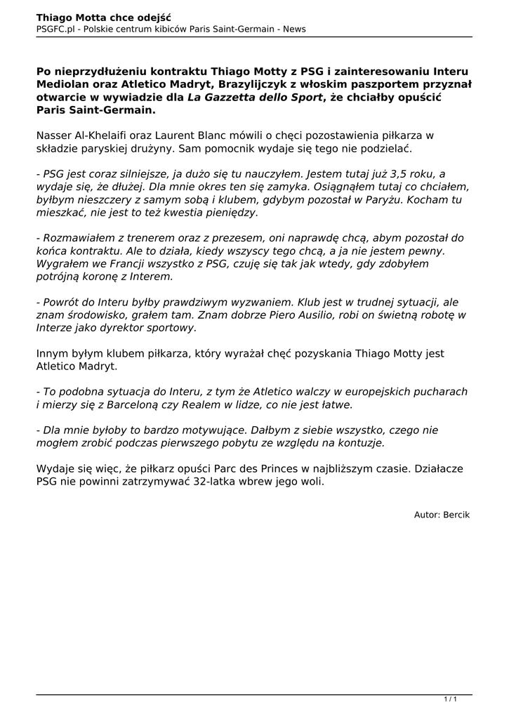 Thiago Motta chce odejść PSGFC.pl - Polskie centrum kibiców Paris Saint-Germain - News Po nieprzydłużeniu kontraktu Thiago Motty z PSG i zainteresowaniu Interu Mediolan oraz Atletico Madryt, Brazylijczyk z włoskim paszportem przyznał otwarcie w wywiadzie dla La Gazzetta dello Sport, że chciałby opuścić Paris Saint-Germain. Nasser Al-Khelaifi oraz Laurent Blanc mówili o chęci pozostawienia piłkarza w składzie paryskiej drużyny. Sam pomocnik wydaje się tego nie podzielać. - PSG jest coraz silniejsze, ja dużo się tu nauczyłem. Jestem tutaj już 3,5 roku, a wydaje się, że dłużej. Dla mnie okres ten się zamyka. Osiągnąłem tutaj co chciałem, byłbym nieszczery z samym sobą i klubem, gdybym pozostał w Paryżu. Kocham tu mieszkać, nie jest to też kwestia pieniędzy. - Rozmawiałem z trenerem oraz z prezesem, oni naprawdę chcą, abym pozostał do końca kontraktu. Ale to działa, kiedy wszyscy tego chcą, a ja nie jestem pewny. Wygrałem we Francji wszystko z PSG, czuję się tak jak wtedy, gdy zdobyłem potrójną koronę z Interem. - Powrót do Interu byłby prawdziwym wyzwaniem. Klub jest w trudnej sytuacji, ale znam środowisko, grałem tam. Znam dobrze Piero Ausilio, robi on świetną robotę w Interze jako dyrektor sportowy. Innym byłym klubem piłkarza, który wyrażał chęć pozyskania Thiago Motty jest Atletico Madryt. - To podobna sytuacja do Interu, z tym że Atletico walczy w europejskich pucharach i mierzy się z Barceloną czy Realem w lidze, co nie jest łatwe. - Dla mnie byłoby to bardzo motywujące. Dałbym z siebie wszystko, czego nie mogłem zrobić podczas pierwszego pobytu ze względu na kontuzje. Wydaje się więc, że piłkarz opuści Parc des Princes w najbliższym czasie. Działacze PSG nie powinni zatrzymywać 32-latka wbrew jego woli. Autor: Bercik 1/1 Powered by TCPDF (www.tcpdf.org)