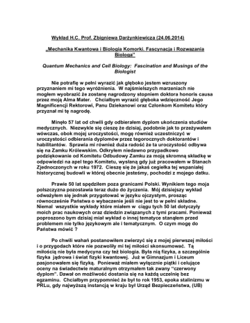 Wykład H.C. Prof. Zbigniewa Darżynkiewicza (24.06.2014) „Mechanika Kwantowa i Biologia Komorki. Fascynacja i Rozwazania Biologa” Quantum Mechanics and Cell Biology: Fascination and Musings of the Biologist Nie potrafię w pełni wyrazić jak głęboko jestem wzruszony przyznaniem mi tego wyróżnienia. W najśmielszych marzeniach nie mogłem wyobrazić że zostanę nagrodzony stopniem doktora honoris causa przez moją Alma Mater. Chciałbym wyrazić głęboka wdzięczność Jego Magnificencji Rektorowi, Panu Dziekanowi oraz Członkom Komitetu który przyznał mi tę nagrodę. Minęło 57 lat od chwili gdy odbierałem dyplom ukończenia studiów medycznych. Niezwykle się cieszę że dzisiaj, podobnie jak to przeżywałem wówczas, obok mojej uroczystości, mogę również uczestniczyć w uroczystości odbierania dyplomów przez tegorocznych doktorantów i habilitantów. Sprawia mi również duża radość że ta uroczystość odbywa się na Zamku Królewskim. Odkryłem niedawno przypadkowo podziękowanie od Komitetu Odbudowy Zamku za moją skromną składkę w odpowiedzi na apel tego Komitetu, wysłaną gdy już pracowałem w Stanach Zjednoczonych w roku 1972. Cieszę się że jakaś cegiełka tej wspaniałej historycznej budowli w której obecnie jesteśmy, pochodzi z mojego datku. Prawie 50 lat spędziłem poza granicami Polski. Wynikiem tego moja polszczyzna pozostawia teraz dużo do życzenia. Mój dzisiejszy wykład odważyłem się jednak przygotować w języku ojczystym, prosząc równocześnie Państwa o wybaczenie jeśli nie jest to w pełni składne. Niemal wszystkie wykłady które miałem w ciągu tych 50 lat dotyczyły moich prac naukowych oraz dziedzin związanych z tymi pracami. Ponieważ poproszono bym dzisiaj miał wykład o innej tematyce stanąłem przed problemem nie tylko językowym ale i tematycznym. O czym mogę do Państwa mówić ? Po chwili wahań postanowiłem zwierzyć się z mojej pierwszej miłości i o przygodach które nie pozwoliły mi tej miłości skonsumować. Tą miłością nie była medycyna czy też biologia. Była nią fizyka, a szczególnie fizyka jądrowa i świat fizyki kwantowej. Już w Gimnazjum i Liceum pasjonowałem się fizyką. Ponieważ miałem wyłącznie piątki i celujące oceny na świadectwie maturalnym otrzymałem tak zwany “czerwony dyplom”. Dawał on możliwość dostania się na każdą uczelnię bez egzaminu. Chciałbym przypomnieć że był to rok 1953, epoka stalinizmu w PRLu, gdy najwyższą instancją w kraju był Urząd Bezpieczeństwa, (UB) później przemianowany na Służbę Bezpieczeństwa (SB). Mając czerwony dyplom zgłosiłem się na Uniwersytet Warszawski składając podanie na Wydział Fizyki. Pierwsza komisja przez którą miałem przejść była tak zwaną komisją społeczną. Po otworzeniu mojego pliku przewodniczący komisji wrzucił moje podanie do kosza na śmiecie oświadczając ze jestem wrogiem PRLu i nie ma dla mnie miejsca na żadnej uczelni. Ze świadomością posiadania “wilczego biletu” wróciłem załamany do domu. Miałem jednak szczęście gdyż dyrektorka szkoły chciała mi pomóc. W jakiś sposób udało się jej dostać do mojej kartoteki z UB w której znalazła donos że rwałem i ostentacyjnie deptałem propagandowe ulotki obchodu rocznicy Rewolucji Październikowej. Nie była to prawda. Udało się jej usunąć ten donos. Był to już listopad i jedyną uczelnią która miała dodatkowe otwarcia była Akademia Medyczna, jak wówczas zwano Warszawski Uniwersytet Medyczny. Otwarcia były na Wydział Sanitarno-Higieniczny, jako ze PRL został zobowiązany do zabezpieczenia służby medycznej w wojsku Paktu Warszawskiego i należało zwiększyć ilość otwarć na Akademię Medyczną. I tak pozostałem na studiach medycznych w obawie że gdybym chciał zmienić uczelnię, moje kartoteki z UB-ecji mogą się odnaleźć. Możliwość studiowania na wyższej uczelni a więc i honor który dziś otrzymuję zawdzięczam dyrektorce mego Gimnazjum/Liceum, świętej pamięci Profesor Reginie Uszyńskiej. Wspominam o moich przygodach w dostaniu się na studia by przypomnieć Państwu owe odległe czasy i jak sytuacja sie zmieniła gdy Polska odzyskała niepodległość. Wspominam wspaniałych wykładowców Akademii Medycznej dzięki którym zacząłem odkrywać dziedziny nauk podstawowych i medycznych . Na pierwszych latach pasjonowałem się wykładami Profesora Kapuścińskiego który wykładał Fizykę, Wierzchowskiego – Chemię Nieorganiczną oraz Bowkiewicza który wykładał Biologię. Ten ostatni przemycał zabronione wówczas przez katedrę marksizmu i lenininizmu informacje o postępach w genetyce jak również w innych dziedzinach biologii jeśli miały one miejsce na Zachodzie a nie w Związku Radzieckim. Ze wzruszeniem wspominam wykłady nestorów nauk medycznych których miałem szczęście usłyszeć, Profesorów: Ostrowskiego z Histologii i Embriologii, Hellera z Chemii Fizjologicznej, Czubalskiego z Fizjologii, Paszkiewicza z Anatomii Patologicznej czy też Mikulaszka z Mikrobiologii. Również Profesor Sylwanowicz był doskonałym wykładowcą anatomii i jego cudowne rysunki z pamięci podczas wykładów mogły konkurować z atlasem Nettera. Tym wspaniałym wykładowcom zawdzięczam wykształcenie które dało mi podstawy by być dzisiaj tutaj i odebrać ten honor. Zagłębienie się w pracę naukową, którą rozpocząłem jako student w kółkach naukowych najpierw Zakładu Mikrobiologii, później Histologii a następnie kontynuacja pracy naukowej gdy rozpocząłem studia doktoranckie, jeszcze bardziej zbliżyły mnie do mojej drugiej miłości, którą stała się biologia komórki. Chciałem tutaj podkreślić rolę Profesora Ostrowskiego oraz Profesora Kawiaka, którzy wprowadzili mnie w swiat biologii komórki oraz dali podstawy zasad prowadzenia badań naukowych. Zagłębienie się w nauki biologiczne nie zmniejszyło mojej pierwszej miłości którą niestety