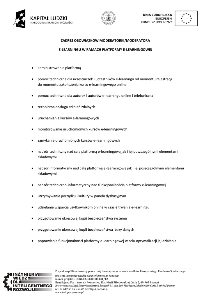 ZAKRES OBOWIĄZKÓW MODERATORKI/MODERATORA E-LEARNINGU W RAMACH PLATFORMY E-LEARNINGOWEJ administrowanie platformą pomoc techniczna dla uczestniczek i uczestników e-learningu od momentu rejestracji do momentu zakończenia kursu e-learningowego online pomoc techniczna dla autorek i autorów e-learningu online i telefoniczna techniczna obsługa szkoleń zdalnych uruchamianie kursów e-leraningowych monitorowanie uruchomionych kursów e-learningowych zamykanie uruchomionych kursów e-learningowych nadzór techniczny nad całą platformą e-learningową jak i jej poszczególnymi elementami składowymi nadzór informatyczny nad całą platformą e-learningową jak i jej poszczególnymi elementami składowymi nadzór techniczno-informatyczny nad funkcjonalnością platformy e-learningowej utrzymywanie porządku i kultury w panelu dyskusyjnym udzielanie wsparcia użytkownikom online w czasie trwania e-learningu przygotowanie okresowej kopii bezpieczeństwa systemu przygotowanie okresowej kopii bezpieczeństwa bazy danych poprawianie funkcjonalności platformy e-learningowej w celu optymalizacji jej działania Projekt współfinansowany przez Unię Europejską w ramach środków Europejskiego Funduszu Społecznego projekt: Inżynieria wiedzy dla inteligentnego rozwoju numer projektu: POKL.04.03.00-00-131/12 Beneficjent: POLITECHNIKA POZNAŃSKA, Plac Marii Skłodowskiej-Curie 5, 60-965 Poznań BIURO PROJEKTU: Dział Spraw Naukowych, budynek B1, pok. 209, Plac Marii Skłodowskiej-Curie 5, 60-965 Poznań tel. 61 647 58 95, e-mail: [email protected] www.iwir.put.poznan.pl