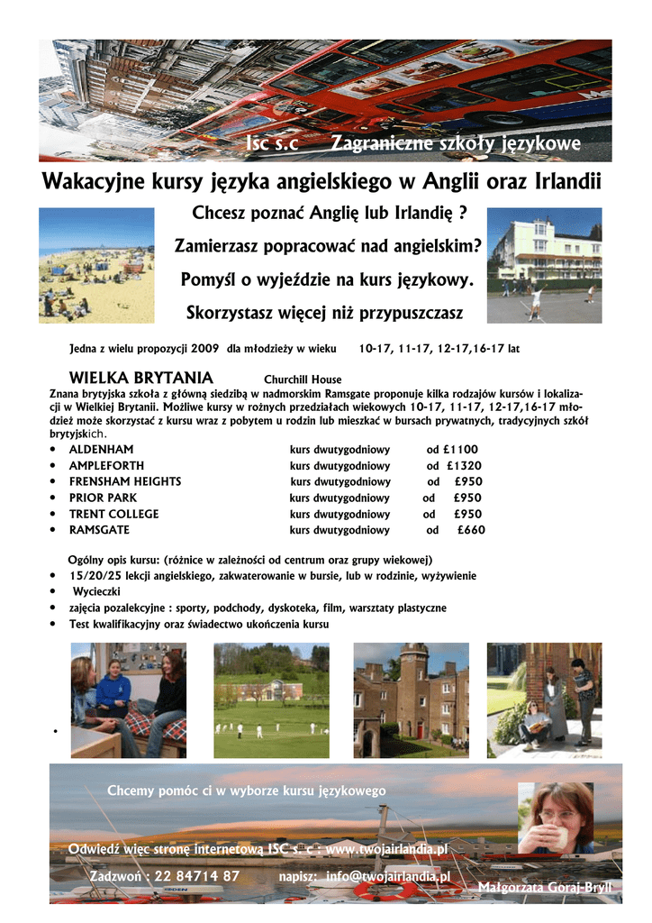 H E W L E T T - P A C K A R D Isc s.c Zagraniczne szkoły językowe Wakacyjne kursy języka angielskiego w Anglii oraz Irlandii Chcesz poznać Anglię lub Irlandię ? Zamierzasz popracować nad angielskim? Pomyśl o wyjeździe na kurs językowy. Skorzystasz więcej niż przypuszczasz Jedna z wielu propozycji 2009 dla młodzieży w wieku 10-17, 11-17, 12-17,16-17 lat WIELKA BRYTANIA Churchill House Znana brytyjska szkoła z główną siedzibą w nadmorskim Ramsgate proponuje kilka rodzajów kursów i lokalizacji w Wielkiej Brytanii. Możliwe kursy w rożnych przedziałach wiekowych 10-17, 11-17, 12-17,16-17 młodzież może skorzystać z kursu wraz z pobytem u rodzin lub mieszkać w bursach prywatnych, tradycyjnych szkół brytyjskich. • ALDENHAM kurs dwutygodniowy od £1100 • AMPLEFORTH kurs dwutygodniowy od £1320 • FRENSHAM HEIGHTS kurs dwutygodniowy od £950 • PRIOR PARK kurs dwutygodniowy od £950 • TRENT COLLEGE kurs dwutygodniowy od £950 • RAMSGATE kurs dwutygodniowy od £660 • • • • Ogólny opis kursu: (różnice w zależności od centrum oraz grupy wiekowej) 15/20/25 lekcji angielskiego, zakwaterowanie w bursie, lub w rodzinie, wyżywienie Wycieczki zajęcia pozalekcyjne : sporty, podchody, dyskoteka, film, warsztaty plastyczne Test kwalifikacyjny oraz świadectwo ukończenia kursu . Chcemy pomóc ci w wyborze kursu językowego Odwiedź więc stronę internetową ISC s. c : www.twojairlandia.pl Zadzwoń : 22 84714 87 napisz: [email protected] Tel.: 555 55 55 Faks: 555 55 55 E-mail: [email protected] Małgorzata Goraj-Bryll