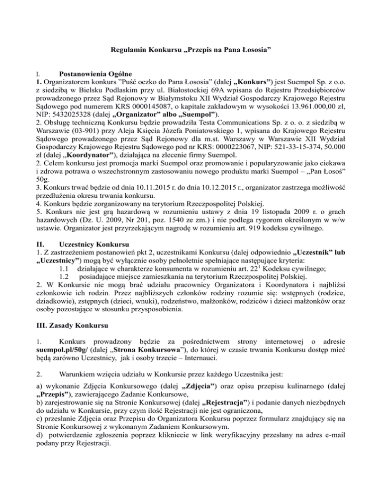 Regulamin Konkursu „Przepis na Pana Łososia” Postanowienia Ogólne 1. Organizatorem konkurs ”Puść oczko do Pana Łososia” (dalej „Konkurs”) jest Suempol Sp. z o.o. z siedzibą w Bielsku Podlaskim przy ul. Białostockiej 69A wpisana do Rejestru Przedsiębiorców prowadzonego przez Sąd Rejonowy w Białymstoku XII Wydział Gospodarczy Krajowego Rejestru Sądowego pod numerem KRS 0000145087, o kapitale zakładowym w wysokości 13.961.000,00 zł, NIP: 5432025328 (dalej „Organizator” albo „Suempol”). 2. Obsługę techniczną Konkursu będzie prowadziła Testa Communications Sp. z o. o. z siedzibą w Warszawie (03-901) przy Aleja Księcia Józefa Poniatowskiego 1, wpisana do Krajowego Rejestru Sądowego prowadzonego przez Sąd Rejonowy dla m.st. Warszawy w Warszawie XII Wydział Gospodarczy Krajowego Rejestru Sądowego pod nr KRS: 0000223067, NIP: 521-33-15-374, 50.000 zł (dalej „Koordynator”), działająca na zlecenie firmy Suempol. 2. Celem konkursu jest promocja marki Suempol oraz promowanie i popularyzowanie jako ciekawa i zdrowa potrawa o wszechstronnym zastosowaniu nowego produktu marki Suempol – „Pan Łosoś” 50g. 3. Konkurs trwać będzie od dnia 10.11.2015 r. do dnia 10.12.2015 r., organizator zastrzega możliwość przedłużenia okresu trwania konkursu. 4. Konkurs będzie zorganizowany na terytorium Rzeczpospolitej Polskiej. 5. Konkurs nie jest grą hazardową w rozumieniu ustawy z dnia 19 listopada 2009 r. o grach hazardowych (Dz. U. 2009, Nr 201, poz. 1540 ze zm.) i nie podlega rygorom określonym w w/w ustawie. Organizator jest przyrzekającym nagrodę w rozumieniu art. 919 kodeksu cywilnego. I. II. Uczestnicy Konkursu 1. Z zastrzeżeniem postanowień pkt 2, uczestnikami Konkursu (dalej odpowiednio „Uczestnik” lub „Uczestnicy”) mogą być wyłącznie osoby pełnoletnie spełniające następujące kryteria: 1.1 działające w charakterze konsumenta w rozumieniu art. 221 Kodeksu cywilnego; 1.2 posiadające miejsce zamieszkania na terytorium Rzeczpospolitej Polskiej. 2. W Konkursie nie mogą brać udziału pracownicy Organizatora i Koordynatora i najbliżsi członkowie ich rodzin. Przez najbliższych członków rodziny rozumie się: wstępnych (rodzice, dziadkowie), zstępnych (dzieci, wnuki), rodzeństwo, małżonków, rodziców i dzieci małżonków oraz osoby pozostające w stosunku przysposobienia. III. Zasady Konkursu Konkurs prowadzony będzie za pośrednictwem strony internetowej o adresie suempol.pl/50g/ (dalej „Strona Konkursowa”), do której w czasie trwania Konkursu dostęp mieć będą zarówno Uczestnicy, jak i osoby trzecie – Internauci. 1. 2. Warunkiem wzięcia udziału w Konkursie przez każdego Uczestnika jest: a) wykonanie Zdjęcia Konkursowego (dalej „Zdjęcia”) oraz opisu przepisu kulinarnego (dalej „Przepis”), zawierającego Zadanie Konkursowe, b) zarejestrowanie się na Stronie Konkursowej (dalej „Rejestracja”) i podanie danych niezbędnych do udziału w Konkursie, przy czym ilość Rejestracji nie jest ograniczona, c) przesłanie Zdjęcia oraz Przepisu do Organizatora Konkursu poprzez formularz znajdujący się na Stronie Konkursowej z wykonanym Zadaniem Konkursowym. d) potwierdzenie zgłoszenia poprzez klikniecie w link weryfikacyjny przesłany na adres e-mail podany przy Rejestracji. 2.1. Uczestnictwo w Konkursie, zgodnie z pkt. III 1.b wymaga dokonania Rejestracji na Stronie Konkursowej. Dla potrzeb przedmiotowego Regulaminu Rejestracja oznacza podanie przez uczestnika danych niezbędnych do zgłoszenia udziału w Konkursie. Zakres wymaganych danych będzie obejmował: imię i nazwisko oraz adres e-mail. 2.2. Dokonanie Rejestracji na Stronie Konkursowej poprzez zaznaczenia odpowiedniego pola formularza rejestracyjnego jest jednoznaczne z potwierdzeniem, że biorąc udział w Konkursie zapoznał się z niniejszym regulaminem (dalej „Regulamin”) udostępnionym na Stronie Konkursowej, akceptując wszystkie jego postanowienia oraz potwierdzeniem, że Uczestnik spełnia wszystkie warunki, o których mowa w pkt. II Regulaminu. 2.3. Dokonując Rejestracji i wypełniając warunki Konkursu Uczestnik wyraża zgodę na wielokrotne (nieograniczone ilościowo) wykorzystywanie przez Organizatora swojego imienia i nazwiska oraz wizerunku (w szczególności utrwalonego na przesłanym Zdjęciu). Uczestnik wyraża zgodę na nieodpłatne, nieograniczone czasowo i terytorialnie, rozpowszechnianie Zdjęcia we wszelkich mediach (tj. w prasie drukowanej lub elektronicznej, w Internecie, w emisjach telewizyjnych). Zezwolenie, o którym mowa powyżej, obejmuje również zgodę na wykonywanie przez Organizatora praw zależnych. Udzielone przez Uczestnika zgody nie są ograniczone ani czasowo, ani terytorialnie, tzn. odnoszą się zarówno do terytorium Polski, jak i do terytoriów wszystkich innych państw. 3. Zasady wykonania Zadania Konkursowego: 3.1. Zadaniem Uczestnika jest wykonanie Zdjęcia przestawiającego wykonany Przepis wraz z produktem „Pan Łosoś” 50g marki Suempol (dalej: „Produkt”). Zdjęcie Konkursowe powinno zawierać przygotowane wg Przepisu danie, oraz widoczny, dający się rozpoznać Produkt. 3.2. W Konkursie mogą brać udział tylko te Zdjęcia, które zawierają Zadanie Konkursowe. 3.3. Zdjęcie może być wykonane jakimkolwiek urządzeniem mającym takie możliwości techniczne, w szczególności telefonem komórkowym, tabletem lub aparatem fotograficznym. 3.4. Każdy Uczestnik może wykonać i umieścić na Stronie Konkursowej nieograniczoną liczbę różnych Zdjęć zawierających Zadanie Konkursowe, jednakże wielkość każdego ze Zdjęć nie powinna przekraczać 5 MB, a ich jakość musi umożliwiać identyfikację Produktu. 4. Zasady oceny Zadań Konkursowych i wyłaniania zwycięzców Konkursu: 4.1. Każde umieszczone na Stronie Konkursowej Zadanie Konkursowe jest weryfikowane przez moderatora Konkursu, który sprawdza zgodność zgłoszonego Zdjęcia z Zadaniem Konkursowym. Mod
