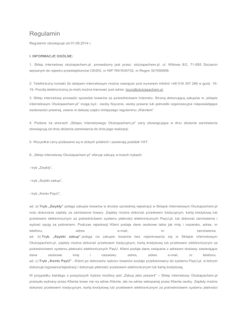 Regulamin Regulamin obowiązuje od 01.09.2014 r. I. INFORMACJE OGÓLNE: 1. Sklep internetowy otulzapachem.pl, prowadzony jest przez: otulzapachem.pl, ul. Willowa 8/2, 71-650 Szczecin wpisanym do rejestru przedsiębiorców CEiDG, nr NIP 7651634732, nr Regon 321550806. 2. Telefoniczny kontakt Ze sklepem internetowym można nawiązać pod numerem infolinii +48 516 257 285 w godz. 1019. Pocztę elektroniczną (e-mail) można kierować pod adres: [email protected]. 3. Sklep internetowy prowadzi sprzedaż towarów za pośrednictwem Internetu. Stroną dokonującą zakupów w „sklepie internetowym Otulzapachem.pl” mogą być: -osoby fizyczne, osoby prawne lub jednostki organizacyjne nieposiadające osobowości prawnej, zwane w dalszej części niniejszego regulaminu „Klientem”. 4. Podane na stronach „Sklepu internetowego Otulzapachem.pl” ceny obowiązujące w dniu złożenia zamówienia obowiązują od dnia złożenia zamówienia do dnia jego realizacji. 5. Wszystkie ceny podawane są w złotych polskich i zawierają podatek VAT. 6. „Sklep internetowy Otulzapachem.pl” oferuje zakupy w trzech trybach: - tryb „Zwykły”, - tryb „Szybki zakup”, - tryb „Konto PayU”, ad. a) Tryb „Zwykły” polega zakupie towarów w drodze uprzedniej rejestracji w Sklepie internetowym Otulzapachem.pl oraz dokonania zapłaty za zamówione towary. Zapłaty można dokonać przelewem tradycyjnym, kartą kredytową lub przelewem elektronicznym za pośrednictwem systemu płatności elektronicznych PayU.pl, lub dokonać zamówienia i wybrać opcję za pobraniem. Podczas rejestracji Klient podaje dane osobowe takie jak imię i nazwisko, adres, nr telefonu, adres nr e-mail, zamówienia. ad. b) Tryb „Szybki zakup” polega na zakupie towarów bez rejestrowania się w Sklepie internetowym Otulzapachem.pl, zapłaty można dokonać przelewem tradycyjnym, kartą kredytową lub przelewem elektronicznym za pośrednictwem systemu płatności elektronicznych PayU. Klient podaje dane związane z adresem dostawy zawierające dane osobowe imię i nazwisko, adres, adres e-mail, nr telefonu. ad. c) Tryb „Konto PayU” - Klient po dokonaniu wyboru towarów zostaje przekierowany do systemu PayU.pl, w którym dokonuje logowania/rejestracji i dokonuje płatności przelewem elektronicznym lub kartą kredytową. W przypadku każdego z powyższych trybów możliwy jest „Zakup jako prezent” – Sklep internetowy Otulzapachem.pl przesyła wybrany przez Klienta towar nie na adres Klienta, ale na adres wskazanej przez Klienta osoby. Zapłaty można dokonać przelewem tradycyjnym, kartą kredytową lub przelewem elektronicznym za pośrednictwem systemu płatności elektronicznych PayU.pl. Towar wysyłany jest w eleganckim opakowaniu. Zawsze w opisie wymagane jest podanie informacji, że towar przeznaczony jest na prezent. 7. W każdym trybie, zamówienia towary są składane przez Klientów na stronie internetowej „Sklepu internetowego Otulzapachem.pl” poprzez wypełnienie odpowiedniego formularza. 8. Serwer „Sklepu internetowego Otulzapachem.pl” wysyła automatycznie wiadomość e-mail do Klienta w celu uzyskania potwierdzenia złożonego zamówienia przy płatności za pobraniem. Wiadomość, o której mowa w zdaniu poprzedzającym, będzie zawierać informację na temat wysokości i kosztów przesyłki. 9. Klient ma 5 dni roboczych na odesłanie potwierdzenia zamówienia. Jeśli potwierdzenie nie zostanie w tym czasie odesłane przez Klienta, zamówienie zostanie automatycznie anulowane. 10. Procedura realizacji złożonego zamówienia rozpoczyna się w momencie, gdy klient potwierdzi e-mailem swoje zamówienie oraz zapłaci za towar za pomocą przelewu tradycyjnego, przelewem elektronicznym lub kartą kredytową w systemie płatności elektronicznych PayU.pl. W przypadku płatności za pobraniem, gdy potwierdzi e-mailem swoje zamówienie. 11. Jako datę zapłaty liczy się termin wpływu pieniędzy na konto „Sklepu internetowego Otulzapachem.pl” - Rachunek firmowy: mBank 39 1140 2004 0000 3102 7524 5260. Zapłata musi się znaleźć na koncie "Sklepu meblowego Otulzapachem.pl" nie później niż po 7-miu dniach od daty złożenia zamówienia. Po bezskutecznym upływie 7-dniowego terminu na zapłatę odpowiednio: za dostawę (w przypadku wyboru płatności „za pobraniem”) oraz za towar (w przypadku wyboru pozostałych form płatności) zamówienie zostaje anulowane i nie będzie wiązać Sklepu internetowego Otulzapachem.pl. 12. Zamówiony towar jest dostarczany do Klienta od 1 do 10 dni roboczych w zależności od dostępności towarów (chyba, że klient życzy sobie ich dostarczenia w późniejszym terminie). Termin dostawy może być dłuższy od terminu umówionego z Klientem, z przyczyn leżących po stronie przewoźnika, Poczty Polskiej lub kuriera. 13. Sklep Internetowy wysyła przesyłki zawsze w poniedziałki, środy i piątki. 14. Termin otrzymania przesyłki jest uzależniony od wyboru przez Klienta przewoźnika. Poczta Polska dostarcza przesyłki w terminie ok. 2-3 dni roboczych, kurier zazwyczaj w ciągu 1-2 dni. Klient zamawiający towar może wybrać przewoźnika spośród następujących: Poczta Polska lub Poczta Kurierska Poczty Polskiej. Swój wybór zaznacza na formularzu zamówień na stronie www.otulzapachem.pl. 15. Koszty oraz terminy dostaw znajdują się w zakładce "JAK KUPOWAĆ” i „dostawy”. 16. Rachunek imienny lub na firmę będzie zawierać dane, które Klient poda podczas składania zamówienia i będzie dołączany do paczki. Klientowi dokonującemu zakupu w opcji „Zakup jako prezent” rachunek będzie na adres osoby zamawiającej, a nie otrzymującej prezent. 17. Przy zwrocie towaru przez Klienta oraz w przypadku reklamacji przy zwrocie towaru wystawiany jest rachunek korygujący. 18. Do zwrotu towaru oraz do zwrotu towaru w przypadku reklamacji w opcji „Zakup jako prezent” upoważniona jest osoba otrzymująca prezent wyłącznie w sytuacji gdy dołą