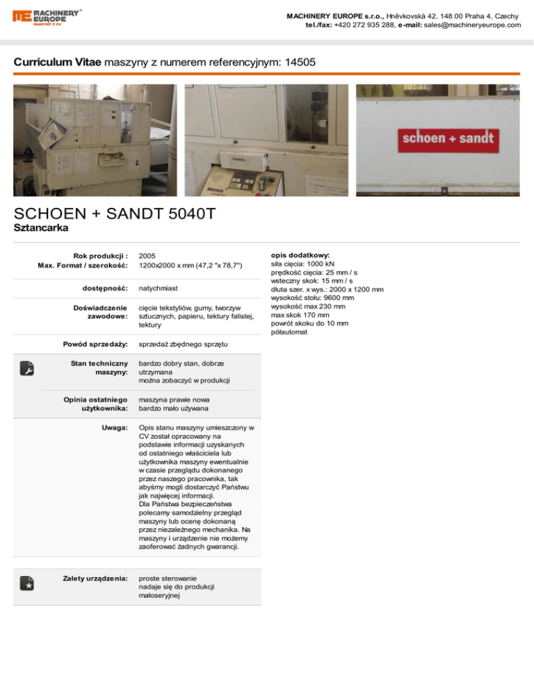 MACHINERY EUROPE s.r.o., Hněvkovská 42, 148 00 Praha 4, Czechy tel./fax: +420 272 935 288, e-mail: [email protected] Curriculum Vitae maszyny z numerem referencyjnym: 14505 SCHOEN + SANDT 5040T Sztancarka Rok produkcji : Max. Format / szerokość: dostępność: Doświadczenie zawodowe: 2005 1200x2000 x mm (47,2 "x 78,7") natychmiast cięcie tekstyliów, gumy, tworzyw sztucznych, papieru, tektury falistej, tektury Powód sprzedaży: sprzedaż zbędnego sprzętu Stan techniczny maszyny: bardzo dobry stan, dobrze utrzymana można zobaczyć w produkcji Opinia ostatniego użytkownika: Uwaga: Zalety urządzenia: maszyna prawie nowa bardzo mało używana Opis stanu maszyny umieszczony w CV został opracowany na podstawie informacji uzyskanych od ostatniego właściciela lub użytkownika maszyny ewentualnie w czasie przeglądu dokonanego przez naszego pracownika, tak abyśmy mogli dostarczyć Państwu jak najwięcej informacji. Dla Państwa bezpieczeństwa polecamy samodzielny przegląd maszyny lub ocenę dokonaną przez niezależnego mechanika. Na maszyny i urządzenie nie możemy zaoferować żadnych gwarancji. proste sterowanie nadaje się do produkcji małoseryjnej opis dodatkowy: siła cięcia: 1000 kN prędkość cięcia: 25 mm / s wsteczny skok: 15 mm / s dłuta szer. x wys.: 2000 x 1200 mm wysokość stołu: 9600 mm wysokość max 230 mm max skok 170 mm powrót skoku do 10 mm półautomat
