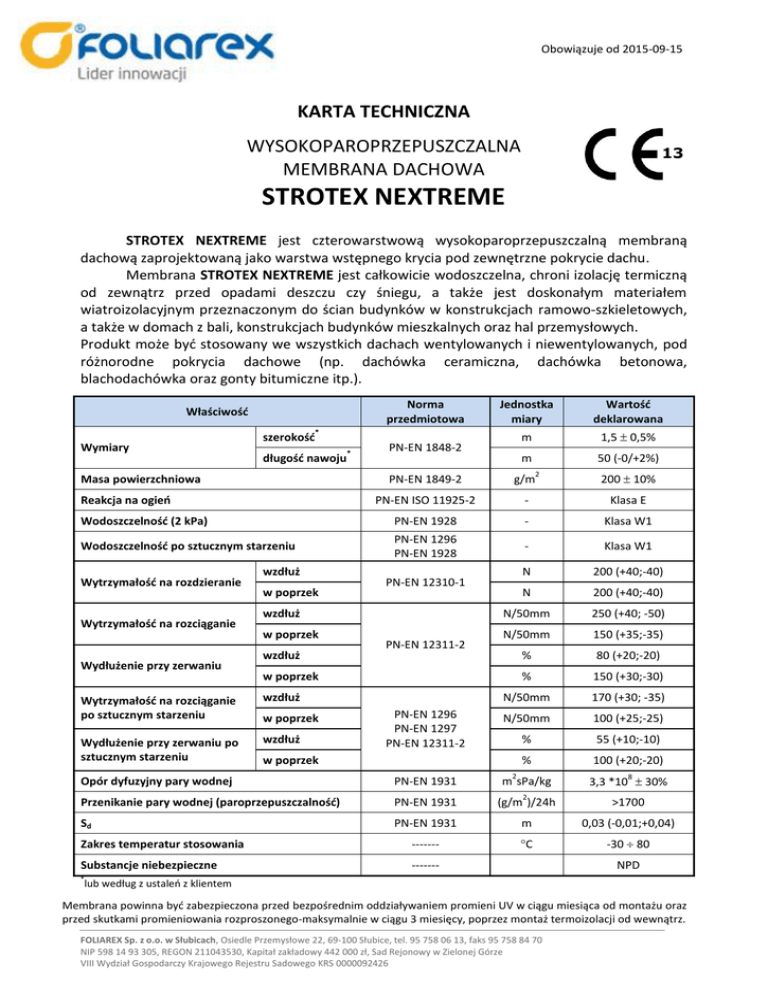 Obowiązuje od 2015-09-15 KARTA TECHNICZNA WYSOKOPAROPRZEPUSZCZALNA MEMBRANA DACHOWA 13 STROTEX NEXTREME STROTEX NEXTREME jest czterowarstwową wysokoparoprzepuszczalną membraną dachową zaprojektowaną jako warstwa wstępnego krycia pod zewnętrzne pokrycie dachu. Membrana STROTEX NEXTREME jest całkowicie wodoszczelna, chroni izolację termiczną od zewnątrz przed opadami deszczu czy śniegu, a także jest doskonałym materiałem wiatroizolacyjnym przeznaczonym do ścian budynków w konstrukcjach ramowo-szkieletowych, a także w domach z bali, konstrukcjach budynków mieszkalnych oraz hal przemysłowych. Produkt może być stosowany we wszystkich dachach wentylowanych i niewentylowanych, pod różnorodne pokrycia dachowe (np. dachówka ceramiczna, dachówka betonowa, blachodachówka oraz gonty bitumiczne itp.). Norma przedmiotowa Właściwość Wymiary szerokość Jednostka miary Wartość deklarowana m 1,5 0,5% * długość nawoju * PN-EN 1848-2 m 50 (-0/+2%) 2 PN-EN 1849-2 g/m 200 10% PN-EN ISO 11925-2 - Klasa E Wodoszczelność (2 kPa) PN-EN 1928 - Klasa W1 Wodoszczelność po sztucznym starzeniu PN-EN 1296 PN-EN 1928 - Klasa W1 N 200 (+40;-40) N 200 (+40;-40) N/50mm 250 (+40; -50) N/50mm 150 (+35;-35) % 80 (+20;-20) % 150 (+30;-30) N/50mm 170 (+30; -35) N/50mm 100 (+25;-25) % 55 (+10;-10) % 100 (+20;-20) Masa powierzchniowa Reakcja na ogień Wytrzymałość na rozdzieranie Wytrzymałość na rozciąganie Wydłużenie przy zerwaniu wzdłuż w poprzek PN-EN 12310-1 wzdłuż w poprzek wzdłuż PN-EN 12311-2 w poprzek Wytrzymałość na rozciąganie po sztucznym starzeniu wzdłuż Wydłużenie przy zerwaniu po sztucznym starzeniu wzdłuż w poprzek PN-EN 1296 PN-EN 1297 PN-EN 12311-2 w poprzek 2 Opór dyfuzyjny pary wodnej PN-EN 1931 m sPa/kg 3,3 *10 30% Przenikanie pary wodnej (paroprzepuszczalność) PN-EN 1931 (g/m )/24h 2 >1700 Sd PN-EN 1931 m 0,03 (-0,01;+0,04) Zakres temperatur stosowania ------- C -30 80 Substancje niebezpieczne ------- * 8 NPD lub według z ustaleń z klientem Membrana powinna być zabezpieczona przed bezpośrednim oddziaływaniem promieni UV w ciągu miesiąca od montażu oraz przed skutkami promieniowania rozproszonego-maksymalnie w ciągu 3 miesięcy, poprzez montaż termoizolacji od wewnątrz. FOLIAREX Sp. z o.o. w Słubicach, Osiedle Przemysłowe 22, 69-100 Słubice, tel. 95 758 06 13, faks 95 758 84 70 NIP 598 14 93 305, REGON 211043530, Kapitał zakładowy 442 000 zł, Sad Rejonowy w Zielonej Górze VIII Wydział Gospodarczy Krajowego Rejestru Sadowego KRS 0000092426