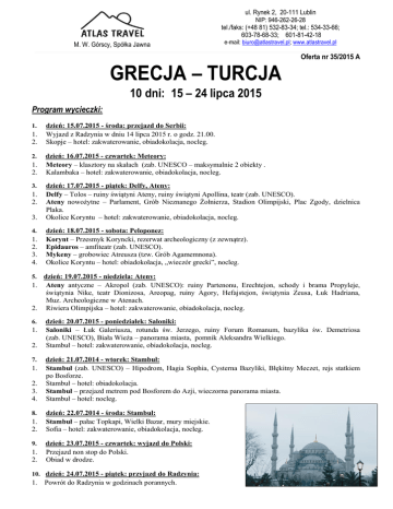 ul. Rynek 2, 20-111 Lublin NIP: 946-262-26-28 tel./faks: (+48 81) 532-83-34; tel.: 534-33-66; 603-78-68-33; 601-81-42-18 M. W. Górscy, Spółka Jawna e-mail: [email protected]; www.atlastravel.pl _____________________________________________________________________________________________________________________________ __________________________________________________________________________________________________________________________________________________________________________________________________________________________ _____________________________________________________________________________________________________________________________ ___________________________________________________________________________________________________________________________________ _____________________________________________________________________________________________________________________________ ___________________________________________________________________________________________________________________________________ ________________________________________________________________________________________________________________________________________________________________________________________________________________________ Oferta nr 35/2015 A GRECJA – TURCJA 10 dni: 15 – 24 lipca 2015 Program wycieczki: 1. 1. 2. 2. 1. 2. 3. 1. 2. 3. 4. 1. 2. 3. 4. dzień: 15.07.2015 - środa: przejazd do Serbii: Wyjazd z Radzynia w dniu 14 lipca 2015 r. o godz. 21.00. Skopje – hotel: zakwaterowanie, obiadokolacja, nocleg. dzień: 16.07.2015 - czwartek: Meteory: Meteory – klasztory na skałach (zab. UNESCO – maksymalnie 2 obiekty . Kalambaka – hotel: zakwaterowanie, obiadokolacja, nocleg. dzień: 17.07.2015 - piątek: Delfy, Ateny: Delfy – Tolos – ruiny świątyni Ateny, ruiny świątyni Apollina, teatr (zab. UNESCO). Ateny nowożytne – Parlament, Grób Nieznanego Żołnierza, Stadion Olimpijski, Plac Zgody, dzielnica Plaka. Okolice Koryntu – hotel: zakwaterowanie, obiadokolacja, nocleg. dzień: 18.07.2015 - sobota: Peloponez: Korynt – Przesmyk Koryncki, rezerwat archeologiczny (z zewnątrz). Epidauros – amfiteatr (zab. UNESCO). Mykeny – grobowiec Atreusza (tzw. Grób Agamemnona). Okolice Koryntu – hotel: obiadokolacja, „wieczór grecki”, nocleg. dzień: 19.07.2015 - niedziela: Ateny: Ateny antyczne – Akropol (zab. UNESCO): ruiny Partenonu, Erechtejon, schody i brama Propyleje, świątynia Nike, teatr Dionizosa, Areopag, ruiny Agory, Hefajstejon, świątynia Zeusa, Łuk Hadriana, Muz. Archeologiczne w Atenach. 2. Riwiera Olimpijska – hotel: zakwaterowanie, obiadokolacja, nocleg. 5. 1. 6. 1. 2. 7. 1. 2. 3. 4. 8. 1. 2. 9. 1. 2. dzień: 20.07.2015 - poniedziałek: Saloniki: Saloniki – Łuk Galeriusza, rotunda św. Jerzego, ruiny Forum Romanum, bazylika św. Demetriosa (zab. UNESCO), Biała Wieża – panorama miasta, pomnik Aleksandra Wielkiego. Stambuł – hotel: zakwaterowanie, obiadokolacja, nocleg. dzień: 21.07.2014 - wtorek: Stambuł: Stambuł (zab. UNESCO) – Hipodrom, Hagia Sophia, Cysterna Bazyliki, Błękitny Meczet, rejs statkiem po Bosforze. Stambuł – hotel: obiadokolacja. Stambuł – przejazd metrem pod Bosforem do Azji, wieczorna panorama miasta. Stambuł – hotel: nocleg. dzień: 22.07.2014 - środa: Stambuł: Stambuł – pałac Topkapi, Wielki Bazar, mury miejskie. Sofia – hotel: zakwaterowanie, obiadokolacja, nocleg. dzień: 23.07.2015 - czwartek: wyjazd do Polski: Przejazd non stop do Polski. Obiad w drodze. 10. dzień: 24.07.2015 - piątek: przyjazd do Radzynia: 1.…Powrót do Radzynia w godzinach porannych. Cena: 270 EUR + 955 PLN / 1 os. (dla grupy min. 45 osób) obejmuje: 1. Autokar z klimatyzacją + parkingi + opłaty drogowe. 2. 8 noclegów – hotele 2-3* – pokoje 2-, 3-osobowe z łazienkami. 3. Wyżywienie: 2 posiłki dziennie (8 śniadań + 9 obiadów + „wieczór grecki” - zabawa przy greckiej muzyce i winie). 4. Obsługę pilota. 5. Ubezpieczenie KL na sumę 10 000 EUR i NNW na sumę 15 000 PLN, bagaż 800 PLN. Cena nie obejmuje: biletów wstępu do zwiedzanych obiektów i przewodników po Atenach i Stambule, przejazdów metrem w Stambule – razem ok. 120-150 EUR (dokładne ceny biletów zostaną podane w marcu, po ustaleniu cen na sezon 2015). Oferta ważna do 15.02.2015 r.