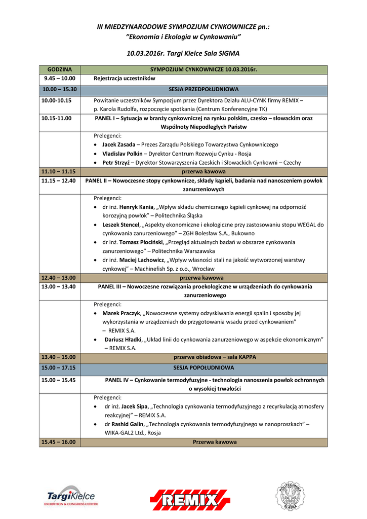 III MIEDZYNARODOWE SYMPOZJUM CYNKOWNICZE pn.: ”Ekonomia i Ekologia w Cynkowaniu” 10.03.2016r. Targi Kielce Sala SIGMA GODZINA 9.45 – 10.00 10.00 – 15.30 10.00-10.15 SYMPOZJUM CYNKOWNICZE 10.03.2016r. Rejestracja uczestników SESJA PRZEDPOŁUDNIOWA 13.40 – 15.00 Powitanie uczestników Sympozjum przez Dyrektora Działu ALU-CYNK firmy REMIX – p. Karola Rudolfa, rozpoczęcie spotkania (Centrum Konferencyjne TK) PANEL I – Sytuacja w branży cynkowniczej na rynku polskim, czesko – słowackim oraz Wspólnoty Niepodległych Państw Prelegenci: · Jacek Zasada – Prezes Zarządu Polskiego Towarzystwa Cynkowniczego · Vladislav Polkin – Dyrektor Centrum Rozwoju Cynku - Rosja · Petr Strzyź – Dyrektor Stowarzyszenia Czeskich i Słowackich Cynkowni – Czechy przerwa kawowa PANEL II – Nowoczesne stopy cynkownicze, składy kąpieli, badania nad nanoszeniem powłok zanurzeniowych Prelegenci: · dr inż. Henryk Kania, „Wpływ składu chemicznego kąpieli cynkowej na odporność korozyjną powłok” – Politechnika Śląska · Leszek Stencel, „Aspekty ekonomiczne i ekologiczne przy zastosowaniu stopu WEGAL do cynkowania zanurzeniowego” – ZGH Bolesław S.A., Bukowno · dr inż. Tomasz Płociński, „Przegląd aktualnych badań w obszarze cynkowania zanurzeniowego” – Politechnika Warszawska · dr inż. Maciej Lachowicz, „Wpływ własności stali na jakość wytworzonej warstwy cynkowej” – Machinefish Sp. z o.o., Wrocław przerwa kawowa PANEL III – Nowoczesne rozwiązania proekologiczne w urządzeniach do cynkowania zanurzeniowego Prelegenci: · Marek Praczyk, „Nowoczesne systemy odzyskiwania energii spalin i sposoby jej wykorzystania w urządzeniach do przygotowania wsadu przed cynkowaniem” – REMIX S.A. · Dariusz Hładki, „Układ linii do cynkowania zanurzeniowego w aspekcie ekonomicznym” – REMIX S.A. przerwa obiadowa – sala KAPPA 15.00 – 17.15 SESJA POPOŁUDNIOWA 10.15-11.00 11.10 – 11.15 11.15 – 12.40 12.40 – 13.00 13.00 – 13.40 15.00 – 15.45 15.45 – 16.00 PANEL IV – Cynkowanie termodyfuzyjne - technologia nanoszenia powłok ochronnych o wysokiej trwałości Prelegenci: · dr inż. Jacek Sipa, „Technologia cynkowania termodyfuzyjnego z recyrkulacją atmosfery reakcyjnej” – REMIX S.A. · dr Rashid Galin, „Technologia cynkowania termodyfuzyjnego w nanoproszkach” – WIKA-GAL2 Ltd., Rosja Przerwa kawowa 16.00 – 16.30 16.30 – 17.00 17.00 – 17.15 19.00 PANEL V – Przygotowanie powierzchni metali pod powłokę cynkową Prelegenci: · Massimo Beukema, „Towards zero liquid discharge in hot dip galvanizing process” – SOPRIN srl, Włochy · Tomasz Skotnicki, „Nowoczesne technologie przygotowania powierzchni wsadu dla procesów cynkowania drobnych detali” – GALKOR Sp. z o.o., Polska PANEL VI – Systemy filtracji w halach produkcyjnych ocynkowni zanurzeniowych oraz rozwiązania zmniejszające emisję zanieczyszczeń Prelegent: · Michał Surowiec, „Innowacyjne rozwiązania instalacji odpylających dymy znad wanien cynkowniczych firmy Nederman” – NEDERMAN Polska Sp. z o.o., Polska · Karol Rudolf, „Zapotrzebowanie energetyczne w poszczególnych etapach prac związanych z cynkowaniem zanurzeniowym” – REMIX S.A. PODSUMOWANIE Sympozjum BANKIET – Hotel Kongresowy Informacje organizacyjne: 1. Zakwaterowanie w hotelu Binkowski, ul. Szczepaniaka 42; 25-043 Kielce, tel.: +48 41 340 35 00 (http://binkowskihotel.pl/pl/23-kontakt.html ). Doba hotelowa zaczyna się o godzinie 14:00 w dniu przyjazdu i kończy o godzinie 12:00 w dniu wyjazdu. 2. Godz. 18.30 w dniu 10.03.2016r. zostanie podstawiony autobus pod hotel Binkowski, który przewiezie zgłoszonych uprzednio uczestników na bankiet do hotelu Kongresowego. Natomiast powrót do hotelu Binkowski po bankiecie pozostaje w zakresie własnym uczestników. Numery taxi: 721 721 131; 41 333 55 55; BUS TAXI 6 os. 662 048 740; 508 511 533. 3. Osoba odpowiedzialna za organizację Sympozjum: Sylwia Kowalik-Lichuta +48 797 328 912 4. Moderator Sympozjum: dr Jacek Sipa +48 797 328 920