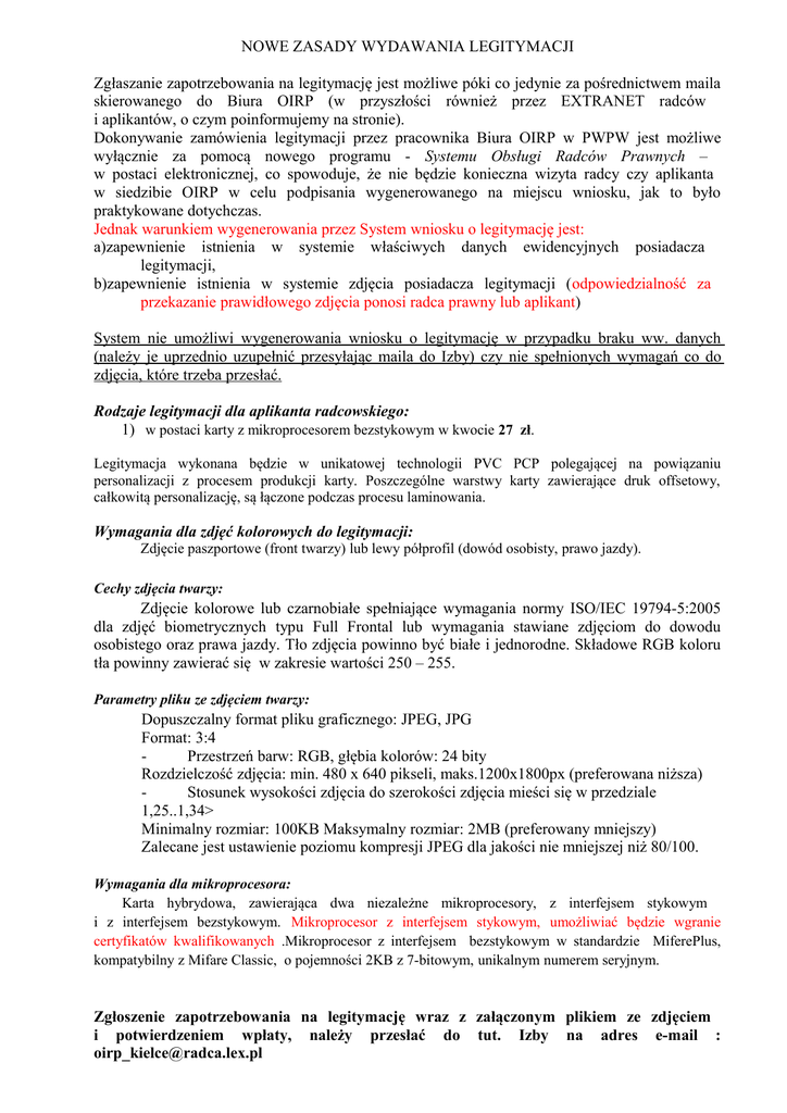 NOWE ZASADY WYDAWANIA LEGITYMACJI Zgłaszanie zapotrzebowania na legitymację jest możliwe póki co jedynie za pośrednictwem maila skierowanego do Biura OIRP (w przyszłości również przez EXTRANET radców i aplikantów, o czym poinformujemy na stronie). Dokonywanie zamówienia legitymacji przez pracownika Biura OIRP w PWPW jest możliwe wyłącznie za pomocą nowego programu - Systemu Obsługi Radców Prawnych – w postaci elektronicznej, co spowoduje, że nie będzie konieczna wizyta radcy czy aplikanta w siedzibie OIRP w celu podpisania wygenerowanego na miejscu wniosku, jak to było praktykowane dotychczas. Jednak warunkiem wygenerowania przez System wniosku o legitymację jest: a)zapewnienie istnienia w systemie właściwych danych ewidencyjnych posiadacza legitymacji, b)zapewnienie istnienia w systemie zdjęcia posiadacza legitymacji (odpowiedzialność za przekazanie prawidłowego zdjęcia ponosi radca prawny lub aplikant) System nie umożliwi wygenerowania wniosku o legitymację w przypadku braku ww. danych (należy je uprzednio uzupełnić przesyłając maila do Izby) czy nie spełnionych wymagań co do zdjęcia, które trzeba przesłać. Rodzaje legitymacji dla aplikanta radcowskiego: 1) w postaci karty z mikroprocesorem bezstykowym w kwocie 27 zł. Legitymacja wykonana będzie w unikatowej technologii PVC PCP polegającej na powiązaniu personalizacji z procesem produkcji karty. Poszczególne warstwy karty zawierające druk offsetowy, całkowitą personalizację, są łączone podczas procesu laminowania. Wymagania dla zdjęć kolorowych do legitymacji: Zdjęcie paszportowe (front twarzy) lub lewy półprofil (dowód osobisty, prawo jazdy). Cechy zdjęcia twarzy: Zdjęcie kolorowe lub czarnobiałe spełniające wymagania normy ISO/IEC 19794-5:2005 dla zdjęć biometrycznych typu Full Frontal lub wymagania stawiane zdjęciom do dowodu osobistego oraz prawa jazdy. Tło zdjęcia powinno być białe i jednorodne. Składowe RGB koloru tła powinny zawierać się w zakresie wartości 250 – 255. Parametry pliku ze zdjęciem twarzy: Dopuszczalny format pliku graficznego: JPEG, JPG Format: 3:4 Przestrzeń barw: RGB, głębia kolorów: 24 bity Rozdzielczość zdjęcia: min. 480 x 640 pikseli, maks.1200x1800px (preferowana niższa) Stosunek wysokości zdjęcia do szerokości zdjęcia mieści się w przedziale 1,25..1,34> Minimalny rozmiar: 100KB Maksymalny rozmiar: 2MB (preferowany mniejszy) Zalecane jest ustawienie poziomu kompresji JPEG dla jakości nie mniejszej niż 80/100. Wymagania dla mikroprocesora: Karta hybrydowa, zawierająca dwa niezależne mikroprocesory, z interfejsem stykowym i z interfejsem bezstykowym. Mikroprocesor z interfejsem stykowym, umożliwiać będzie wgranie certyfikatów kwalifikowanych .Mikroprocesor z interfejsem bezstykowym w standardzie MiferePlus, kompatybilny z Mifare Classic, o pojemności 2KB z 7-bitowym, unikalnym numerem seryjnym. Zgłoszenie zapotrzebowania na legitymację wraz z załączonym plikiem ze zdjęciem i potwierdzeniem wpłaty, należy przesłać do tut. Izby na adres e-mail : [email protected]