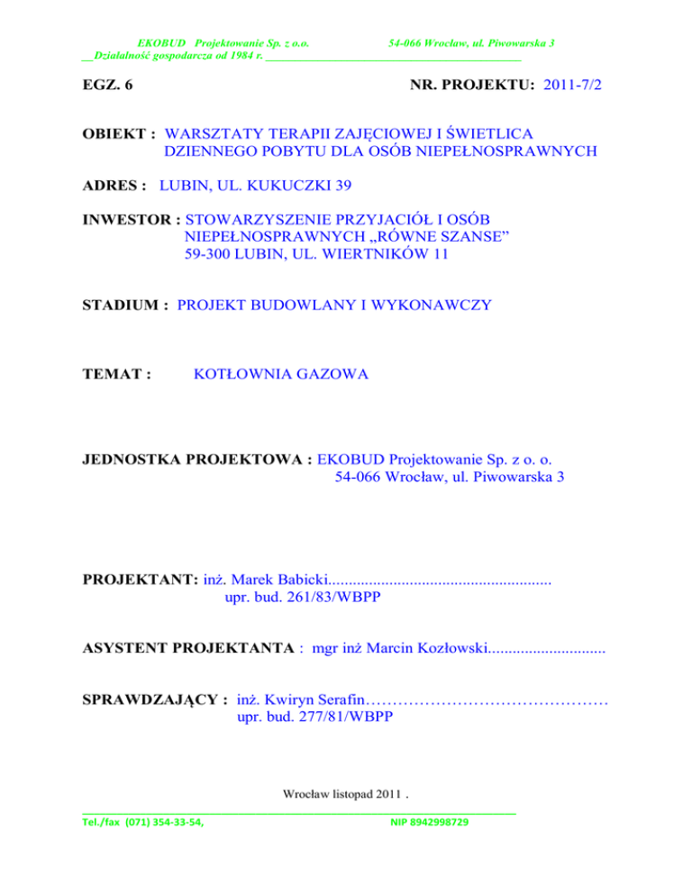 EKOBUD Projektowanie Sp. z o.o. 54-066 Wrocław, ul. Piwowarska 3 __Działalność gospodarcza od 1984 r. ____________________________________________ EGZ. 6 NR. PROJEKTU: 2011-7/2 OBIEKT : WARSZTATY TERAPII ZAJĘCIOWEJ I ŚWIETLICA DZIENNEGO POBYTU DLA OSÓB NIEPEŁNOSPRAWNYCH ADRES : LUBIN, UL. KUKUCZKI 39 INWESTOR : STOWARZYSZENIE PRZYJACIÓŁ I OSÓB NIEPEŁNOSPRAWNYCH „RÓWNE SZANSE” 59-300 LUBIN, UL. WIERTNIKÓW 11 STADIUM : PROJEKT BUDOWLANY I WYKONAWCZY TEMAT : KOTŁOWNIA GAZOWA JEDNOSTKA PROJEKTOWA : EKOBUD Projektowanie Sp. z o. o. 54-066 Wrocław, ul. Piwowarska 3 PROJEKTANT: inż. Marek Babicki....................................................... upr. bud. 261/83/WBPP ASYSTENT PROJEKTANTA : mgr inż Marcin Kozłowski............................. SPRAWDZAJĄCY : inż. Kwiryn Serafin……………………………………… upr. bud. 277/81/WBPP Wrocław listopad 2011 . ___________________________________________________________________________ Tel./fax (071) 354-33-54, NIP 8942998729 EKOBUD Projektowanie Sp. z o.o. 54-066 Wrocław, ul. Piwowarska 3 __Działalność gospodarcza od 1984 r. ____________________________________________ Spis treści Spis rysunków .....................................................................................................................................2 2. Oświadczenie. ................................................................................................................................3 3. Opis techniczny. ..............................................................................................................................4 3.1. Zakres opracowania. ................................................................................................................4 3.2. Podstawa opracowania. ...........................................................................................................4 3.3. Instalacja paliwowa kotłowni....................................................................................................4 3.4. Technologia kotłowni gazowej, niskoparametrowej..................................................................5 3.5. Przedmiot opracowania............................................................................................................5 3.6. Jednostka kotłowa....................................................................................................................5 3.7. Układ obiegu technologicznego kotłowni..................................................................................5 3.8. Instalacja spalinowa. ................................................................................................................6 3.8. Instalacja wodociągowa i kanalizacyjna. ...................................................................................6 3.9. Wentylacja kotłowni.................................................................................................................6 3.10. Zabezpieczenie przeciwpożarowe i przeciw obecności gazu w kotłowni. ................................6 3.11. Uwagi końcowe. .....................................................................................................................7 3.12. Wytyczne branżowe ...............................................................................................................7 4. Informacja BIOZ.........................................................................................................................8 4.1. Zakres robót ...........................................................................................................................8 4.2. Wykaz istniejących obiektów ................................................................................................8 4.3. Instruktaż BHP pracowników................................................................................................8 4.4. Przechowywanie i przemieszczanie materiałów niebezpiecznych na terenie budowy .......8 4.5. Środki techniczne i organizacyjne zapobiegające niebezpieczeństwu. ................................8 4.6. Przechowywanie dokumentacji technicznej .........................................................................9 Spis rysunków Plan sytuacyjny – Rys. 1. Schemat kotłowni – Rys. 2. Rzut i przekroje kotłowni – Rys. 3. Załączniki: Warunki przyłączenia gazu wydane przez Dolnośląską Spółkę Gazownictwa Sp. z o. o. nr. WR/NLU-DK/WP/304891/2011 Uprawnienia budowlane 261/83/WBPP – Marek Babicki Uprawnienia budowlane 277/81/WBPP – Kwiryn Serafin Zaświadczenie DOŚ/IS/1203/03 Zaświadczenie DOŚ/IS/3780/01 ___________________________________________________________________________ Tel./fax (071) 354-33-54, NIP 8942998729 EKOBUD Projektowanie Sp. z o.o. 54-066 Wrocław, ul. Piwowarska 3 __Działalność gospodarcza od 1984 r. ____________________________________________ 2. Oświadczenie. Oświadczenie : Na podstawie art. 20 ust.4 ustawy z dnia 7 lipca 1994 r.- Prawo budowlane (tekst jednolity Dz. U. z 2010 r. Nr 243 poz. 1623 ze zm.), z późniejszymi zmianami oświadczamy, że projekt wykonawczy kotłowni w budynku Warsztatów terapii zajęciowej i świetlicy dziennego pobytu dla osób niepełnosprawnych w Lubinie przy ul. Kukuczki 39 został obowiązującymi przepisami oraz zasadami wiedzy technicznej. Zespół Projektowy: inż. Marek Babicki ……………………………………………………………..................... Sprawdzający: inż. Kwiryn Serafin ……………………………………………………………………… ___________________________________________________________________________ Tel./fax (071) 354-33-54, NIP 8942998729 EKOBUD Projektowanie Sp. z o.o. 54-066 Wrocław, ul. Piwowarska 3 __Działalność gospodarcza od 1984 r. ____________________________________________ 3. Opis techniczny. 3.1. Zakres opracowania. Tematem opracowania jest projekt kotłowni na paliwo gazowe. W zakres op