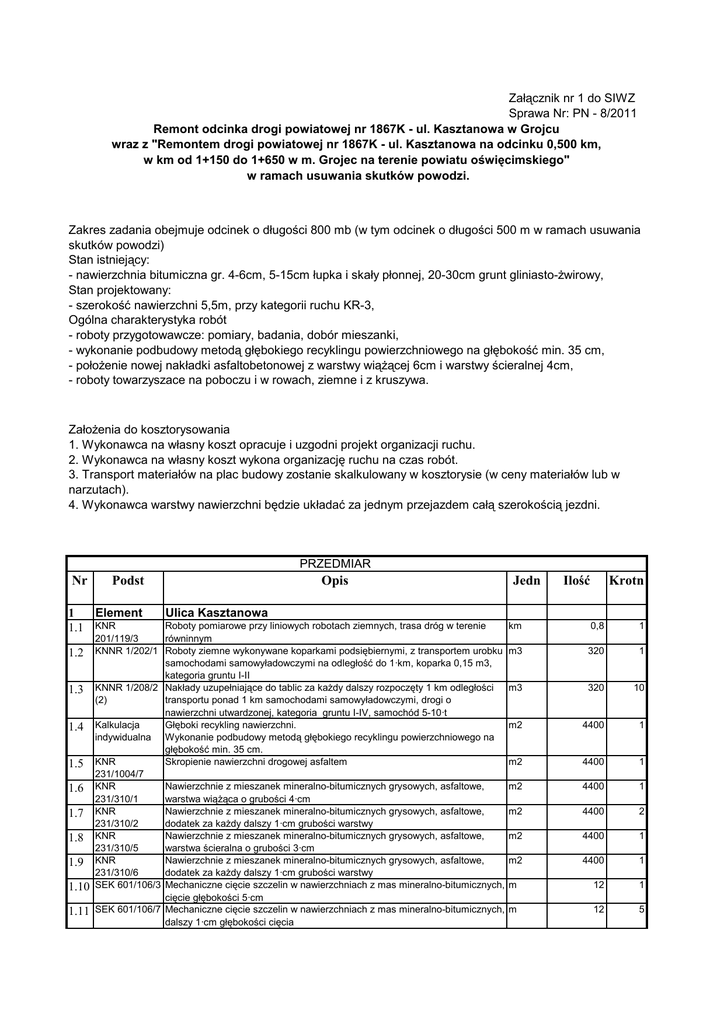 Załącznik nr 1 do SIWZ Sprawa Nr: PN - 8/2011 Remont odcinka drogi powiatowej nr 1867K - ul. Kasztanowa w Grojcu wraz z "Remontem drogi powiatowej nr 1867K - ul. Kasztanowa na odcinku 0,500 km, w km od 1+150 do 1+650 w m. Grojec na terenie powiatu oświęcimskiego" w ramach usuwania skutków powodzi. Zakres zadania obejmuje odcinek o długości 800 mb (w tym odcinek o długości 500 m w ramach usuwania skutków powodzi) Stan istniejący: - nawierzchnia bitumiczna gr. 4-6cm, 5-15cm łupka i skały płonnej, 20-30cm grunt gliniasto-Ŝwirowy, Stan projektowany: - szerokość nawierzchni 5,5m, przy kategorii ruchu KR-3, Ogólna charakterystyka robót - roboty przygotowawcze: pomiary, badania, dobór mieszanki, - wykonanie podbudowy metodą głębokiego recyklingu powierzchniowego na głębokość min. 35 cm, - połoŜenie nowej nakładki asfaltobetonowej z warstwy wiąŜącej 6cm i warstwy ścieralnej 4cm, - roboty towarzyszace na poboczu i w rowach, ziemne i z kruszywa. ZałoŜenia do kosztorysowania 1. Wykonawca na własny koszt opracuje i uzgodni projekt organizacji ruchu. 2. Wykonawca na własny koszt wykona organizację ruchu na czas robót. 3. Transport materiałów na plac budowy zostanie skalkulowany w kosztorysie (w ceny materiałów lub w narzutach). 4. Wykonawca warstwy nawierzchni będzie układać za jednym przejazdem całą szerokością jezdni. PRZEDMIAR Nr Podst 1 Element 1.1 KNR 1.2 1.3 1.4 1.5 1.6 1.7 1.8 1.9 1.10 1.11 Opis Jedn Ilość Krotn Ulica Kasztanowa Roboty pomiarowe przy liniowych robotach ziemnych, trasa dróg w terenie 201/119/3 równinnym KNNR 1/202/1 Roboty ziemne wykonywane koparkami podsiębiernymi, z transportem urobku samochodami samowyładowczymi na odległość do 1·km, koparka 0,15 m3, kategoria gruntu I-II KNNR 1/208/2 Nakłady uzupełniające do tablic za kaŜdy dalszy rozpoczęty 1 km odległości (2) transportu ponad 1 km samochodami samowyładowczymi, drogi o nawierzchni utwardzonej, kategoria gruntu I-IV, samochód 5-10·t Kalkulacja Głęboki recykling nawierzchni. indywidualna Wykonanie podbudowy metodą głębokiego recyklingu powierzchniowego na głębokość min. 35 cm. KNR Skropienie nawierzchni drogowej asfaltem 231/1004/7 KNR Nawierzchnie z mieszanek mineralno-bitumicznych grysowych, asfaltowe, 231/310/1 warstwa wiąŜąca o grubości 4·cm KNR Nawierzchnie z mieszanek mineralno-bitumicznych grysowych, asfaltowe, 231/310/2 dodatek za kaŜdy dalszy 1·cm grubości warstwy KNR Nawierzchnie z mieszanek mineralno-bitumicznych grysowych, asfaltowe, 231/310/5 warstwa ścieralna o grubości 3·cm KNR Nawierzchnie z mieszanek mineralno-bitumicznych grysowych, asfaltowe, 231/310/6 dodatek za kaŜdy dalszy 1·cm grubości warstwy SEK 601/106/3 Mechaniczne cięcie szczelin w nawierzchniach z mas mineralno-bitumicznych, cięcie głębokości 5·cm SEK 601/106/7 Mechaniczne cięcie szczelin w nawierzchniach z mas mineralno-bitumicznych, dalszy 1·cm głębokości cięcia km 0,8 1 m3 320 1 m3 320 10 m2 4400 1 m2 4400 1 m2 4400 1 m2 4400 2 m2 4400 1 m2 4400 1 m 12 1 m 12 5 1.12 KNR 1.13 1.14 231/803/1 KNR 231/803/2 KNR 231/1402/5 (1) 1.15 KNR 404/1103/1 1.16 KNR 404/1103/4 1.17 KNR 404/1103/5 1.18 1.19 KNR 1.20 231/114/7 KNR 231/114/8 Rozebranie nawierzchni z mieszanek mineralno-bitumicznych, ręcznie, grubość nawierzchni 3·cm Rozebranie nawierzchni z mieszanek mineralno-bitumicznych, ręcznie, dodatek za kaŜdy dalszy 1·cm Ścinanie poboczy mechanicznie, grubości do 10·cm, nakłady podstawowe m2 55 1 m2 55 7 m2 1200 1 Wywiezienie gruzu z terenu rozbiórki przy mechanicznym załadowaniu i wyładowaniu, załadowanie koparko-ładowarką samochodów samowyładowczych, przy obsłudze 3 samochodów na zmianę Wywiezienie gruzu z terenu rozbiórki przy mechanicznym załadowaniu i wyładowaniu, transport samochodem samowyładowczym na odległość 1 km (gruz asfaltowy) Wywiezienie gruzu z terenu rozbiórki przy mechanicznym załadowaniu i m3 126 1 m3 126 1 m3 126 9 m3 126 1 Podbudowy z kruszyw, tłuczeń, warstwa górna, grubość warstwy po m2 zagęszczeniu 8·cm Podbudowy z kruszyw, tłuczeń, warstwa górna, dodatek za kaŜdy dalszy 1·cm m2 grubości 1200 1 1200 2 wyładowaniu, nakłądy uzupełniające na kaŜdy dalszy rozpoczęty 1·km ponad 1·km transportu Dodatek za skladowanie gruzu