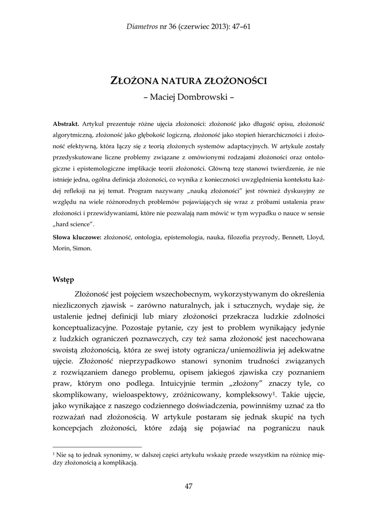 Diametros nr 36 (czerwiec 2013): 47–61 ZŁOŻONA NATURA ZŁOŻONOŚCI – Maciej Dombrowski – Abstrakt. Artykuł prezentuje różne ujęcia złożoności: złożoność jako długość opisu, złożoność algorytmiczną, złożoność jako głębokość logiczną, złożoność jako stopień hierarchiczności i złożoność efektywną, która łączy się z teorią złożonych systemów adaptacyjnych. W artykule zostały przedyskutowane liczne problemy związane z omówionymi rodzajami złożoności oraz ontologiczne i epistemologiczne implikacje teorii złożoności. Główną tezę stanowi twierdzenie, że nie istnieje jedna, ogólna definicja złożoności, co wynika z konieczności uwzględnienia kontekstu każdej refleksji na jej temat. Program nazywany „nauką złożoności” jest również dyskusyjny ze względu na wiele różnorodnych problemów pojawiających się wraz z próbami ustalenia praw złożoności i przewidywaniami, które nie pozwalają nam mówić w tym wypadku o nauce w sensie „hard science”. Słowa kluczowe: złożoność, ontologia, epistemologia, nauka, filozofia przyrody, Bennett, Lloyd, Morin, Simon. Wstęp Złożoność jest pojęciem wszechobecnym, wykorzystywanym do określenia niezliczonych zjawisk – zarówno naturalnych, jak i sztucznych, wydaje się, że ustalenie jednej definicji lub miary złożoności przekracza ludzkie zdolności konceptualizacyjne. Pozostaje pytanie, czy jest to problem wynikający jedynie z ludzkich ograniczeń poznawczych, czy też sama złożoność jest nacechowana swoistą złożonością, która ze swej istoty ogranicza/uniemożliwia jej adekwatne ujęcie. Złożoność nieprzypadkowo stanowi synonim trudności związanych z rozwiązaniem danego problemu, opisem jakiegoś zjawiska czy poznaniem praw, którym ono podlega. Intuicyjnie termin „złożony” znaczy tyle, co skomplikowany, wieloaspektowy, zróżnicowany, kompleksowy1. Takie ujęcie, jako wynikające z naszego codziennego doświadczenia, powinniśmy uznać za tło rozważań nad złożonością. W artykule postaram się jednak skupić na tych koncepcjach złożoności, które zdają się pojawiać na pograniczu nauk Nie są to jednak synonimy, w dalszej części artykułu wskażę przede wszystkim na różnicę między złożonością a komplikacją. 1 47 Maciej Dombrowski ◦ Złożona natura złożoności szczegółowych i filozofii. Jak sądzę, wysiłki czynione zarówno przez naukowców, jak i filozofów pozwalają na częściowe rozwianie swoistej mgły pojęciowej, która otacza złożoność. Złożoność nie jest zjawiskiem nowym, jej wagę dostrzegano już w starożytności, ale prawdziwa kariera tego terminu przypada na drugą połowę XX wieku. Przełom minionego i obecnego stulecia można z powodzeniem nazwać „erą złożoności” – złożone okazuje się wszystko – od cząstek elementarnych po nasze uczucia i sytuację gospodarczą świata. Mówi się nawet o nowym „paradygmacie złożoności”, który ma zastąpić dawny, jeszcze o proweniencji newtonowskiej2. Nauka proponuje szereg cząstkowych definicji złożoności, przyporządkowuje takim definicjom odpowiednie kryteria – miary złożoności. Refleksja filozoficzna miałaby w tym wypadku na celu wyodrębnienie założeń tkwiących u podstaw takich a nie innych rozróżnień oraz podanie definicji złożoności jako pojęcia stojącego w centrum pewnego sposobu opisu rzeczywistości. W obu przypadkach mamy do czynienia zarówno z podejściem metodologiczno-krytycznym, jak i z ontologiczno-epistemologicznym. Poruszany problem wydaje się należeć do nieco zapomnianej filozofii przyrody, która czerpie z ustaleń filozofii przyrodoznawstwa (jako części filozofii nauki) i w końcu samego przyrodoznawstwa3. Filozofia podejmuje w tym kontekście próbę całościowego oglądu, unikając specjalizacji nauk szczegółowych i zadając pytania, które w tamtych obszarach nie pojawiają się, korzysta ponadto z już wspomnianych intuicji potocznych. W artykule dokonuję przeglądu kilku najczęściej spotykanych sposobów definiowania złożoności, przedstawiam problemy związane z omawianymi ujęciami i proponuję pewne wnioski natury filozoficznej wynikające z dokonanej prezentacji. Od razu wypada zaznaczyć, że proponowany przegląd stanowisk jest z natury rzeczy arbitralny – nie sposób omówić w jednym artykule wszystkich, często bardzo specjalistycznych, dookreśleń znaczenia terminu „złożoność”. Ich zestawienie można znaleźć w zwięzłym opracowaniu Setha Lloyda4. Lista składa się z blisko czterdziestu pozycji5 i, jak sam autor zaznacza, nie może być uznana za 2 Morin [2007] s. 10. 3 Lemańska [1998] s. 60-62. 4 Lloyd [2001]. Dziewięć definicji i miar złożoności z listy Lloyda omawia w przystępny sposób Melanie Mitchell [2011] s. 94-111; oprócz analizowanych przeze mnie – algorytmicznej zawartości informacyjnej, logicznej głębokości i poziomu hierarchiczności są to: złożoność jako wielkość, entropia, głębokość termodynamiczna, zdolność komputacji, złożoność statystyczna oraz złożoność jako rozmiar fraktalny. John Horgan wspomina o rozszerzonej liście Lloyda, jaką miał otrzymać od autora – Horgan [1999] s. 347, przyp. 11. 5 48 Maciej Dombrowski ◦ Złożona natura złożoności kompletną. Podczas jej sporządzania Lloyd posłużył się trzema pytaniami, które w jakiś sposób pozwalają na uszeregowanie złożoności w stosowne typy. Gdy badamy złożoność obiektu lub procesu powinniśmy pytać: 1. Jak trudno jest go opisać? 2. Jak trudno jest go stworzyć? 3. Jaki jest stopień jego organizacji? Odpowiedzi na pierwsze pytanie odsyłają do teorii informacji, omówione przeze mnie przykłady dotyczą złożoności jako długości opisu i złożoności algorytmicznej. W drugim wypadku kreacja badanego przedmiotu jest przekładana na takie jednostki jak czas, energia, praca. W tym kontekście jako m