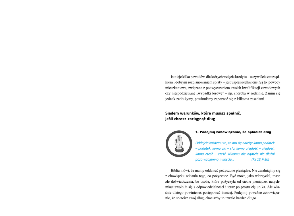 Istnieje kilka powodów, dla których wzięcie kredytu – oczywiście z rozsądkiem i dobrym rozplanowaniem spłaty – jest usprawiedliwione. Są to: powody mieszkaniowe, związane z podwyższeniem swoich kwalifikacji zawodowych czy niespodziewane „wypadki losowe” – np. choroba w rodzinie. Zanim się jednak zadłużymy, powinniśmy zapoznać się z kilkoma zasadami. Siedem warunków, które musisz spełnić, jeśli chcesz zaciągnąć dług 1. Podejmij zobowiązanie, że spłacisz dług Oddajcie każdemu to, co mu się należy: komu podatek – podatek, komu cło – cło, komu uległość – uległość, komu cześć – cześć. Nikomu nie bądźcie nic dłużni poza wzajemną miłością... (Rz 13,7-8a) Biblia mówi, że mamy oddawać pożyczone pieniądze. Nie zwalniajmy się z obowiązku oddania tego, co pożyczone. Być może, jako wierzyciel, masz złe doświadczenia, bo osoba, która pożyczyła od ciebie pieniądze, natychmiast zwolniła się z odpowiedzialności i teraz po prostu cię unika. Ale właśnie dlatego powinieneś postępować inaczej. Podejmij poważne zobowiązanie, że spłacisz swój dług, chociażby to trwało bardzo długo. 154 Uzdrowienie finansów 2. Przestrzegaj Zasady Gwarancji Zobowiązania Nie przebywaj z tymi, którzy podają rękę, poręczając za zaciągnięte długi, bo jeżeli nie masz czym zapłacić, zabiorą łóżko spod ciebie. (Prz 22,26-27) Nie podejmuj zobowiązania, nie mając możliwości jego spłaty. Zasada ta jest łamana na przykład wtedy, gdy kupujesz nowy samochód w kredycie na 100 procent. Wiadomo jest, że gdy wyjedziesz tym samochodem na ulicę, będzie już wtedy wart tylko 80 procent. Zasada ta została złamana przez banki, które zaczęły udzielać kredytów na meble oraz wszelkie wyposażenie bez „udziału własnego”. Dzisiaj, w sytuacji kredytu we frankach, ta reguła jest złamana u wielu kredytobiorców, bo wartość nieruchomości wynosi na przykład 600 000 zł, a kredyt we frankach wzrósł do 800 000 zł. W sytuacji, gdy w wypadku szkody i po spieniężeniu wszystkiego, co pozostało po danej rzeczy, uzyskane środki nie wystarczają na dług, oznacza to, że została złamana zasada gwarantowanego zobowiązania. Dzisiaj banki sprzedają pakietowo takie niespłacone kredyty hipoteczne firmom windykacyjnym. Odbyły się już trzy takie transakcje na ponad 800 mln zł każda. Wkrótce w miejscach, gdzie będą zaledwie „lekkie” kłopoty z regulowaniem należności, rozpocznie się „rzeź”. Zanim się zadłużysz... 155 do windykacji. A najwięcej problemów z powodu nagłych spłat kredytów mają właśnie poręczyciele, którzy zobowiązani są spłacać ponad 50 procent poręczonych kredytów. Mój znajomy ma brata, który nigdy nie uczył się żadnego obcego języka, a już prawie dziesięć lat mieszka w Anglii. Jest emigrantem i wcale nie dlatego, że tak pałał chęcią podróżowania po świecie. Zawiodła go tam konieczność spłaty długów. Jego gospodarstwo zostało zlicytowane dlatego, że zdecydował się zostać czyimś poręczycielem. Musiał spłacać nie swoje długi. Była to pierwsza licytacja w tej miejscowości. Ich ojciec bardzo przeżywał, kiedy była licytowana „ojcowizna”. Kiedy już zdecydujesz się żyrować, kontroluj osobę, której kredyt poręczałeś. Zdarza się bowiem, że osoby te żyją ponad stan, nie pilnują spłat i w rezultacie to ty musisz spłacać ich długi. Chwytem marketingowym ze strony banków jest udzielanie kredytów bez poręczeń – nawet bez zgody współmałżonka. Wszystko po to, byś mógł „zadłużyć się po cichu”. Kiedy łamiemy zasadę: „Mąż i żonka, to jedna kieszonka”, może się okazać, że małżonek nabrał wiele pożyczek bez twojej wiedzy. Moim zdaniem nie jest to uczciwe z punktu widzenia moralności, prawnie jednak ustawa już takie pożyczki dopuszcza. Istnieje również „poręczenie solidarne”. Termin ten oznacza, że bank wyegzekwuje spłatę długu od tego żyranta, od którego będzie najłatwiej to uczynić. Warto podkreślić, że poręczanie kredytów i pożyczek jest najczęściej łamanym punktem z zasad biblijnych. 3. Nigdy nie żyruj pożyczek 4. Staraj się nie podejmować zobowiązań Człowiekiem bezrozumnym jest ten, kto pochopnie ręczy za bliźniego. (Prz 17,18) W jakiej sytuacji bank prosi o poręczyciela? Kiedy nie masz zdolności kredytowej. Tylko że ty jesteś przekonany, że tę zdolność kredytową masz... Co oznacza instytucja poręczenia? Instytucja poręczenia w bankach oznacza, że bank nie ma do ciebie zaufania jako do partnera i prosi o przedstawienie żyrantów. 80 procent kredytów, które są zabezpieczone poręczeniami, trafia jedynie w oparciu o przyszłe dochody Nie przechwalaj się tym, co będzie jutro, bo nie wiesz, co zdarzy się dzisiaj. (Prz 27,1) Jeżeli wcześniej nic nie zaoszczędziłeś i liczysz jedynie na to, że (być może!) będziesz więcej zarabiał, nie możesz zaciągnąć kredytu. Co zrobisz, jeśli zarobki nie wzrosną, a ty staniesz przed koniecznością spłaty raty kredytu? 156 Uzdrowienie finansów 5. Nigdy nie wystawiaj na niebezpieczeństwo 157 Zanim się zadłużysz... Przeanalizuj, jak długo chcesz spłacać kredyt i jak dużo odsetek chcesz zapłacić! własnej rodziny Jeśli ktoś nie troszczy się o swoich, zwłaszcza o domowników, ten odszedł od wiary i gorszy jest od niewierzącego. (1 Tm 5,8) Pan Bóg w Piśmie Świętym przestrzega przed zaniedbywaniem swoich bliskich. W tej przestrodze zawiera się też zasada, aby nie dać się skusić propozycji pożyczek czy kredytów bez zgody współmałżonka. Dotyczy to też niepłacenia alimentów. 6. Unikaj zadłużenia konsumenckiego Nikomu nie bądźcie nic dłużni oprócz wzajemnej miłości. Ten bowiem, kto miłuje bliźniego, wypełnił Prawo. (Rz 13,8) Dobrze planując, zidentyfikujesz wydatki okresowe, na które powinieneś przygotować się przez oszczędności, a nie ich