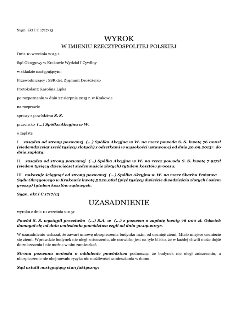 Sygn. akt I C 1717/13 WYROK W IMIENIU RZECZYPOSPOLITEJ POLSKIEJ Dnia 10 września 2015 r. Sąd Okręgowy w Krakowie Wydział I Cywilny w składzie następującym: Przewodniczący : SSR del. Zygmunt Drożdżejko Protokolant: Karolina Lipka po rozpoznaniu w dniu 27 sierpnia 2015 r. w Krakowie na rozprawie sprawy z powództwa S. S. przeciwko (...) Spółka Akcyjna w W. o zapłatę I. zasądza od strony pozwanej (...) Spółka Akcyjna w W. na rzecz powoda S. S. kwotę 76 000zł (siedemdziesiąt sześć tysięcy złotych) z odsetkami w wysokości ustawowej od dnia 30.09.2013r. do dnia zapłaty; II. zasądza od strony pozwanej (...) Spółka Akcyjna w W. na rzecz powoda S. S. kwotę 7 917zł (siedem tysięcy dziewięćset siedemnaście złotych) tytułem kosztów procesu; III. nakazuje ściągnąć od strony pozwanej (...) Spółka Akcyjna w W. na rzecz Skarbu Państwa – Sądu Okręgowego w Krakowie kwotę 5 220,08zł (pięć tysięcy dwieście dwadzieścia złotych i osiem groszy) tytułem kosztów sądowych. Sygn. akt I C 1717/13 UZASADNIENIE wyroku z dnia 10 września 2015r. Powód S. S. wystąpił przeciwko (...) S.A. w (...) z pozwem o zapłatę kwoty 76 000 zł. Odsetek domagał się od dnia wniesienia powództwa czyli od dnia 30.09.2013r. W uzasadnieniu wskazał, że zawarł umowę ubezpieczenia budynku m.in. od osunięć ziemi. Miało miejsce osuniecie się ziemi. Wprawdzie budynek nie uległ zniszczeniu, ale osuwisko jest na tyle blisko, że w każdej chwili może dojść do zniszczenia i nie można w nim zamieszkać. Strona pozwana wniosła o oddalenie powództwa podnosząc, że budynek nie uległ zniszczeniu, a ubezpieczenie nie obejmowało ryzyka nie możliwości zamieszkania w domu. Sąd ustalił następujący stan faktyczny: Powód S. S. zawarł ze stroną pozwaną (...) S.A. w W. w dniu 7.12.2009r. umowę ubezpieczenia (...). Ubezpieczenie obejmowało okres od 22.12.2009r. do 21.12.2010r. i dotyczyło budynku nr (...) położonego w miejscowości K.. Suma ubezpieczenia wynosiła 130000 zł. Ubezpieczenie obejmowało ryzyka od zdarzeń losowych m. in. od osuwania się ziemi (§ 5.1.1) - ogólnych warunków ubezpieczenia). Zgodnie z § 2.68) ogólnych warunków ubezpieczenia za szkodę rzeczową uważa się utratę lub zmniejszenie wartości rzeczy wskutek ich zniszczenia, uszkodzenia lub zaboru w następstwie zdarzeń objętych umową ubezpieczenia. Wysokość szkody mogła być ustalona wg. wartości nowej lub wg. wartości rzeczywistej. W umowie nie określono wariantu ustalania wysokości szkody. W dniach 1-4.06.2010r. w miejscowości K. doszło do uaktywnienia się osuwiska. Teren osuwiska oraz strefa buforowa wraz z budynkiem objętym ubezpieczeniem czyli budynkiem nr (...), z uwagi na bezpośrednie zagrożenie, nie może być użytkowany jako zabudowa mieszkalna. Osuwisko stwarza realne zagrożenie dla życia mieszkańców budynku nr (...). Brak jest technicznych możliwości zabezpieczenia osuwiska. Decyzją z dnia 29.09.2010r. Powiatowy Inspektor Nadzoru Budowlanego wyłączył w trybie natychmiastowym z użytkowania budynek nr (...) posadowiony na działce nr (...) w miejscowości K.. Decyzji nadano rygor natychmiastowej wykonalności. Podstawą decyzji był fakt wystąpienia osuwiska, które realnie zagraża życiu mieszkańcom przedmiotowego budynku. Wysokość szkody wynosi 471 815,38 zł wg. cen z dnia 29.09.2010r. i 483 900,07 zł wg. cen z 2014r. Możliwa do odzyskania wartość materiałów to kwota 2053,41 zł. Koszt rozbiórki budynku to kwota 75 424,77 zł. Powód składał wniosek o wypłatę ubezpieczenia, ale strona pozwana odmówiła jego wypłaty. Dowód: umowa ubezpieczenia k.20-21 ogólne warunki ubezpieczenia k.53-68 Karta dokumentacji osuwiska k.10-14 Opinia k.15 Decyzja k.16-17 Opinia biegłego k.95-118, 192-193, 205-418 Akta szkodowe Ocena dowodów: Sąd uznał opinię biegłego za przekonującą. Biegły uwzględnił całość materiału dowodowego. Biegły w sposób przekonujący odniósł się do zgłoszonych zarzutów. Sąd dał wiarę wszystkim dokumentom zgromadzonym w sprawie, albowiem nikt nie kwestionował ich prawdziwości. Sąd zważył co następuje: Roszczenie jest uzasadnione. Zgodnie z art. 805 § 1 i § 2.pkt 1) kc przez umowę ubezpieczenia ubezpieczyciel zobowiązuje się, w zakresie działalności swego przedsiębiorstwa, spełnić określone świadczenie w razie zajścia przewidzianego w umowie wypadku, a ubezpieczający zobowiązuje się zapłacić składkę. Świadczenie ubezpieczyciela polega w szczególności na zapłacie: przy ubezpieczeniu majątkowym - określonego odszkodowania za szkodę powstałą wskutek przewidzianego w umowie wypadku. Zgodnie § 5.1.1) - ogólnych warunków ubezpieczenia, ubezpieczenie obejmowało ryzyko powstania szkody wskutek osunięcia się ziemi. Jak wynika z ustalonego stanu faktycznego, w przedmiotowej sprawie, w okresie ubezpieczenia, doszło do wystąpienia osuwiska. Nie doszło do zniszczenia lub uszkodzenia budynku objętego ubezpieczeniem. Powstało realne, bezpośrednie zagrożenia zniszczenia budynku. W okresie ubezpieczenia Powiatowy Inspektor Nadzoru Budowlanego wyłączył w trybie natychmiastowym z użytkowania ubezpieczony budynek. Decyzji nadano rygor natychmiastowej wykonalności. Podstawą decyzji był fakt wystąpienia osuwiska, które realnie zagraża życiu mieszkańcom przedmiotowego budynku. Istota sporu sprowadzała się do ustalenia czy ubezpieczyciel odpowiada tylko w sytuacji, gdy doszło do uszkodzenia budynku, czy też w sytuacji, gdy doszło do bezpośredniego zagrożenia zniszczenia budynku. Zgodnie z § 2.68) ogólnych warunków ubezpieczenia za szkodę rzeczową uważa się utratę lub zmniejszenie wartości rzeczy wskutek ich zniszczenia, uszkodzenia lub zaboru w następstwie zdarzeń objętych umową ubezpieczenia. Dosłowne rozumienie tego postanowienia ogólnych warunków ubezpieczenia nie pozostawia wątpliwości, że tylko uszkodzenie lub zniszczenie mienia