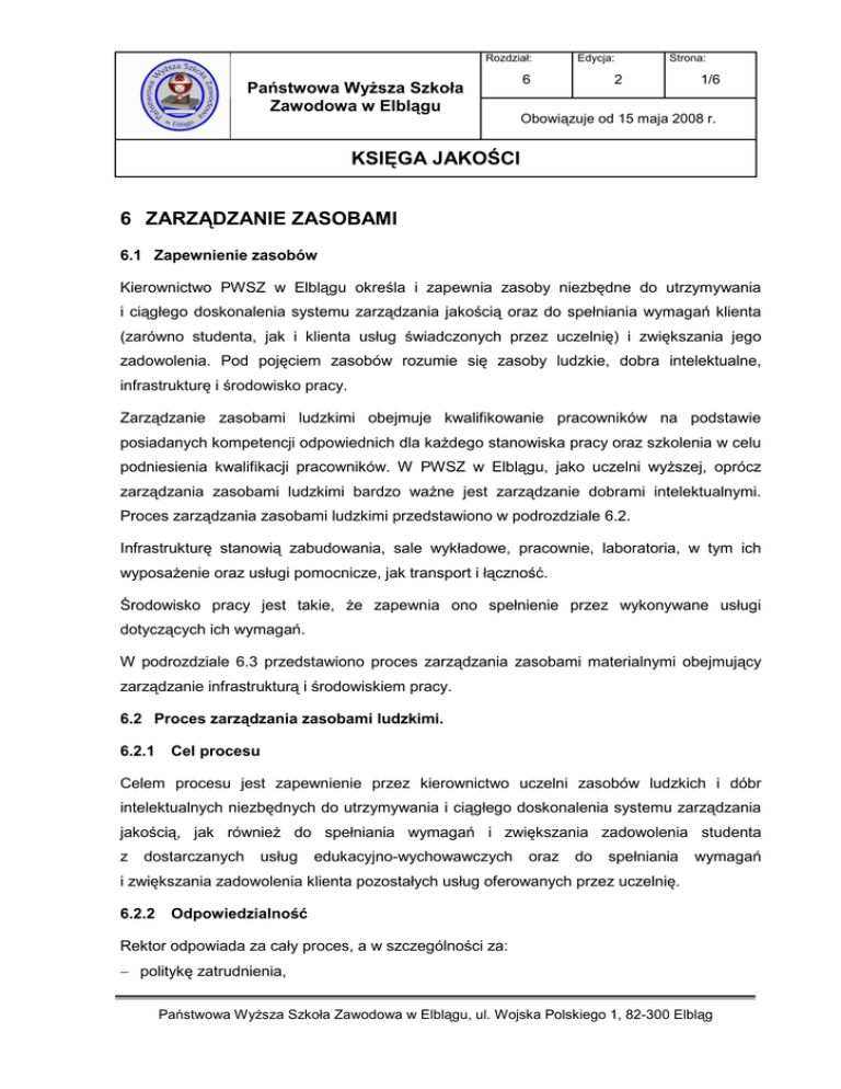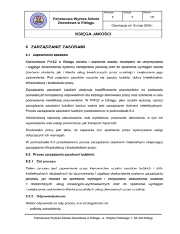 Rozdział: Państwowa WyŜsza Szkoła Zawodowa w Elblągu Edycja: 6 Strona: 2 1/6 Obowiązuje od 15 maja 2008 r. KSIĘGA JAKOŚCI 6 ZARZĄDZANIE ZASOBAMI 6.1 Zapewnienie zasobów Kierownictwo PWSZ w Elblągu określa i zapewnia zasoby niezbędne do utrzymywania i ciągłego doskonalenia systemu zarządzania jakością oraz do spełniania wymagań klienta (zarówno studenta, jak i klienta usług świadczonych przez uczelnię) i zwiększania jego zadowolenia. Pod pojęciem zasobów rozumie się zasoby ludzkie, dobra intelektualne, infrastrukturę i środowisko pracy. Zarządzanie zasobami ludzkimi obejmuje kwalifikowanie pracowników na podstawie posiadanych kompetencji odpowiednich dla kaŜdego stanowiska pracy oraz szkolenia w celu podniesienia kwalifikacji pracowników. W PWSZ w Elblągu, jako uczelni wyŜszej, oprócz zarządzania zasobami ludzkimi bardzo waŜne jest zarządzanie dobrami intelektualnymi. Proces zarządzania zasobami ludzkimi przedstawiono w podrozdziale 6.2. Infrastrukturę stanowią zabudowania, sale wykładowe, pracownie, laboratoria, w tym ich wyposaŜenie oraz usługi pomocnicze, jak transport i łączność. Środowisko pracy jest takie, Ŝe zapewnia ono spełnienie przez wykonywane usługi dotyczących ich wymagań. W podrozdziale 6.3 przedstawiono proces zarządzania zasobami materialnymi obejmujący zarządzanie infrastrukturą i środowiskiem pracy. 6.2 Proces zarządzania zasobami ludzkimi. 6.2.1 Cel procesu Celem procesu jest zapewnienie przez kierownictwo uczelni zasobów ludzkich i dóbr intelektualnych niezbędnych do utrzymywania i ciągłego doskonalenia systemu zarządzania jakością, jak równieŜ do spełniania wymagań i zwiększania zadowolenia studenta z dostarczanych usług edukacyjno-wychowawczych oraz do spełniania wymagań i zwiększania zadowolenia klienta pozostałych usług oferowanych przez uczelnię. 6.2.2 Odpowiedzialność Rektor odpowiada za cały proces, a w szczególności za: − politykę zatrudnienia, Państwowa WyŜsza Szkoła Zawodowa w Elblągu, ul. Wojska Polskiego 1, 82-300 Elbląg Rozdział: Państwowa WyŜsza Szkoła Zawodowa w Elblągu Edycja: 6 Strona: 2 2/6 Obowiązuje od 15 maja 2008 r. KSIĘGA JAKOŚCI − podejmowanie decyzji o potrzebie stworzenia nowych stanowisk pracy, − prowadzenie rozmów kwalifikacyjnych, − podejmowanie decyzji o szkoleniach pracowników. Dyrektorzy Instytutów i kierownicy innych jednostek organizacyjnych odpowiadają za: − zgłaszanie potrzeb odnośnie zatrudnienia pracowników, − zgłaszanie potrzeb szkoleniowych. Pełnomocnik ds. Systemu Zarządzania Jakością odpowiada za prowadzenie szkoleń związanych z systemem zarządzania jakością. Dział Osobowy odpowiada za: − przyjmowanie wniosków o zatrudnienie, − prowadzenie rejestru szkoleń pracowników, − przechowywanie zapisów dotyczących szkoleń oraz kwalifikacji pracowników. 6.2.3 Postępowanie a) Zatrudnianie pracowników Nowo zatrudniani pracownicy są kwalifikowani na podstawie wykształcenia, wyszkolenia i doświadczenia odpowiedniego dla stanowiska pracy, na którym mają być zatrudnieni. Minimalne kompetencje wymagane dla zatrudnienia na danym stanowisku pracy są określone w: − ustawie Prawo o szkolnictwie wyŜszym, − rozporządzeniu ministra właściwego do spraw szkolnictwa wyŜszego w sprawie warunków wynagradzania za pracę i przyznawania innych świadczeń związanych z pracą dla pracowników zatrudnionych w uczelni publicznej, − statucie PWSZ w Elblągu. Sposób postępowania przy zatrudnianiu pracowników jest określony: − w statucie uczelni, − w zarządzeniu Rektora w sprawie procedury zatrudniania pracowników oraz zawierania umów cywilnoprawnych z nauczycielami akademickimi. Państwowa WyŜsza Szkoła Zawodowa w Elblągu, ul. Wojska Polskiego 1, 82-300 Elbląg Rozdział: Państwowa WyŜsza Szkoła Zawodowa w Elblągu Edycja: 6 Strona: 2 3/6 Obowiązuje od 15 maja 2008 r. KSIĘGA JAKOŚCI b) Szkolenia Cały personel zaangaŜowany w działania mające wpływ na jakość jest objęty szkoleniami w zakresie takim, jak to wynika z aktualnych potrzeb. Tryb postępowania w tym zakresie określają: - zarządzenie w sprawie trybu dofinansowania wyjazdów na konferencje, - zarządzenie w sprawie trybu dofinansowania wyjazdów na szkolenia. Ponadto przewidywane na dany rok kalendarzowy koszty szkoleń i konferencji ujmowane są w planie rzeczowo – finansowym stosownie do postanowień zarządzenia w sprawie sporządzania planu rzeczowo – finansowego, planu zamówień oraz procedur dokonywania zakupów. Po zakończeniu szkolenia pracownik przedstawia pracownikowi Działu Osobowego zaświadczenie o ukończeniu szkolenia i dostarcza jego kopię. Pracownik Działu Osobowego odnotowuje fakt odbycia szkolenia w rejestrze szkoleń na formularzu F6/1, a kopię zaświadczenia przechowuje w aktach osobowych pracownika. Szkolenia związane z systemem zarządzania jakością prowadzone są, niezaleŜnie od tego, czy były planowane tak, aby Ŝaden pracownik nieprzeszkolony nie wykonywał prac mających wpływ na jakość. Szkolenia te prowadzi Pełnomocnik ds. Systemu Zarządzania Jakością. c) W Inne dokumenty związane zakresie procesu zarządzania zasobami ludzkimi oprócz wymienionych wyŜej wewnętrznych aktów normatywnych mają zastosowanie następujące zarządzenia Rektora: − w sprawie zasad hospitacji zajęć dydaktycznych prowadzonych w PWSZ w Elblągu, − w sprawie ustalenia wzoru arkusza okresowej oceny nauczyciela akademickiego PWSZ w Elblągu, − w sprawie powołania komisji ds. oceny okresowej nauczycieli akademickich, − w sprawie zasad okresowego zwiększania wynagrodzeń pracowników, − w sprawie zakładowego regulaminu premiowania pracowników niebędących nauczycielami akademickimi, − w sprawie szczegółowych zasad szkolenia w dziedzinie bhp, − w sprawie powołania pełnomocnika ds. ochrony informacji niejawnych w uczelni, Państwowa WyŜsza Szkoła Zawodowa w Elblągu