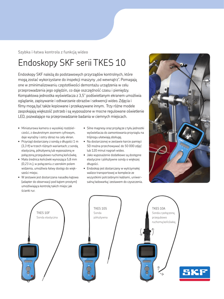 Szybka i łatwa kontrola z funkcją wideo Endoskopy SKF serii TKES 10 Endoskopy SKF należą do podstawowych przyrządów kontrolnych, które mogą zostać wykorzystane do inspekcji maszyny „od wewnątrz”. Pomagają one w zminimalizowaniu częstotliwości demontażu urządzenia w celu przeprowadzenia jego oględzin, co daje oszczędność czasu i pieniędzy. Kompaktowa jednostka wyświetlacza z 3,5” podświetlanym ekranem umożliwia oglądanie, zapisywanie i odtwarzanie obrazów i sekwencji wideo. Zdjęcia i filmy mogą być także kopiowane i przekazywane innym. Trzy różne modele zaspokajają większość potrzeb i są wyposażone w mocne regulowane oświetlenie LED, pozwalające na przeprowadzanie badania w ciemnych miejscach. • Miniaturowa kamera o wysokiej rozdzielczości, z dwukrotnym zoomem cyfrowym, daje wyraźny i ostry obraz na cały ekran. • Przyrząd dostarczany z sondą o długości 1 m (3,3 ft) w trzech różnych wariantach; z sondą elastyczną, półsztywną lub wyposażoną w połączoną przegubowo ruchomą końcówkę. • Mała średnica końcówki wynosząca 5,8 mm (0,23 in.), w połączeniu z szerokim polem widzenia, umożliwia łatwy dostęp do większości miejsc. • W zestawie jest dostarczana nasadka kątowa (adapter do obserwacji pod kątem prostym) umożliwiająca kontrolę takich miejsc jak ścianki rur. TKES 10F Sonda elastyczna • Silne magnesy oraz przyłącze z tyłu jednostki wyświetlacza do zamontowania przyrządu na trójnogu ułatwiają obsługę. • Na dostarczonej w zestawie karcie pamięci SD można przechowywać do 50 000 zdjęć lub 120 minut nagrań wideo. • Jako wyposażenie dodatkowe są dostępne elastyczne i półsztywne sondy o większej długości. • Endoskop jest dostarczany w wytrzymałej walizce transportowej w komplecie ze wszystkimi potrzebnymi kablami, uniwersalną ładowarką i zestawem do czyszczenia. TKES 10S TKES 10A Sonda półsztywna Sonda z połączoną przegubowo ruchomą końcówką Dane techniczne Oznaczenie TKES 10F TKES 10S TKES 10A Sonda i źródło światła Sonda elastyczna Sonda półsztywna Sonda z połączoną przegubowo ruchomą końcówką Czujnik obrazu Czujnik obrazu o strukturze CMOS Czujnik obrazu o strukturze CMOS Czujnik obrazu o strukturze CMOS Rozdzielczość (H ™ V) – Statyczna – Dynamiczna 640 ™ 480 pikseli 320 ™ 240 pikseli 640 ™ 480 pikseli 320 ™ 240 pikseli 320 ™ 240 pikseli 320 ™ 240 pikseli Średnica końcówki (sondy) 5,8 mm (0.23 in.) 5,8 mm (0.23 in.) 5,8 mm (0.23 in.) Długość sondy 1 m (39.4 in.) 1 m (39.4 in.) 1 m (39.4 in.) Pole widzenia 67° 67° 55° Głębia ostrości 1,5–6 cm (0.6–2.4 in.) 1,5–6 cm (0.6–2.4 in.) 2–6 cm (0.8–2.4 in.) Źródło światła 4 białe regulowane diody świecące (LED) (0–275 Lux/4 cm) 4 białe regulowane diody świecące (LED) (0–275 Lux/4 cm) 4 białe regulowane diody świecące (LED) (0–275 Lux/4 cm) Temperatura pracy sondy –20 do +60 °C (–4 do +140 °F) –20 do +60 °C (–4 do +140 °F) –20 do +60 °C (–4 do +140 °F) Współczynnik ochrony IP 67 IP 67 IP 67 Jednostka wyświetlacza Zasilanie 5 V DC Wyświetlacz Monitor 320 ™ 240 pikseli 3,5” TFT LCD Interfejs Mini USB 1.1 / wyjście AV / wejście AV/ Bateria Doładowywana bateria litowo-polimerowa (3,7 V). Zazwyczaj 4 godziny pracy po 2 godzinach ładowania. Format wyjścia wideo NTSC i PAL Nośnik do nagrywania Dostarczona w zestawie karta SD 2 GB – pojemność pamięci ± 50 000 zdjęć lub 120 minut nagrania wideo. (Mogą być używane karty SD/SDHC o pojemności do 32 GB). Rozdzielczość wyjściowa (H x V) – Obraz nieruchomy (JPEG) – Format nagrania wideo (ASF) 640 ™ 480 pikseli 320 ™ 240 pikseli Zakres temperatury – Praca i przechowywanie – Zakres temperatury ładowania baterii -20 do +60 °C (–4 do +140 °F) 0 do 40 °C (32 do 104 °F) Funkcje Zdjęcie migawkowe, nagrywanie wideo, przegląd obrazów i nagrań wideo na ekranie LCD, wyjście telewizyjne, przesyłanie obrazów i nagrań wideo z karty SD do komputera ®SKF jest zarejestrowanym znakiem handlowym Grupy SKF. ©Grupa SKF 2013 Zawartość niniejszej publikacji jest chroniona prawem autorskim i nie może być powielana (również we fragmentach) bez uprzedniego uzyskania pisemnego pozwolenia. Wydawca podjął wszelkie starania, aby informacje zawarte w publikacji były dokładne i prawdziwe, jednak nie ponosi żadnej odpowiedzialności za jakiekolwiek straty lub szkody, zarówno bezpośrednie, pośrednie, jak i wtórne, powstałe w wyniku korzystania z informacji zawartych w niniejszej publikacji. PUB MP/P8 12209 PL · Grudzień 2013 www.mapro.skf.com · skf.com/mount · skf.com/lubrication
