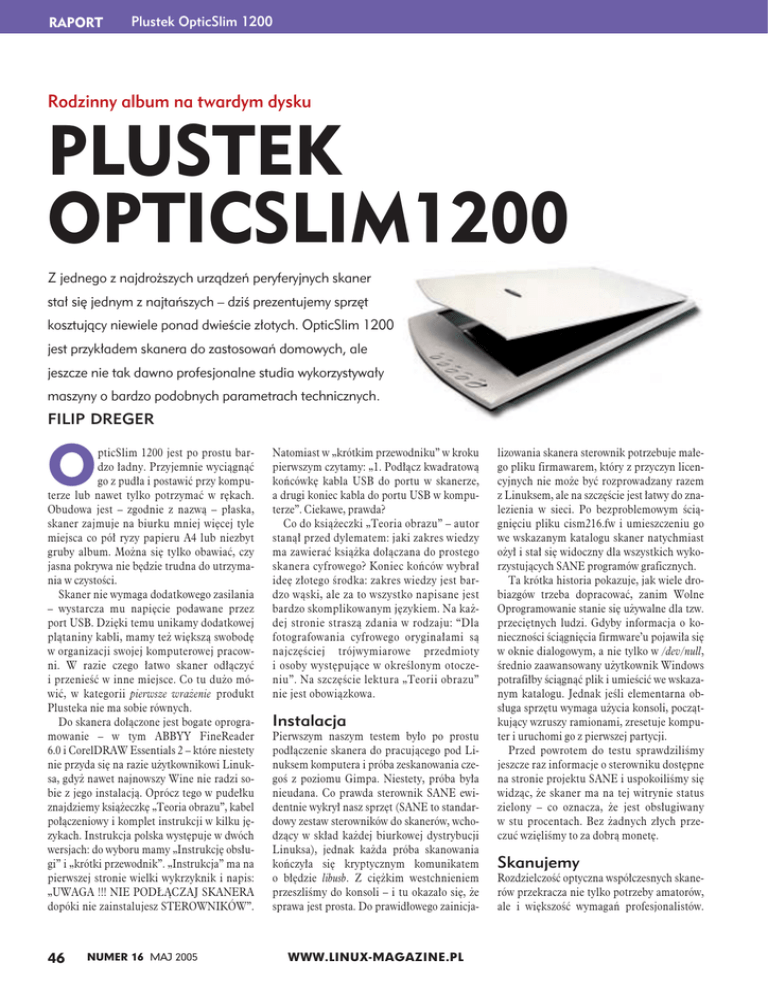 RAPORT Plustek OpticSlim 1200 Rodzinny album na twardym dysku PLUSTEK OPTICSLIM1200 Z jednego z najdroższych urządzeń peryferyjnych skaner stał się jednym z najtańszych – dziś prezentujemy sprzęt kosztujący niewiele ponad dwieście złotych. OpticSlim 1200 jest przykładem skanera do zastosowań domowych, ale jeszcze nie tak dawno profesjonalne studia wykorzystywały maszyny o bardzo podobnych parametrach technicznych. FILIP DREGER O pticSlim 1200 jest po prostu bardzo ładny. Przyjemnie wyciągnąć go z pudła i postawić przy komputerze lub nawet tylko potrzymać w rękach. Obudowa jest – zgodnie z nazwą – płaska, skaner zajmuje na biurku mniej więcej tyle miejsca co pół ryzy papieru A4 lub niezbyt gruby album. Można się tylko obawiać, czy jasna pokrywa nie będzie trudna do utrzymania w czystości. Skaner nie wymaga dodatkowego zasilania – wystarcza mu napięcie podawane przez port USB. Dzięki temu unikamy dodatkowej plątaniny kabli, mamy też większą swobodę w organizacji swojej komputerowej pracowni. W razie czego łatwo skaner odłączyć i przenieść w inne miejsce. Co tu dużo mówić, w kategorii pierwsze wrażenie produkt Plusteka nie ma sobie równych. Do skanera dołączone jest bogate oprogramowanie – w tym ABBYY FineReader 6.0 i CorelDRAW Essentials 2 – które niestety nie przyda się na razie użytkownikowi Linuksa, gdyż nawet najnowszy Wine nie radzi sobie z jego instalacją. Oprócz tego w pudełku znajdziemy książeczkę „Teoria obrazu”, kabel połączeniowy i komplet instrukcji w kilku językach. Instrukcja polska występuje w dwóch wersjach: do wyboru mamy „Instrukcję obsługi” i „krótki przewodnik”. „Instrukcja” ma na pierwszej stronie wielki wykrzyknik i napis: „UWAGA !!! NIE PODŁĄCZAJ SKANERA dopóki nie zainstalujesz STEROWNIKÓW”. 46 NUMER 16 MAJ 2005 Natomiast w „krótkim przewodniku” w kroku pierwszym czytamy: „1. Podłącz kwadratową końcówkę kabla USB do portu w skanerze, a drugi koniec kabla do portu USB w komputerze”. Ciekawe, prawda? Co do książeczki „Teoria obrazu” – autor stanął przed dylematem: jaki zakres wiedzy ma zawierać książka dołączana do prostego skanera cyfrowego? Koniec końców wybrał ideę złotego środka: zakres wiedzy jest bardzo wąski, ale za to wszystko napisane jest bardzo skomplikowanym językiem. Na każdej stronie straszą zdania w rodzaju: “Dla fotografowania cyfrowego oryginałami są najczęściej trójwymiarowe przedmioty i osoby występujące w określonym otoczeniu”. Na szczęście lektura „Teorii obrazu” nie jest obowiązkowa. Instalacja Pierwszym naszym testem było po prostu podłączenie skanera do pracującego pod Linuksem komputera i próba zeskanowania czegoś z poziomu Gimpa. Niestety, próba była nieudana. Co prawda sterownik SANE ewidentnie wykrył nasz sprzęt (SANE to standardowy zestaw sterowników do skanerów, wchodzący w skład każdej biurkowej dystrybucji Linuksa), jednak każda próba skanowania kończyła się kryptycznym komunikatem o błędzie libusb. Z ciężkim westchnieniem przeszliśmy do konsoli – i tu okazało się, że sprawa jest prosta. Do prawidłowego zainicja- WWW.LINUX-MAGAZINE.PL lizowania skanera sterownik potrzebuje małego pliku firmawarem, który z przyczyn licencyjnych nie może być rozprowadzany razem z Linuksem, ale na szczęście jest łatwy do znalezienia w sieci. Po bezproblemowym ściągnięciu pliku cism216.fw i umieszczeniu go we wskazanym katalogu skaner natychmiast ożył i stał się widoczny dla wszystkich wykorzystujących SANE programów graficznych. Ta krótka historia pokazuje, jak wiele drobiazgów trzeba dopracować, zanim Wolne Oprogramowanie stanie się używalne dla tzw. przeciętnych ludzi. Gdyby informacja o konieczności ściągnięcia firmware’u pojawiła się w oknie dialogowym, a nie tylko w /dev/null, średnio zaawansowany użytkownik Windows potrafiłby ściągnąć plik i umieścić we wskazanym katalogu. Jednak jeśli elementarna obsługa sprzętu wymaga użycia konsoli, początkujący wzruszy ramionami, zresetuje komputer i uruchomi go z pierwszej partycji. Przed powrotem do testu sprawdziliśmy jeszcze raz informacje o sterowniku dostępne na stronie projektu SANE i uspokoiliśmy się widząc, że skaner ma na tej witrynie status zielony – co oznacza, że jest obsługiwany w stu procentach. Bez żadnych złych przeczuć wzięliśmy to za dobrą monetę. Skanujemy Rozdzielczość optyczna współczesnych skanerów przekracza nie tylko potrzeby amatorów, ale i większość wymagań profesjonalistów. OpticSlim 1200 potrafi skanować w rozdzielczości 600x1200 dpi, a w praktyce nie powinniśmy raczej potrzebować powyżej 300 dpi. W pierwszej fazie testu postawiliśmy przed skanerem kilka zadań typowych dla zastosowań domowych. Skanowaliśmy zdjęcia do umieszczenia na witrynie WWW lub wysłania e-mailem (w rozdzielczości 72 dpi) oraz zdjęcia, obrazki i szkice do wydrukowania w gazetce lub broszurce (300 dpi). W każdym wypadku byliśmy zadowoleni z wyników. Skaner radził sobie dobrze i z połyskliwym, i z chropowatym papierem. Obrazy uzyskane z OpticSlim 1200 miały dobrze odwzorowane barwy, nie było też problemów z kalibracją lub rozwarstwianiem się kolorów podstawowych. Praca urządzenia była cicha i w miarę szybka (znacznie szybsze skanery należą już do innej kategorii cenowej), a przede wszystkim – stabilna. Jedynym problemem była nieregulowana wysokość zaczepienia klapki skanera. Utrudnia to skanowanie grubszych książek i albumów. Schody zaczęły się, kiedy spróbowaliśmy zadań mniej typowych – na początek skanowania zdjęć w rozdzielczości 600 dpi. W pierwszej chwili wydawało się, że nastąpił błąd i skaner się zaciął. Potem okazało się, że przy pracy w rozdzielczości 600 dpi głowica nie porusza się jednostajnie w przód, tylko jeździ w tę i z powrotem wedle schematu: dwa kroki naprzód, jede