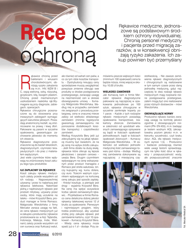 Wyposażenie R ękawice chronią przed bakteriami i wirusami chorobotwórczymi, obniżają ryzyko zakażenia się m.in.: HIV, WZW B i C, ospą wietrzną, odrą, różyczką, grzybicami, kiłą, liszajem płaskim. Chronią przed mechanicznym uszkodzeniem naskórka rąk.Wymagane są przy diagnozie, zabiegach, operacjach. Rękawice chirurgiczne przeznaczone są do stosowania przy inwazyjnych zabiegach wymagających warunków jałowych. Posiadają anatomiczny kształt, są zróżnicowane na prawą i lewą dłoń. Pakowane są parami w szczelne opakowania, gwarantujące zachowanie jałowości do momentu ich otwarcia. Rękawice diagnostyczne przeznaczone są do badań lekarskich, diagnostycznych, czynności terapeutycznych i do prac z materiałem septycznym. Jest wiele czynników które wpływają na zróżnicowany koszt zakupu tego typu produktów. ILE ZAPŁACIMY ZA RĘKAWICE Koszt zakupu rękawic medycznych zależy przede wszystkim od ich rodzaju. - Najpowszechniej używaną i przez to najtańszą jest rękawica lateksowa. Natomiast jedną z najdroższych rękawic jest produkt nitrylowy, używany przez osoby, które mają uczulenie na lateks – mówi Krzysztof Bera, product manager w firmie Romaco. Małgorzata Wierzbińska z firmy Mercator zwraca uwagę na fakt, że cena rękawic medycznych już w zakupie u producenta ( rękawice produkowane sa w Azji: Tajlandia, Indonezja, Malezja, Indie, Wietnam) zależy przede wszystkim od cen surowca oraz fluktuacji walut, 28 ale również od wahań cen paliw, a co za tym idzie kosztów transportu. - Dystrybutorzy kreujący ceny sprzedażowe muszą uwzględniać powyższe zmienne oferując swe produkty w drodze postępowania przetargowego, zwracając uwagę na niezmienność cen w okresie obowiązywania umowy – tłumaczy Małgorzata Wierzbińska. Według niej w przypadku zamówień nie związanych z procedurą przetargową, cena w znacznej mierze zależy od wielkości składanego zamówieni (minima logistyczne gwarantują zamawiającemu nie ponoszenie dodatkowych kosztów transportu) i częstotliwości zamówień. Według Krzysztofa Bery jeśli już zdecydujemy się na jakąś rękawicę musimy być świadomi, że na jej cenę ma wpływ źródło zakupu. - Jeśli firma działa na dużą skalę, rękawice które oferuje są lepsze jakościowo i zarazem cenowo – uważa Bera. Drugim czynnikiem wpływającym na cenę wskazywanym przez product managera z Romaco jest strefa walutowa, tzn. czy kupujemy wg. kursu dolara, czy euro. Trzecim ważnym czynnikiem wpływającym na końcową cenę zakupu jest sposób zapłaty. - Kredyt kosztuje, a pieniądz jest drogi – wyjaśnia Krzysztof Bera. Na cenę ma wpływ oczywiście liczba i jakość zamawianych rękawic. - Przykładowo w firmie Romaco cena detaliczna dobrej jakości rękawicy lateksowej wynosi 12 zł brutto za opakowanie. Pierwszym i najmniejszym progiem, który trzeba przekroczyć, aby uzyskać zniżkę przy zakupie rękawic jest zamówienie kartonu, czyli 10 opakowań – tłumaczy Krzysztof Bera. - Wtedy cena rękawicy może spaść już o 1 zł – dodaje. Przy za- 6/2010 mówieniu jeszcze większych ilości (minimum 100 opakowań) cena ta będzie niższa, mniej więcej w okolicy 10,00 zł brutto. WIELKOŚCI ZAMÓWIEŃ Jak tłumaczą nam w firmie Mercator rękawice diagnostyczne pakowane są najczęściej w opakowania jednostkowe po 100 sztuk; rękawice chirurgiczne w szczelnie zamknięte koperty po 1 parze. - Każde z tych rodzajów rękawic medycznych posiadają opakowania transportowe, tzw. kartony zbiorcze. Zamówienia w zależności od upodobań własnych zamawiającego opisywane są bądź w ilościach opakowań jednostkowych, bądź w ilościach opakowań zbiorczych – tłumaczy Małgorzata Wierzbińska. - W zależności od wielkości jednostki medycznej ilość zamawianego towaru jest różna – dodaje. Według niej zamówienia dokonywane są najczęściej z miesięczną czę- stotliwością. - Nie zawsze zamówienia rękawic diagnostycznych i chirurgicznych są realizowane w tym samym czasie przez daną jednostkę medyczną, gdyż najczęściej te dwa rodzaje rękawic medycznych mają rozpisane różne postępowania przetargowe, zatem mogą być one realizowane przez różnych dostawców – mówi Wierzbińska. OBOWIĄZUJĄCE NORMY Producenci rękawic bardzo zwracają uwagę na kontrolę jakości zgodnie z obowiązującymi normami (PN- EN 455), m.in. badając je testem wodnym AQL (akceptowalny poziom jakości m.in. w kierunku szczelności, czyli braku dziur; AQL dla rękawic medycznych wynosi 1,5). - Producenci i badacze poświęcają również wiele uwagi testom sprawdzającym nie tylko ilość dziur w rękawicy i przepuszczalność wody, ale przepuszczalność znacznie Fot. Mercator Medical SA Ręce pod ochroną Rękawice medyczne, jednorazowe są podstawowym środkiem ochrony indywidualnej. Chronią personel medyczny i pacjenta przed migracją zarazków, a w konsekwencji obniżają ryzyko zakażenia. Ich zakup powinien być przemyślany Wyposażenie mniejszych mikroorganizmów i patogenów, wykorzystując do tego celu tzw. Viral testy – tłumaczy Małgorzata Wierzbińska. Zamawiający może dokonać oceny jakości na podstawie dokumentów. Może również prosić o próbki rękawic. Jak informują nas w firmie Mercator normy odnoszące się do rękawic medycznych to: EN 980:2008 ;EN 1041:2008; EN 455-1:2000 ; EN 455-2:2000 ; EN 455-3:2006. Według Krzysztofa Bery nim jakaś placówka zamówi rękawice powinna mieć możliwość ich przetestowania. POSTĘP TECHNOLOGICZNY Najbardziej popularne- rękawice lateksowe, mogą powodować działania alergizujące, dlatego producenci poszukują innych rozwiązań. Małgorzata Wierzbińska wskazuje kilka kierunków poszukiwań związanych z korzystaniem z innego surowca, niż lateks kauczuku naturalnego. W grę wchodzą rękawice winylowe, rękawice nitrylowe, rękawice poliizoprenoweorazrękawiceneoprenowe. W Mercatorze informują nas, że wi