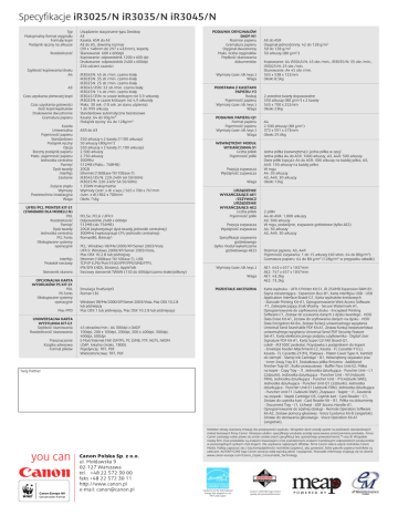 Specyfikacje iR3025/N iR3035/N iR3045/N Typ Maksymalny format oryginału Formaty kopii Podajnik ręczny na arkusze Rozdzielczość Szybkość kopiowania/druku A4 A3 Czas uzyskania pierwszej kopii Czas uzyskania gotowości Ilość kopii/wydruków Drukowanie dwustronne Gramatura papieru Kaseta Uniwersalna Pojemność papieru Standardowo Podajnik ręczny Opcja Boczny podajnik papieru Maks. pojemność papieru Jednostka centralna Pamięć Dysk twardy Interfejs Zasilanie Zużycie prądu Wymiary Powierzchnia instalacyjna Waga UFRII/PCL PRINTER KIT-S1 (STANDARD DLA MODELU N) PDL Rozdzielczość Pamięć Dysk twardy Jednostka centralna PCL Fonts Obsługiwane systemy operacyjne Interfejs Protokół sieciowy Sterownik skanera Urządzenie stacjonarne typu Desktop A3 Kaseta: A5R do A3 A3 do A5, dowolny rozmiar (99 x 148mm do 297 x 432mm), koperty Skanowanie: 600 x 600dpi Kopiowanie: odpowiednik 1200 x 600 dpi Drukowanie: odpowiednik 2400 x 600dpi 256 odcieni szarości iR3045N: 45 str./min. czarno-biały iR3035N: 35 str./min. czarno-biały iR3025N: 25 str./min. czarno-biały iR3045/35N: 22 str./min. czarno-biały iR3025N: 14 str./min. czarno-biały iR3045/35N: w czasie krótszym niż 3,9 sekundy iR3025N: w czasie krótszym niż 4,9 sekundy Maks. 30 sek. (10 sek. ze stanu uśpienia) 1 do 999 arkuszy Standardowe automatyczne bezstosowe Kaseta: 64 do 90g/m2 Podajnik ręczny: 64 do 128g/m2 A5R do A3 550 arkuszy x 2 kasety (1100 arkuszy) 50 arkuszy (80g/m2) 550 arkuszy x 2 kasety (1,100 arkuszy) 2.500 arkuszy 2.750 arkuszy 300Mhz 512MB (Maks.: 768MB) 20GB Ethernet (100Base-TX/10Base-T) iR3045/35/N: 220-240V 6A 50/60Hz iR3025/N: 220-240V 5A 50/60Hz 1.35kW maksymalnie Wymiary (szer. x dł. x wys.) 565 x 700 x 761mm (szer. x dł.) 862 x 700mm Około 74kg PCL5e, PCL6 i UFR II Odpowiednik 2400 x 600dpi 512MB (do 756MB) 20GB (wykorzystuje dysk twardy jednostki centralnej) 300MHz (wykorzystuje CPU jednostki centralnej) Roman80, Bitmap1 PCL: Windows 98/Me/2000/XP/Server 2003/Vista UFR II: Windows 2000/XP/Server 2003/Vista, Mac OSX 10.2.8 lub późniejszy Ethernet (100Base-TX/10Base-T), USB TCP/IP (LPD/Port 9100/IPP/IPPS/SMB/FTP), IPX/SPX (NDS, Bindery), AppleTalk Sieciowy sterownik TWAIN (150 do 600dpi/czarno-białe/półtony) PODAJNIK ORYGINAŁÓW DADF-N1 Rozmiar papieru Gramatura papieru Oryginał dwustronny Maks. liczba oryginałów Prędkość skanowania dokumentów Wymiary (szer./dł./wys.) Waga PODSTAWA Z KASETAMI PAPIERU-Y3 Rodzaj Pojemność papieru Wymiary (szer./dł./wys.) Waga PODAJNIK PAPIERU-Q1 Format papieru Pojemność papieru Wymiary (szer./dł./wys.) Waga WEWNĘTRZNY MODUŁ WYKAŃCZANIA-S1 Liczba półek Pojemność półki Pozycja zszywacza Wydajność zszywacza Waga URZĄDZENIE WYKAŃCZAJĄCE-AE1 /ZSZYWACZ URZĄDZENIE WYKAŃCZAJĄCE-AE2 Liczba półek Pojemność półki Pozycja zszywacza Wydajność zszywacza Specyfikacje zszywania grzbietowego (tylko moduł wykańczania grzbietowego AE2) Wymiary (szer./dł./wys.) Waga OPCJONALNA KARTA WYDRUKÓW PS KIT-S1 PDL PS Fonts Obsługiwane systemy operacyjne Mac-PPD UNIWERSALNA KARTA WYSYŁANIA KIT-G1 Szybkość skanowania Rozdzielczość skanowania Przeznaczenie Książka adresowa Format plików Emulacja PostScript3 Roman136 POZOSTAŁE AKCESORIA Windows 98/Me/2000/XP/Server 2003/Vista, Mac OSX 10.2.8 lub późniejszy Mac OS9.1 lub późniejszy, Mac OSX 10.2.8 lub późniejszy) 45 obrazów/min.: A4 300dpi z DADF 100dpi, 200 x 100dpi, 200dpi, 200 x 400dpi, 300dpi, 400dpi, 600dpi E-Mail/Internet FAX (SMTP), PC (SMB, FTP, NCP), iWDM LDAP, lokalna (maks. 1800) Pojedynczy: TIFF, PDF Wielostronicowy: TIFF, PDF Twój Partner A3 do A5R Oryginał jednostronny: 42 do 128 g/m2 50 do 128 g/m2 50 arkuszy (80 g/m2) Kopiowanie: A4 iR3045/N: 45 obr./min., iR3035/N: 35 obr./min., iR3025/N: 25 obr./min. Skanowanie: A4 45 obr./min. 565 x 538 x 122mm Około 8.5kg 2 przednie kasety dopasowalne 550 arkuszy (80 g/m2) x 2 kasety 565 x 700 x 252mm Około 23kg A4 2.500 arkuszy (80 g/m2) 372 x 591 x 473mm Około 29.6kg Jedna półka (wewnętrzna) i jedna półka w opcji Jedna półka A4 do A5R: 1000 arkuszy, A3, A4R: 500 arkuszy Dwie półki (opcja): A4 do A5R: 300 arkuszy na każdej półce, A3, A4R: 150 arkuszy na każdej półce W rogu A4: 50 arkuszy A3, A4R: 30 arkuszy Około 12kg 2 półki A4 do A5R: 1,000 arkuszy A3: 500 arkuszy W rogu, podwójnie, zszywanie grzbietowe (tylko AE2) A4: 50 arkuszy A3, A4R: 30 arkuszy Rozmiar papieru: A3, A4R Pojemność zszywania: 1 do 15 arkuszy (60 stron, 64 do 80g/m2) Gramatura papieru: 64 do 80 g/m2 (128g/m2 w przypadku okładki) AE1: 643 x 657 x 1037mm AE2: 747 x 657 x 1037mm AE1: 43.2kg AE2: 73.2kg Karta wydruku - UFR II Printer Kit-S1, iR 256MB Expansion RAM-B1, Szyna rozszerzająca - Expansion Bus-B1, Karta interfejsu USB - USB Application Interface Board-G1, Karta wydruków kreskowych - Barcode Printing Kit–A1, Oprogramowanie Web Access Software -F1, Zabezpieczający Znak Wodny - Secure Watermark-A1, Oprogramowanie do szyfrowania druku - Encrypted Printing Software-C1, Zestaw do usuwania danych z dysku twardego - HDD Data Erase Kit-A1, Zestaw do szyfrowania danych na dysku - HDD Data Encryption Kit-B4, Zestaw funkcji uniwersalnego wysyłania Universal Send Searchable PDF Kit-A1, Zestaw funkcji bezpeczeństwa uniwersalnego wysyłania-Universal Send PDF Security Feature Set-A1, Karta elektronicznego podpisu użytkownika - Digital User Signature PDF Kit-A1, Karta Super G3 FAX Board-Q1, cokół - iR3100C pedestal, Przystawka z podajnikiem do kopert - Envelope Feeder Attachment-C2, Kaseta - FL Cassette-Y1(L), Kaseta - FL Cassette-Z1(M), Pokrywa - Platen Cover Type H, Kartridż do stempli - Stamp Ink Cartridge – B1, Wewnętrzny separator prac - Inner 2way Tray-D1, Dodatkowa półka finiszera - Additional finisher Tray-B1, Bufor przepustowy - Buffer Pass Unit-E2, Półka na kopie - Copy Tray – J1, Jednostka dziurkująca - Puncher Unit – L1 (2dziurki), Jednostka dziurkująca - Puncher Unit – N1(4dziurki FRN), Jednostka dziurkując