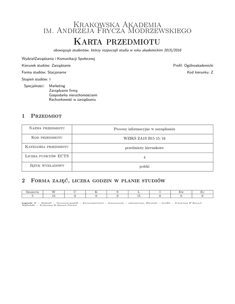 Krakowska Akademia im. Andrzeja Frycza Modrzewskiego Karta przedmiotu obowiązuje studentów, którzy rozpoczęli studia w roku akademickim 2015/2016 WydziałZarządzania i Komunikacji Społecznej Kierunek studiów: Zarządzanie Profil: Ogólnoakademicki Forma studiów: Stacjonarne Kod kierunku: Z Stopień studiów: I Specjalności: 1 2 Marketing Zarządzanie firmą Gospodarka nieruchomościami Rachunkowość w zarządzaniu Przedmiot Nazwa przedmiotu Procesy informacyjne w zarządzaniu Kod przedmiotu WZIKS ZA1S B15 15/16 Kategoria przedmiotu przedmioty kierunkowe Liczba punktów ECTS 4 Język wykładowy polski Forma zajęć, liczba godzin w planie studiów Semestr 5 W 15 C 0 K 0 S 0 L 15 I 0 Ew 0 Ec 0 Legenda: W — WykładC — Ćwiczenia/językiK — KonwersatoriumS — SeminariumL — Laboratorium, Warsztat I — InneEw — E-Learning W Ramach WykładuEc — E-Learning W Ramach Ćwiczeń Krakowska Akademia im. Andrzeja Frycza Modrzewskiego 3 Cele przedmiotu Cel 1 Celem przedmiotu jest zaznajomienie studenta z problemtyką zarządzania procesami informacyjnymi w przedsiębiorstwie. 4 Wymagania wstępne 1 Brak 5 Modułowe efekty kształcenia MW1 Student, który zaliczył przedmiot potrafi objaśnić znaczenie informacji w procesach zachodzących w przedsiębiorstwie. MW2 Student, który zaliczył przedmiot potrafi scharakteryzować nowoczesne metody pozyskania informacji zarządczej w procesach decyzyjnych. MU3 Student, który zaliczył przedmiot posiada umiejętność przetwarzania danych przy wykorzystaniu nowoczesnych narzędzi informatycznych. MK4 Student, który zaliczył przedmiot świadomy jest znaczenia budowy efektywnych platform informacyjnych w sprawnym zarządzaniu firmą. 6 Treści programowe Lp W1 W2 W3 W4 Lp L1 L2 Wykład Tematyka zajęć Opis szczegółowy bloków tematycznych Informacja w procesie zarządzania przedsiębiorstwem - pojęcie i funkcje informacji, jakość informacji, ekonomiczne znaczenie informacji, koszt posiadania informacji, pojęcie i charakterystyka procesu informacyjnego, metody komunikacji. Analiza procesowa jako narzędzie budowy platform informacyjnych - obszary analizy procesowej, notacje BPMN, mapowanie procesów, miary sprawności procesów,reengineering. Hurtownie Danych jako projekty wspomagające procesy decyzyjne - miejsce systemów wspomagania podejmowania decyzji w strukturze informatycznej przedsiębiorstwa, zapoznanie z głównymi cechami narzędzi analitycznych typu OLAP, implementacja rozwiązan typu Data Warehouse i Data Mart. Zastosowania wielowymiarowych technologii OLAP (On Line Analitycal Processing) w pozyskaniu informacji zarządczej (Case study) - zastosowania wielowymiarowych narzędzi OLAP w analizie sprzedaży, zastosowanie wielowymiarowych narzędzi OLAP w analizie kosztów, zastosowanie wielowymiarowych narzędzi OLAP w procesach planowania i budżetowania. Razem Laboratorium, Warsztat Tematyka zajęć Opis szczegółowy bloków tematycznych MS Office Visio Professional - wykorzystanie szablonów ITIL (Information Technology Infrastructure Library), szablonu mapowania strumienia wartości do odwzorowania procesu, schematy blokowe współzależności funkcjonalnych. MS Office Visio Professional - łączenie obiektów z danymi zródłowymi oraz wizualizacja danych, analiza mapy procesu i rozwiązywanie problemów. Strona 2/4 Liczba godzin 4 4 4 3 15 Liczba godzin 3 3 Krakowska Akademia im. Andrzeja Frycza Modrzewskiego Laboratorium, Warsztat Tematyka zajęć Opis szczegółowy bloków tematycznych Techniki przetwarzania danych. Razem Lp L3 7 Liczba godzin 9 15 Metody dydaktyczne M16. Wykłady M2. Ćwiczenia laboratoryjne M10. Prezentacje multimedialne 8 Obciążenie pracą studenta Średnia liczba godzin na zrealizowanie aktywności Forma aktywności Godziny kontaktowe z nauczycielem akademickim, w tym: Godziny wynikające z planu studiów 30 Konsultacje przedmiotowe 4 Egzaminy i zaliczenia w sesji 2 Godziny bez udziału nauczyciela akademickiego wynikające z nakładu pracy studenta, w tym: Przygotowanie się do zajęć, w tym studiowanie zalecanej literatury 32 Opracowanie wyników 0 Przygotowanie raportu, projektu, prezentacji, dyskusji 32 Sumaryczna liczba godzin dla przedmiotu wynikająca z 100 całego nakładu pracy studenta 4 Sumaryczna liczba punktów ECTS dla przedmiotu 9 Metody oceny Ocena podsumowująca P1. Egzamin pisemny P9. Zaliczenie ustne Warunki zaliczenia przedmiotu 1 Kryteria oceny: merytoryczność (30 pkt), kreatywność (30 pkt), logiczność (20 pkt), przejrzystość (20 pkt) Kryteria oceny Na Na Na Na Na ocenę ocenę ocenę ocenę ocenę 3 3.5 4 4.5 5 50 - 65 pkt 66 - 69 pkt 70 - 84 pkt 85 - 89 pkt > 89 pkt Strona 3/4 Krakowska Akademia im. Andrzeja Frycza Modrzewskiego 10 Macierz realizacji przedmiotu Modułowe efekty kształcenia dla przedmiotu MW1 MW2 MU1 MK1 11 Odniesienie do efektów kierunkowych K_W03, K_W04, K_W05 K_W04, K_W05, K_W09 K_U03, K_U05, K_U07, K_U14 K_K05 Treści programowe Metody dydaktyczne Sposoby oceny W1, W2, W3, W4, L1, L2, L3 M16, M2, M10 P1, P9 W3, W4, L1, L2, L3 M16, M2, M10 P1, P9 L1, L2, L3 M2, M10 P9 W1, W2, W3, W4, L1, L2, L3 M16, M2, M10 P1, P9 Wykaz literatury Literatura podstawowa: [1] Malara Z., Rzęchowski, J. — Zarządzanie informacją na rynku globalnym teoria i praktyka, Warszawa, 2011, C.H. Beck [2] Stankiewicz J. — Komunikowanie sie w organizacji, Wrocław, 2006, Astrum Literatura uzupełniająca: [1] Oleński J. — Ekonomika informacji, metody, Warszawa, 2003, PWE Publikacje/prace zbiorowe: [1] Zarzadzanie zasobami informacyjnymi w warunkach nowej gospodarki — Borowiecki R., Czekaj J. (red.) , Warszawa, Diffin, 2009 [2] Procesy informacyjne w zarządzaniu — Nowicki A., Sitarska M. (red.) , WUE, Wrocław, 2010 [3] Zarządzanie przepływem i ochroną informacji — Kwieciński M. (red.) , Oficyna Wydawnicza AFM, Kraków, 2007 12 Informacje o nauczycielach akademickich Oboba odpowiedzialna za kartę dr Piotr Komsta (kontakt: [email protected]) Oboby 