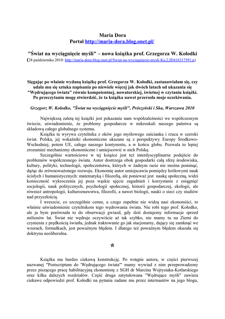 Maria Dora Portal http://maria-dora.blog.onet.pl/ "Świat na wyciągnięcie myśli" – nowa książka prof. Grzegorza W. Kołodki (28 października 2010: http://maria-dora.blog.onet.pl/Swiat-na-wyciagniecie-mysli-Ko,2,ID416317591,n) Sięgając po właśnie wydaną książkę prof. Grzegorza W. Kołodki, zastanawiałam się, czy udała mu się sztuka napisania po niewiele więcej jak dwóch latach od ukazania się "Wędrującego świata" równie kompetentnej, nowatorskiej, świetnej w czytaniu książki. Po przeczytaniu mogę stwierdzić, że ta książka nawet przerosła moje oczekiwania. Grzegorz W. Kołodko, "Świat na wyciągnięcie myśli", Prószyński i Ska, Warszawa 2010 Największą zaletą tej książki jest pokazanie nam współzależności we współczesnym świecie, uświadomienie, że problemy gospodarcze w mikroskali naszego państwa są składową całego globalnego systemu. Książka ta wyrywa czytelnika z oków jego myślowego zaścianka i rzuca w szeroki świat. Polska, jej wskaźniki ekonomiczne ukazane są z perspektywy Europy ŚrodkowoWschodniej, potem UE, całego naszego kontynentu, a w końcu globu. Pozwala to lepiej zrozumieć mechanizmy ekonomiczne i umiejscowić w nich Polskę. Szczególnie wartościowe w tej książce jest też interdyscyplinarne podejście do problemów współczesnego świata. Autor dostrzega obok gospodarki całą sferę środowiska, kultury, polityki, technologii, społeczeństwa, których w żadnym razie nie można pominąć, dążąc do zrównoważonego rozwoju. Ekonomię autor umiejscawia pomiędzy królowymi nauk ścisłych i humanistycznych: matematyką i filozofią, ale ponieważ jest naukę społeczną, widzi konieczność wykroczenia jej poza wąskie ujęcie zagadnień i korzystanie z osiągnięć socjologii, nauk politycznych, psychologii społecznej, historii gospodarczej, ekologii, ale również antropologii, kulturoznawstwa, filozofii, a nawet biologii, nauki o sieci czy studiów nad przyszłością. I wreszcie, co szczególnie cenne, a czego zupełnie nie widzą nasi ekonomiści, to właśnie uświadomienie czytelnikom tego wędrowania świata. Nie robi tego prof. Kołodko, ale ja bym porównała to do obserwacji gwiazd, gdy dziś dostajemy informacje sprzed milionów lat. Świat nie wędruje oczywiście aż tak szybko, nie mamy tu na Ziemi do czynienia z prędkością światła, jednak traktowanie go jak stacjonarny, dający się zamknąć we wzorach, formułkach, jest poważnym błędem. I dlatego też poważnym błędem okazała się doktryna neoliberalna. * Książka ma bardzo ciekawą konstrukcję. Po wstępie autora, w części pierwszej nazwanej "Postscriptum do 'Wędrującego świata'" mamy wywiad z nim przeprowadzony przez piszącego pracę habilitacyjną ekonomistę z SGH dr Marcina Wojtysiaka-Kotlarskiego oraz kilka dalszych rozdziałów. Część druga zatytułowana "Wędrujące myśli" zawiera ciekawe odpowiedzi prof. Kołodki na pytania zadane mu przez internautów na jego blogu, wypowiedzi tłumaczy, którzy zmagali się z jak najlepszym przekładem na swoje języki Wędrującego świata, w tym obok dość oczywistych angielskiego czy rosyjskiego, również na przykład na chiński czy wietnamski. Na koniec książki lekka forma, listy z przyszłości, wyobrażenia, jak świat będzie wyglądał w XXII w. I wreszcie indeks, łącznie nazwisk i rzeczowy, który ułatwia korzystanie z książki. We wstępie prof. Grzegorz Kołodko skromnie zauważa, że ten tom jest właściwie postscriptum do "Wędrującego świata". W mojej ocenie jest czymś o wiele więcej. Wędrujący świat możemy traktować jak niezbędne kompendium wiedzy o procesach zachodzących w światowej gospodarce, ale nie tylko, poznajemy wiążące się z tym procesy społeczne i konsekwencje dla środowiska. Przedstawiona też została dogłębna krytyka doktryny neoliberalnej, przewidziany został kryzys, który niebawem nastąpił, a co najważniejsze, została przedstawiona nowa koncepcja zrównoważonego rozwoju świata. Tak jak poprzednia książka to niezbędne kompendium, tak obecna podnosi debatę o tych problemach na wyższy poziom, syntetyzuje i uwypukla, co najistotniejsze, oraz pogłębia dyskusję. Już we wstępie mamy to globalne spojrzenie na najważniejsze problemy. Co prawda, został zahamowany nadmierny przyrost ludności świata, ale występuje regionalna nierównowaga, co tworzy naciski migracyjne, wymykające się spod kontroli. Uważa się też, że kraje biedniejsze powinny doganiać te zamożne, a przecież zamożne nie stoją w miejscu. Co ważne, autor zwraca uwagę, że należy dostrzegać, że nawet jeśli zmniejszają się różnice w dochodach państw, to i tak globalnie na to spojrzawszy, zróżnicowanie dochodów między grupami ludzi może się zwiększać. I tak właśnie dzieje się na świecie, podczas gdy przeciętne dochody w krajach o decydującym wpływie na całokształt globalnej sytuacji są coraz bliższe siebie, to skala zróżnicowania dochodów całej ludzkości jest coraz większa. I nadal rośnie. Nierówności wobec tego jest więcej, a nie mniej. Autor zwraca uwagę, że zastanawiając się nad przyszłością, trzeba umieć rozróżnić, które procesy są nieuchronne i zajdą, niezależnie od tego, czy nam się to podoba, czy nie, a które zależą od nas i to my zdecydujemy, jak potoczy się los Polski, Europy, świata. Autor stawia ważne pytania o globalną koordynację polityki i strategię dla świata tak, aby zarazem uniknąć utopii: wcześniejszej komunistycznej czy ostatniej neoliberalnej. Przewiduje, że w przyszłości wyłoni się świat wielobiegunowy, co może być korzystne, ale nie musi. Pasjonujący jest wywiad rozpoczynający pierwszą część książki. Pokazuje on, że mądre odpowiedzi można uzyskać, gdy zadane są mądre pytania. Jak sądzę, dlatego właśnie niewiele ciekawego można dowiedzieć się z nielicznych wywiadów z prof. Kołodką w naszej TV, gdyż nie m
