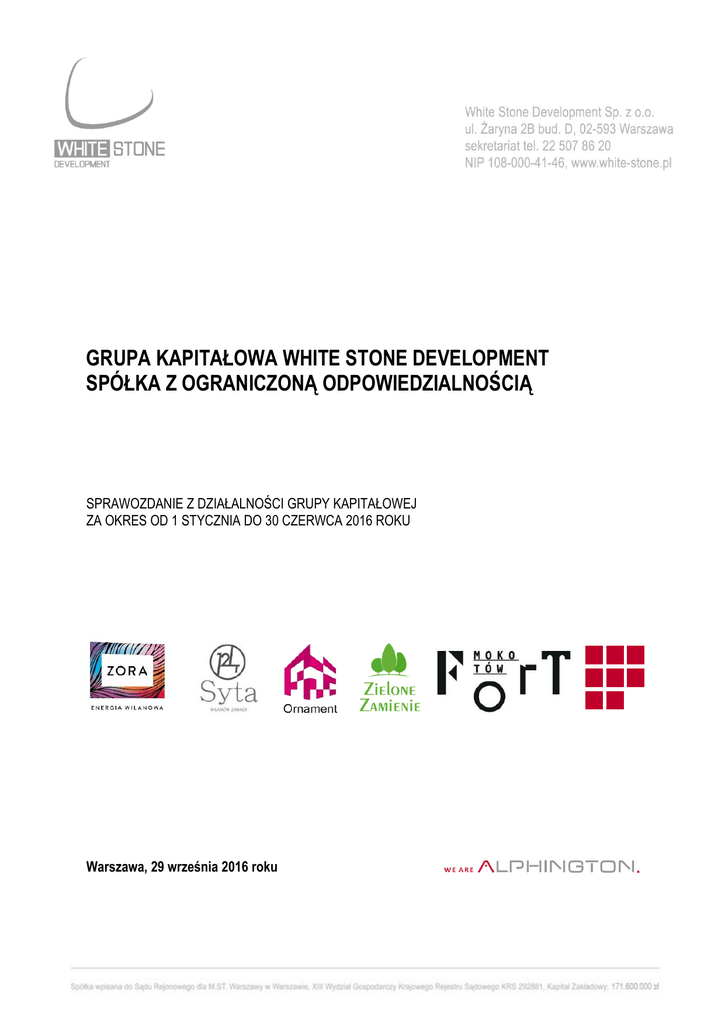 GRUPA KAPITAŁOWA WHITE STONE DEVELOPMENT SPÓŁKA Z OGRANICZONĄ ODPOWIEDZIALNOŚCIĄ SPRAWOZDANIE Z DZIAŁALNOŚCI GRUPY KAPITAŁOWEJ ZA OKRES OD 1 STYCZNIA DO 30 CZERWCA 2016 ROKU Warszawa, 29 września 2016 roku Grupa Kapitałowa White Stone Development Spółka z ograniczoną odpowiedzialnością Sprawozdanie z Działalności Grupy Kapitałowej za okres od 1 stycznia do 31 grudnia 2015 r. A. INFORMACJE O JEDNOSTCE DOMINUJĄCEJ Powstanie i siedziba Jednostki Dominującej White Stone Development Spółka z ograniczoną odpowiedzialnością została utworzona Umową Spółki z dnia 7 listopada 2007 roku. Spółka została wpisana do Krajowego Rejestru Sądowego pod numerem KRS 0000292881 w dniu 20 listopada 2007 roku. Spółce nadano Numer Identyfikacji Podatkowej 108-000-41-46 oraz numer REGON 141210596. Siedziba Spółki mieści się przy ulicy Żaryna 2B w Warszawie. Czas trwania Spółki jest nieznaczony. Spółka nie posiada żadnych oddziałów. Zmiany w strukturze Udziałowców Jednostki Dominującej W okresie, za który sporządzono sprawozdanie nie zaszły zmiany w strukturze udziałowców. W dniu 11 stycznia 2016 roku Sąd Rejonowy dla m. st. Warszawy w Warszawie, XIII Wydział Gospodarczy Krajowego Rejestru Sądowego dokonał rejestracji wartości kapitału zakładowego, podwyższonego na mocy uchwały Nadzwyczajnego Zgromadzenia Wspólników z dnia 9 grudnia 2015 roku. Zmiany w składzie organów zarządzających i nadzorczych Jednostki Dominującej Na dzień podpisania niniejszego sprawozdania w skład Zarządu Jednostki Dominującej wchodzą: Pan Tomasz Skórczyński – Prezes Zarządu, Pani Katarzyna Szymborska – Członek Zarządu. W okresie, za który sporządzono sprawozdanie nie nastąpiły zmiany w składzie Zarządu. Jednostka Dominująca nie posiada organów nadzorczych. Działalność w roku obrotowym Zgodnie z Umową Spółki White Stone Development Sp. z o.o. podstawowym przedmiotem działalności Jednostki Dominującej jest: obsługa nieruchomości, działalność rachunkowo – księgowa, z wyłączeniem doradztwa podatkowego, badanie rynku i opinii publicznej, doradztwo w zakresie prowadzenia działalności gospodarczej i zarządzania, reklama, rekrutacja i udostępnianie pracowników, działalność w zakresie architektury i inżynierii, –2 – Grupa Kapitałowa White Stone Development Spółka z ograniczoną odpowiedzialnością Sprawozdanie z Działalności Grupy Kapitałowej za okres od 1 stycznia do 31 grudnia 2015 r. budownictwo, roboty budowlane związane ze wznoszeniem budynków, roboty związane z budową obiektów inżynierii lądowej i wodnej, roboty budowlane specjalistyczne, działalność wspomagająca usługi finansowe działalność związana z obsługą rynku nieruchomości, działalność w zakresie architektury i inżynierii, badania i analizy techniczne. W okresie objętym niniejszym sprawozdaniem głównym przedmiotem działalności White Stone Development Sp. z o.o. było zastępstwo inwestycyjne, usługi księgowe oraz doradztwo administracyjne i gospodarcze dla spółek z Grupy Kapitałowej. W celu realizacji powyższych zadań Spółka zatrudnia pracowników etatowych oraz doraźnych pracowników na podstawie umów cywilnoprawnych. B. INFORMACJE O POZOSTAŁYCH SPÓŁKACH GRUPY KAPITAŁOWEJ Na dzień 31 grudnia 2015 roku w skład Grupy Kapitałowej White Stone Development Sp. z o.o. wchodziły następujące spółki zależne podlegające konsolidacji: ABC SPV Sp. z o.o., Fort Mokotów 99 Sp. z o.o., Lesznowola Sp. z o.o., Lesznowola SPV Sp. z o.o., Lesznowola SPV 2 Sp. z o.o., Ornament Szczecin Sp. z o.o., SPS Construction Sp. z o.o., Syta 124 Sp. z o.o., Zora Wilanów Sp. z o.o., Zora Wilanów 2 Sp. z o.o. ABC SPV Sp. z o.o. Siedziba: Warszawa (02-593), ul. Żaryna 2B KRS: 0000621949 NIP: 521-373-77-15 REGON: 364661952 Kapitał zakładowy: 5.000,00 zł Udziałowcy: White Stone Development Sp. z o.o. – 100% –3– Grupa Kapitałowa White Stone Development Spółka z ograniczoną odpowiedzialnością Sprawozdanie z Działalności Grupy Kapitałowej za okres od 1 stycznia do 31 grudnia 2015 r. Skład Zarządu: Anna Suchodolska – Członek Zarządu, Tomasz Skórczyński – Członek Zarządu Przedmiot działalności: realizacja projektu komercyjnego w Warszawie – projekt w przygotowaniu Fort Mokotów 99 Sp. z o.o. Siedziba: Warszawa (02-593), ul. Żaryna 2B KRS: 0000506218 NIP: 701-042-15-34 REGON: 147204042 Kapitał zakładowy: 105.000,00 zł Udziałowcy: White Stone Development Sp. z o.o. – 100% Skład Zarządu: Anna Suchodolska – Członek Zarządu, Tomasz Skórczyński – Członek Zarządu Przedmiot działalności: wynajem powierzchni i zarządzanie nieruchomością położoną w Warszawie (ul. Racławicka) Lesznowola Sp. z o.o. Siedziba: Warszawa (02-593), ul. Żaryna 2B KRS: 0000416648 NIP: 521-341-81-34 REGON: 140817534 Kapitał zakładowy: 35.569.500,00 zł Udziałowcy: White Stone Development Sp. z o.o. – 100% Skład Zarządu: Katarzyna Szymborska – Członek Zarządu, Anna Suchodolska – Członek Zarządu Przedmiot działalności: wynajem powierzchni i zarządzanie nieruchomościami położonymi w Zamieniu (gm. Lesznowola), Skubiance (gm. Serock), Jachrance (gm. Serock), Szczecinie, Warszawie oraz Gdańsku Lesznowola SPV Sp. z o.o. Siedziba: Warszawa (02-593), ul. Żaryna 2B KRS: 0000621738 NIP: 521-373-75-37 REGON: 364642771 Kapitał zakładowy: 5.000,00 zł Udziałowcy: White Stone Development Sp. z o.o. – 100% –4– Grupa Kapitałowa White Stone Development Spółka z ograniczoną odpowiedzialnością Sprawozdanie z Działalności Grupy Kapitałowej za okres od 1 stycznia do 31 grudnia 2015 r. Skład Zarządu: Katarzyna Szymborska – Członek Zarządu, Anna Suchodolska – Członek Zarządu Przedmiot działalności: realizacja projektu deweloperskiego w Zamieniu (gm. Lesznowola) – projekt w przygotowaniu Lesznowola SPV 2 Sp. z o.o. Siedziba: Warszawa (02-593), ul. Żaryna 2B KRS: 0000627629 NIP: 521-