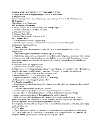 REGULAMIN KONKURSU FOTOGRAFICZNEGO I Edycja Konkursu Fotograficznego: „Ursus w obiektywie” I. Organizator Urząd Dzielnicy Ursus m.st. Warszawy, plac Czerwca 1976 r. 1, 02-495 Warszawa II. Uczestnicy Mieszkańcy m.st. Warszawy. III. Kategorie tematyczne Konkurs odbywa się w trzech kategoriach tematycznych: 1. Portret z Ursusem w tle: Moja Rodzina 2. Miejsce w Ursusie 3. Modern/ Retro Ursus 4. Kolarz/ Fotomontaż z Ursusem w tle IV. Cel konkursu 1. Rozwijanie wrażliwości artystycznej. 2. Prezentacja twórczości mieszkańców Warszawy w dziedzinie fotografii. 3. Promocja Dzielnicy Ursus. V. Zasady ogólne 1. Przedmiotem konkursu są prace fotograficzne wykonane samodzielnie, będące oryginałami. 2. Wyklucza się prace tworzone wspólnie (współautorstwo). 4. Nadesłane prace należy opisać drukowanymi literami (tytuł pracy, imię i nazwisko autora), 5. Autorzy prac nadsyłają oświadczenie o posiadaniu praw autorskich do nadesłanych prac oraz zgodę na przetwarzanie danych osobowych, zgodnie z załącznikiem do niniejszego regulaminu. 6. Przesłane prace nie będą zwracane. 7. Udział w konkursie jest bezpłatny. 8. Nagrodzone i wyróżnione prace zostaną wykorzystane do stworzenia wystawy Laureatów, jak również przez Urząd Dzielnicy Ursus m.st. Warszawy w celach promocyjnych. 9. W konkursie przewidziane zostały trzy typy nagród. - Nagrody Główne – przyznawane przez Jury - Nagroda Burmistrza Dzielnicy Ursus m.st. Warszawy 10. Organizator zapewnia profesjonalne Jury. VI. Zasady szczegółowe 1. Przedmiotem konkursu są fotografie, których tematyka wiąże się z podanymi kategoriami tematycznymi. 2. Technika wykonania fotografii jest dowolna. 3. Format wywołanej fotografii nie może być mniejszy niż 18x24 cm. 4. Format zdjęć w wersji elektronicznej powinien być nie mniejszy niż 300 dpi. 4. Jeden autor może dostarczyć do pięciu zdjęć z każdej kategorii. 5. O ile na fotografiach konkursowych znajduje się wizerunek człowieka, uczestnik przesyłając fotografię zapewnia, że osoba, której wizerunek znajduje się na fotografii wyraziła zgodę na nieodpłatną publikację tego wizerunku. 6. Fotografie, na których będą znajdować się jakiekolwiek oznaczenia, cyfry (np. daty) będą dyskwalifikowane. VII. Terminy 1. Prace wykonane zgodnie z wymogami organizatorów należy przekazać osobiście (pok. 203) lub przesłać (nie ma możliwości dostarczania prac drogą elektroniczną) do dnia 18 sierpnia 2014r. (liczy się data stempla pocztowego) na adres: Urząd Dzielnicy Ursus m.st. Warszawy Wydział Kultury i Promocji pl. Czerwca 1976 r. nr 1 02-495 Warszawa z dopiskiem Konkurs fotograficzny „Ursus w Obiektywie” 2. Organizatorzy nie ponoszą odpowiedzialności za straty powstałe w transporcie oraz za ewentualne nieterminowe dostarczenie prac przez pocztę. 3. Rozstrzygnięcie Konkursu nastąpi dnia 7 września 2014r. 4. Zdjęcia Laureatów zostaną wykorzystane do wystawy, której uroczyste otwarcie połączone z rozdaniem nagród nastąpi 21.09.2014 r. w Parku Achera przy ulicy Dzieci Warszawy. VIII. Ogłoszenie wyników i nagrody 1. Oceny prac dokona profesjonalne jury, powołane przez Organizatora. Decyzje jury są ostateczne. 2. Wyniki konkursu zostaną opublikowane na stronie internetowej Organizatora. Laureaci zostaną powiadomieni o terminie i miejscu wręczenia nagród drogą telefoniczną lub drogą elektroniczną (e-mail). 3. Organizatorzy uhonorują atrakcyjnymi nagrodami zdobywców I, II i III miejsca oraz zastrzegają sobie prawo do przyznania 2 wyróżnień. IX. Postanowienia końcowe 1. Udział w konkursie jest równoznaczny z akceptacją regulaminu oraz ze zgodą uczestnika na przetwarzanie jego danych osobowych zgodnie z przepisami ustawy z 29 sierpnia 1997r. o ochronie danych osobowych (tekst jednolity: Dz. U. z 2002 r. Nr 101, poz. 926 ze zm.). 2. Dane osobowe uczestników konkursu będą chronione zgodnie z wymienioną ustawą. Uczestnikowi konkursu przysługuje prawo wglądu do swoich danych osobowych oraz ich poprawiania. Podanie danych jest dobrowolne, lecz ich brak uniemożliwia wzięcie udziału w konkursie. 3. Organizator informuje, iż dane osobowe laureata konkursu (imię i nazwisko) zostaną opublikowane w materiałach promocyjnych, prasie lokalnej oraz na stronie internetowej Urzędu Dzielnicy Ursus m.st. Warszawy. 4. Dane osobowe uczestników konkursu mogą być przekazane fundatorowi nagród w celu wykonania przez niego obowiązków wynikających z regulaminu konkursu. 5. W sprawie roszczeń wnoszonych przez osoby trzecie odpowiedzialność ponosi autor. 6. Uczestnik udziela Organizatorowi przez Uczestnika Konkursu nieodpłatnej licencji niewyłącznej, uprawniającej Organizatora do korzystania przez czas nieoznaczony oraz bez ograniczeń terytorialnych z przesłanych zdjęć na wszystkich polach eksploatacji, a w szczególności obejmującej uprawnienie do: -utrwalania; zwielokrotnienia wszelkimi technikami, w tym przed e wszystkim techniką drukarską; -wprowadzenia do obrotu w kraju; -wprowadzenia do pamięci komputera; -publikacji w tytułach Organizatora; -publikacji na stronie internetowej Organizatora (www.ursus.warszawa.pl) oraz na profilu Organizatora w serwisie Facebook 7. Odbitki zgłoszone do konkursu przechodzą na własność Organizatora. 8. Organizator nie zwraca nadesłanych prac. Organizator zastrzega sobie prawo do ich bezpłatnej reprodukcji w materiałach reklamowych. Uczestnik udziela nieodpłatnego prawa do wykorzystania swojej pracy. 9. Organizator zastrzega sobie prawo do przerwania lub odwołania konkursu bez podania przyczyn oraz niewyłonienia zwycięzcy. Informacje o konkursie można uzyskać: Urząd Dzielnicy Ursus m.st. Warszawy Wydział Kultury i Promocji pl. Czerwca 1976 r. nr 1 02-495 Warszawa Tel. 22 478-60-45 Kontakt: Jan Solon, Anna Pawłowska e-mail: [email protected]; [email protected] strona www: http://www.ursus.warszawa.pl