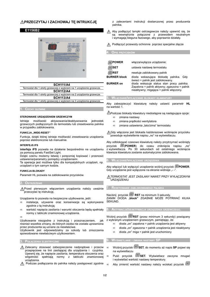 z zaleceniami instrukcji dostarczonej przez producenta palnika. PRZECZYTAJ I ZACHOWAJ TĘ INTRUKCJĘ E1156B2 Aby podłączyć lampki ostrzegawcze należy upewnić się, że są wewnętrznie połączone z przewodem neutralnym i wymagają bieguna fazowego, aby poprawnie działały. Podłączyć przewody ochronne poprzez specjalne złącze 4. OPIS PRZYCISKÓW POWER włącza/wyłącza urządzenie; SET ustawia nastawę termostatu RST BURNER block BURNER on SCH111/A4 Termostat dla 1 strefy grzewczej z wyjściem na 1 urządzenie grzewcze. SCH112/A4 resetuje zablokowany palnik dioda wskazująca blokadę palnika. Gdy świeci = palnik jest zablokowany. dioda wskazuje status stan pracy palnika. Zapalona = palnik aktywny; zgaszona = palnik nieaktywny; migająca = palnik włączony. Termostat dla 1 strefy grzewczej z wyjściem na 2 urządzenia grzewcze. 5. WŁĄCZANIE/WYŁĄCZANIE BLOKADY KLAWIATURY SCH113/A4 Termostat dla 1 strefy grzewczej z wyjściem na 3 urządzenia grzewcze. Aby zabezpieczyć klawiaturę należy ustawić parametr HL na wartość 1. 1. CECHY GŁÓWNE Podczas blokady klawiatury niedostępne są następujące opcje: • zmiana nastawy • zmiana prędkości wentylatora • zmiana ustawienia „lato/zima” termostatu STEROWANIE URZĄDZENIEM GRZEWCZYM Istnieje możliwość aktywowania/deaktywowania jednostek grzewczych podłączonych do termostatu lub zresetowania palnika w przypadku zablokowania. Gdy włączona jest blokada każdorazowe wciśnięcie przycisku powoduje wyświetlenie napisu „no” na wyświetlaczu. FUNKCJA „WIDE-RESET” Funkcja, dzięki której istnieje możliwość zresetowania urządzenia poprzez elektronicznie lub manualnie. INTERFEJS IFS interfejs iFS pozwala na działanie bezpośrednio na urządzeniu za pomocą panelu FastSet Light. Dzięki czemu możemy łatwiej i poręczniej kopiować i przenosić ustawienia/parametry pomiędzy urządzeniami. Ta operacja jest możliwa tylko dla kompatybilnych urządzeń, np. urządzeń o tym samym kodzie. FUNKCJA BLOKADY Aby odblokować czasowo klawiaturę należy przytrzymać wciśnięty przycisk (POWER) do czasu zniknięcia napisu „no” z wyświetlacza. Po 30 sekundach od ostatniego wciśnięcia klawisza klawiatura zostanie automatycznie zablokowana. 6. WŁĄCZANIE/WYŁĄCZANIE URZĄDZENIA Aby włączyć lub wyłączyć urządzenie wciśnij przycisk POWER. Gdy urządzenie jest wyłączone na ekranie widnieje „- -”. Parametr HL pozwala na zablokowanie przycisków. TERMOSTAT JEST ZASILANY NAWET PRZY WYŁĄCZONYM URZĄDZENIU 2. OSTRZEŻENIE Przed pierwszym włączeniem urządzenia należy uważnie przeczytać tę instrukcję. Urządzenie to pozwala na bezpieczne użytkowanie, jeśli: • instalacja, używanie oraz konserwacja są wykonywane zgodnie z tą instrukcją; • wartość napięcia zasilania i warunki otoczenia będą spełniały normy z tabliczki znamionowej urządzenia. • 7. RESETOWANIE ZABLOKOWANEGO PALNIKA Naciśnij przycisk RST na minimum 3 sekundy. ZANIM DIODA „block” ZGAŚNIE MOŻE POTRWAĆ KILKA SEKUND. 8. AKTYWACJA/DEAKTYWACJA URZĄDZENIA GRZEWCZEGO. Użytkowanie niezgodne z instrukcją i przeznaczeniem, jak również wszelkie zmiany, do których osoba nie została uprawniona przez producenta są uznane za niewłaściwe. Użytkownik jest odpowiedzialny za szkody lub zniszczenia spowodowane niewłaściwym użytkowaniem. Wciśnij przycisk RST (przez minimum 3 sekundy) powiązany z wybranym urządzeniem grzewczym, pamiętając, że: • dioda „on” zapalona = palnik urządzenia jest aktywny • dioda „on” zgaszona = palnik urządzenia jest nieaktywny • dioda „on” miga = palnik jest uruchomiony 3. POŁĄCZENIA ELEKTRYCZNE 9. WYŚWIETLANIE I ZMIANA NASTAWY SP Zalecamy stosować zabezpieczenie nadprądowe i przeciw przepięciowe na linii zasilającej dla urządzenia i czujnika. Upewnij się, że napięcie zasilania, temperatura otoczenia oraz wilgotność spełniają normy z tabliczki znamionowej urządzenia. Podczas podłączania do palnika należy postępować zgodnie • Wciśnij przycisk na wyświetlaczu • Puść przycisk SET. Wyświetlacz zaczyna i wyświetlać wartość nastawy temperatury. • Aby zmienić wartość nastawy należy wciskać przycisk 1/2 SET, do momentu aż napis SP pojawi się mrugać • • SET do momentu uzyskania wymaganej nastawy. Aby przyspieszyć zwiększanie wartości należy przytrzymać wciśnięty przycisk SET. Aby zakończyć procedurę ustawiania i zapisać nastawę, poczekaj (nie wciskając żadnych przycisków) do czasu aż wyświetlacz przestanie mrugać. 10.ZMIANA USTAWIEŃ URZĄDZENIA • włączyć urządzenie SET • puścić przycisk SET, jak tylko wymagany parametr pojawi się na wyświetlaczu wciskając jednocześnie przycisk • wcisnąć ponownie przycisk , aby zmienić wartość parametru; Aby zakończyć procedurę ustawiania i zapisać zmiany, należy odczekać 5 sekund bez wciskania przycisków. 11.LISTA PARAMETRÓW URZĄDZENIA Kod / /C r rd L L1 Parametr Zakres Ustawienia sondy Kalibracja sondy -9..9,9 Ustawienia regulatora Histereza regulatora 0,1..9,9 Parametry wyjściowe Wybór trybu RESET. 0=manualne 0..2 resetowanie; 1=reset poprzez rozłączenie zasilania oraz ręczny reset (czas trwania ok. 10sek.); 2 - jak tryb „1”, z tym, że czas trwania = 20sek. L2 Czas trwania impulsu resetu 1..59 H Pozostałe parametry HL Blokada klawiatury: 0=odblokowana; 1=zablokowana. 0,0 °C 0,5 - 0 s 5 1-2 4 5 6 7 8 9 10 11 12 13 14 15 19 20 Jedn. Nastawa °C SCHEMAT ELEKTRYCZNY URZĄDZENIA. 12.GWARANCJA EsseCI gwarantuje poprawne działanie produktu przez 1 rok od daty wyprodukowania widniejącej na opakowaniu. Jedynie części, które ulegną uszkodzeniu z winy producenta EsseCI zostaną wymienione lub naprawione po wcześniejszym przeglądzie technicznym EsseCI. W przypadku uszkodzeń spowodowanych niewłaściwym użytkowaniem, lub/i nieumiejętnym manipulowaniem przez osoby niepowołane EsseCI nie ponosi odpowiedzialności. Wszystkie kosz