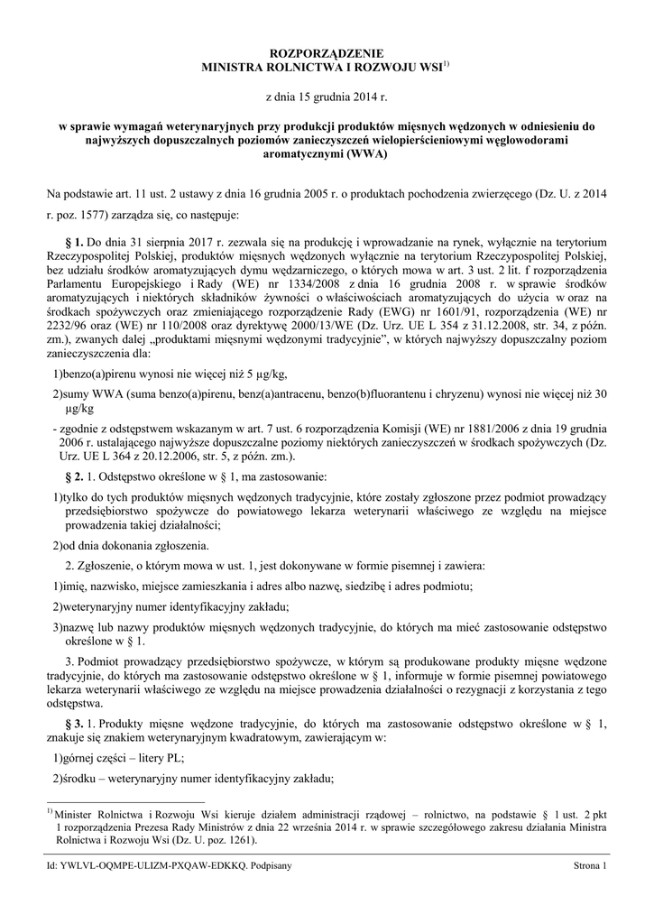 ROZPORZĄDZENIE MINISTRA ROLNICTWA I ROZWOJU WSI1) z dnia 15 grudnia 2014 r. w sprawie wymagań weterynaryjnych przy produkcji produktów mięsnych wędzonych w odniesieniu do najwyższych dopuszczalnych poziomów zanieczyszczeń wielopierścieniowymi węglowodorami aromatycznymi (WWA) Na podstawie art. 11 ust. 2 ustawy z dnia 16 grudnia 2005 r. o produktach pochodzenia zwierzęcego (Dz. U. z 2014 r. poz. 1577) zarządza się, co następuje: § 1. Do dnia 31 sierpnia 2017 r. zezwala się na produkcję i wprowadzanie na rynek, wyłącznie na terytorium Rzeczypospolitej Polskiej, produktów mięsnych wędzonych wyłącznie na terytorium Rzeczypospolitej Polskiej, bez udziału środków aromatyzujących dymu wędzarniczego, o których mowa w art. 3 ust. 2 lit. f rozporządzenia Parlamentu Europejskiego i Rady (WE) nr 1334/2008 z dnia 16 grudnia 2008 r. w sprawie środków aromatyzujących i niektórych składników żywności o właściwościach aromatyzujących do użycia w oraz na środkach spożywczych oraz zmieniającego rozporządzenie Rady (EWG) nr 1601/91, rozporządzenia (WE) nr 2232/96 oraz (WE) nr 110/2008 oraz dyrektywę 2000/13/WE (Dz. Urz. UE L 354 z 31.12.2008, str. 34, z późn. zm.), zwanych dalej „produktami mięsnymi wędzonymi tradycyjnie”, w których najwyższy dopuszczalny poziom zanieczyszczenia dla: 1)benzo(a)pirenu wynosi nie więcej niż 5 µg/kg, 2)sumy WWA (suma benzo(a)pirenu, benz(a)antracenu, benzo(b)fluorantenu i chryzenu) wynosi nie więcej niż 30 µg/kg - zgodnie z odstępstwem wskazanym w art. 7 ust. 6 rozporządzenia Komisji (WE) nr 1881/2006 z dnia 19 grudnia 2006 r. ustalającego najwyższe dopuszczalne poziomy niektórych zanieczyszczeń w środkach spożywczych (Dz. Urz. UE L 364 z 20.12.2006, str. 5, z późn. zm.). § 2. 1. Odstępstwo określone w § 1, ma zastosowanie: 1)tylko do tych produktów mięsnych wędzonych tradycyjnie, które zostały zgłoszone przez podmiot prowadzący przedsiębiorstwo spożywcze do powiatowego lekarza weterynarii właściwego ze względu na miejsce prowadzenia takiej działalności; 2)od dnia dokonania zgłoszenia. 2. Zgłoszenie, o którym mowa w ust. 1, jest dokonywane w formie pisemnej i zawiera: 1)imię, nazwisko, miejsce zamieszkania i adres albo nazwę, siedzibę i adres podmiotu; 2)weterynaryjny numer identyfikacyjny zakładu; 3)nazwę lub nazwy produktów mięsnych wędzonych tradycyjnie, do których ma mieć zastosowanie odstępstwo określone w § 1. 3. Podmiot prowadzący przedsiębiorstwo spożywcze, w którym są produkowane produkty mięsne wędzone tradycyjnie, do których ma zastosowanie odstępstwo określone w § 1, informuje w formie pisemnej powiatowego lekarza weterynarii właściwego ze względu na miejsce prowadzenia działalności o rezygnacji z korzystania z tego odstępstwa. § 3. 1. Produkty mięsne wędzone tradycyjnie, do których ma zastosowanie odstępstwo określone w § 1, znakuje się znakiem weterynaryjnym kwadratowym, zawierającym w: 1)górnej części – litery PL; 2)środku – weterynaryjny numer identyfikacyjny zakładu; 1) Minister Rolnictwa i Rozwoju Wsi kieruje działem administracji rządowej – rolnictwo, na podstawie § 1 ust. 2 pkt 1 rozporządzenia Prezesa Rady Ministrów z dnia 22 września 2014 r. w sprawie szczegółowego zakresu działania Ministra Rolnictwa i Rozwoju Wsi (Dz. U. poz. 1261). Id: YWLVL-OQMPE-ULIZM-PXQAW-EDKKQ. Podpisany Strona 1 3)dolnej części – litery IW. 2. Znakowania, o którym mowa w ust. 1, dokonuje się zgodnie z przepisami załącznika II sekcji I ust. 1, 2, 5, 9–11, 13 i 14 rozporządzenia (WE) nr 853/2004 Parlamentu Europejskiego i Rady z dnia 29 kwietnia 2004 r. ustanawiającego szczególne przepisy dotyczące higieny w odniesieniu do żywności pochodzenia zwierzęcego (Dz. Urz. UE L 139 z 30.04.2004, str. 55, z późn. zm.; Dz. Urz. UE Polskie wydanie specjalne, rozdz. 3, t. 45, str. 14, z późn. zm.). § 4. Rozporządzenie wchodzi w życie z dniem następującym po dniu ogłoszenia. Minister Rolnictwa i Rozwoju Wsi Id: YWLVL-OQMPE-ULIZM-PXQAW-EDKKQ. Podpisany Strona 2 Uzasadnienie Rozporządzenie Ministra Rolnictwa i Rozwoju Wsi w sprawie wymagań weterynaryjnych przy produkcji produktów mięsnych wędzonych w odniesieniu do najwyższych dopuszczalnych poziomów zanieczyszczeń wielopierścieniowymi węglowodorami aromatycznymi (WWA) stanowi wykonanie art. 11 ust. 2 ustawy z dnia 16 grudnia 2005 r. o produktach pochodzenia zwierzęcego (Dz. U. z 2014 r. poz. 1577). Rozporządzenie ma na celu umożliwienie polskim produktom mięsnym wędzonym tradycyjnie tj. bez użycia środków aromatyzujących dymu wędzarniczego korzystanie z odstępstwa przewidzianego w przepisach rozporządzenia Komisji (WE) nr 1881/2006 z dnia 19 grudnia 2006 r. ustalającego najwyższe dopuszczalne poziomy niektórych zanieczyszczeń w środkach spożywczych (Dz. Urz. UE L 364 z 20.12.2006, str. 5, z późn. zm.), w brzmieniu nadanym przepisami rozporządzenia Komisji (UE) nr 1327/2014 z dnia 12 grudnia 2014 r. zmieniającego rozporządzenie (WE) nr 1881/2006 w odniesieniu do najwyższych dopuszczalnych poziomów wielopierścieniowych węglowodorów aromatycznych (WWA) w mięsie wędzonym tradycyjnie i produktach mięsnych wędzonych tradycyjnie oraz w rybach i produktach rybołówstwa wędzonych tradycyjnie (Dz. Urz. UE L 358 z 13.12.2014, str. 13). Obecnie regulacje dotyczące najwyższych dopuszczalnych poziomów pozostałości WWA występują w rozporządzeniu Komisji (WE) nr 1881/2006. Zgodnie z ww. przepisami od dnia 1 września 2014 r. najwyższe dopuszczalne poziomy pozostałości dla WWA w produktach mięsnych wędzonych zostały obniżone do poziomu dla benzo(a)pirenu - 2,0 µg/kg (do dnia 1 września 2014 r. - 5 µg/kg), a dla sumy WWA (suma benzo(a)pirenu, benz(a)antracenu, benzo(b)fluorantenu i chryzenu) - 12,0 µg/kg (do dnia 1 września 2014 r. - 30 µg/kg). Natomiast regulacje w zakresie środków aromatyzujących dymu wędzarniczeg