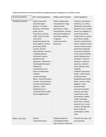 Wykaz konkretnych marek produktów bezglutenowych dostępnych na polskim rynku Grupa produktów Nie zawierają glutenu Mogą zawierać gluten Zawierają gluten Produkty zbożowe Zboża naturalnie niezawierające glutenu: ryż biały i brązowy, kukurydza, gryka, proso, amarantus, quinoa, mąki i kasze ze zbóż naturalnie bezglutenowych (np. kasza jaglana z prosa, gryczana), płatki ryżowe, skrobia kukurydziana, ryżowa i z tapioki, gotowe mieszanki mączne bezglutenowe, pieczywo i makarony z mąk bezglutenowych wykonane samodzielnie oraz kupne oznakowane znakiem „przekreślonego kłosa”, kaszki dla dzieci ryżowe i kukurydziane, chrupki kukurydziane, popcorn, owies bezglutenowy ( z zastrzeżeniami), bułka tarta bezglutenowa Płatki śniadaniowe kukurydziane mogą zawierać słód jęczmienny, mąka kukurydziana, ryżowa, gryczana dostępne w sprzedaży ogólnej mogą być zanieczyszczone glutenem Pszenica (i jej dawne odmiany, np. orkisz, płaskurka), pszenżyto, jęczmień, żyto, zwykły owies (ze względu na zanieczyszczenia), mąka pszenna, żytnia, jęczmienna, płatki pszenne, jęczmienne, żytnie, owsiane, kasza manna, kuskus, kasza jęczmienna (pęczak, mazurska, perłowa), musli, kasze owsiane, kaszki błyskawiczne zbożowe i mleczno – zbożowe, makaron pszenny, makaron żytni, pierogi, pyzy, kopytka, naleśniki, pieczywo – każde – jeśli nie jest oznaczone jako bezglutenowe (chleb biały i razowy, bułki, bagietki, maca, pumpernikiel, pieczywo chrupkie, precle), pieczywo cukiernicze suche (herbatniki, ciastka, wafle, biszkopty, pierniczki, sucharki, paluszki itp.), ciasta, ciastka, drożdżówki, pizza, bułka do hamburgera, bułka tarta Mięso, ryby, jaja Świeże nieprzetworzone Wędliny (także te Panierki do mięs i ryb wysokogatunkowe oraz potrawy typu szynka), zwłaszcza mięso, ryby, jaja tzw. wędliny wysokowydajne, panierowane konserwy rybne i mięsne, wędliny podrobowe (kaszanka, pasztetowa, pasztet), wyroby garmażeryjne mięsne ( parówki,kotlety mielone, pulpety, hamburgery) Mleko i produkty mleczne Mleko świeże, mleko w kartonie, mleko zagęszczane, mleko w proszku, kefir, maślanka, jogurt naturalny, nieprzetworzony ser biały, żółty Jogurty owocowe, maślanki smakowe, napoje czekoladowe, produkty mleczne o obniżonej zawartości tłuszczu, serki topione, śmietana (zagęstnik), tanie sery żółte (tzw. wyroby seropodobne); gotowe sery białe do serników (niektórzy producenci dodają błonnik pszenny), sery pleśniowe Napoje mleczne z dodatkiem słodu jęczmiennego, produkty mleczne z ziarnami zbóż Tłuszcze Masło, smalec, margaryna, olej roślinny, oliwa z oliwek Majonezy, gotowe sosy (dresingi) Olej z kiełków pszenicy Warzywa i przetwory z warzyw Wszystkie warzywa (świeże, mrożone, konserwowane bez dodatków), strączkowe (groch, fasola, soczewica), ziemniaki, skrobia ziemniaczana Sałatki z majonezem i dresingami o nieznanym składzie, przeciery pomidorowe, niektóre fasole w puszkach, placki ziemniaczane, produkty wegetariańskie typu kotlety sojowe, pasztety sojowe, majonezy sojowe Warzywa smażone panierowane, warzywa z tartą bułką Owoce Wszystkie owoce Owoce suszone, wsady (świeże, mrożone, konserwowane) owocowe Cukier, słodycze, desery Cukier, dżem, miód, landrynki, ciasta i ciastka upieczone z dozwolonych produktów, kisiele i budynie domowe z mąki ziemniaczanej, ciasta i ciastka oznakowane znakiem „przekreślonego kłosa” Guma do żucia, żelki, nadziewane cukierki, batony, gotowe budynie, lody, czekolada i czekoladki, chipsy Ciasta i ciastka upieczone z niedozwolonych mąk lub z niedozwolonym proszkiem do pieczenia, słód jęczmienny Napoje Herbata, kawa naturalna, soki owocowe, wody mineralne, kompoty, napary z ziół, czyste alkohole Niektóre tanie kawy rozpuszczalne, zwłaszcza aromatyzowane, czekolada do picia na gorąco, napoje owocowo-warzywne, alkohole z dodatkami smakowymi Kawa zbożowa, kakao owsiane, napoje słodzone słodem jęczmiennym, piwo Przyprawy Sól, pieprz, zioła, jednorodne przyprawy, ocet winny, ocet jabłkowy, bezglutenowy sos sojowy Tamari Jarzynki typu vegeta, mieszanki przypraw (np. curry), musztardy, keczupy, sosy w proszku gotowe dipy i dresingi Zwykły sos sojowy Zupy Zupy domowe z dozwolonych produktów Zupy w proszku (instant), niektóre kostki bulionowe Zupy zaprawiane mąką, zupy z makaronem, z lanym ciastem Inne Proszek do pieczenia bezglutenowy, soda spożywcza, komunikanty niskoglutenowe Preparaty do odchudzania, niektóre leki i preparaty wielowitaminowe, niektóre aromaty, cukier waniliowy Zwykły proszek do pieczenia, hydrolizowane białko roślinne, seitan (zastępnik mięsa stosowany przez wegetarian) komunikanty z mąki pszennej, zwykłe opłatki świąteczne Prosimy pamiętać, że podane przez nas informacje mają charakter orientacyjny — aby mieć całkowitą pewność, zawsze należy zapoznać się ze składem produktu przed spożyciem. *Zwykły owies jest silnie zanieczyszczony glutenem, dlatego jest zabroniony w diecie bezglutenowej. W niektórych krajach, np. w Finlandii, produkowany jest jednak także czysty, certyfikowany owies, którego spożywanie w niewielkich ilościach jest dozwolone. Źródło: http://www.celiakia.pl/produkty-dozwolone/