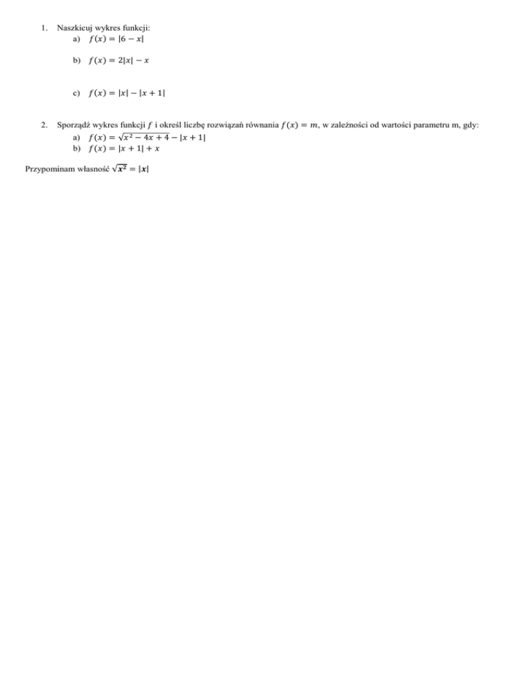 1. Naszkicuj wykres funkcji: a) = |6 − | b) = 2|| − c) 2. = || − | + 1| Sporządź wykres funkcji i określ liczbę rozwiązań równania = , w zależności od wartości parametru m, gdy: a) = √ − 4 + 4 − | + 1| b) = | + 1| + Przypominam własność √ = || Rozwiązania: 1. a) = |6 − | b) = 2|| − c) 2. = || − | + 1| = √ − 4 + 4 − | + 1| Przypominam własność √ = || a) b) = | + 1| +