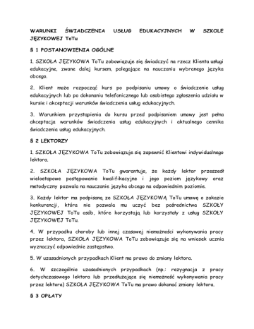 WARUNKI ŚWIADCZENIA USŁUG EDUKACYJNYCH W SZKOLE JĘZYKOWEJ ToTu § 1 POSTANOWIENIA OGÓLNE 1. SZKOŁA JĘZYKOWA ToTu zobowiązuje się świadczyć na rzecz Klienta usługi edukacyjne, zwane dalej kursem, polegające na nauczaniu wybranego języka obcego. 2. Klient może rozpocząć kurs po podpisaniu umowy o świadczenie usług edukacyjnych lub po dokonaniu telefonicznego lub osobistego zgłoszenia udziału w kursie i akceptacji warunków świadczenia usług edukacyjnych. 3. Warunkiem przystąpienia do kursu przed podpisaniem umowy jest pełna akceptacja warunków świadczenia usług edukacyjnych i aktualnego cennika świadczenia usług edukacyjnych. § 2 LEKTORZY 1. SZKOŁA JĘZYKOWA ToTu zobowiązuje się zapewnić Klientowi indywidualnego lektora. 2. SZKOŁA JĘZYKOWA ToTu gwarantuje, że każdy wieloetapowe postępowanie kwalifikacyjne i jego lektor przeszedł poziom językowy oraz metodyczny pozwala na nauczanie języka obcego na odpowiednim poziomie. 3. Każdy lektor ma podpisaną ze SZKOŁA JĘZYKOWĄ ToTu umowę o zakazie konkurencji, która nie pozwala mu uczyć bez pośrednictwa SZKOŁY JĘZYKOWEJ ToTu osób, które korzystają lub korzystały z usług SZKOŁY JĘZYKOWEJ ToTu. 4. W przypadku choroby lub innej czasowej niemożności wykonywania pracy przez lektora, SZKOŁA JĘZYKOWA ToTu zobowiązuje się na wniosek ucznia wyznaczyć odpowiednie zastępstwo. 5. W uzasadnionych przypadkach Klient ma prawo do zmiany lektora. 6. W szczególnie uzasadnionych przypadkach (np.: rezygnacja z pracy dotychczasowego lektora lub przedłużająca się niemożność wykonywania pracy przez lektora) SZKOŁA JĘZYKOWA ToTu ma prawo dokonać zmiany lektora. § 3 OPŁATY 1. Za świadczone usługi SZKOŁA JĘZYKOWA ToTu pobierać będzie opłatę semestralną w wysokości ustalonej w umowie lub zgłoszeniu udziału w odpowiednim kursie. 2. Klient zobowiązuje się regulować opłatę semestralną w równej wysokości w jednej racie z góry, do 20 dni roboczych od momentu podpisania umowy, przelewem na rachunek bankowy SZKOŁY JĘZYKOWEJ ToTu. § 4 ZAJĘCIA 1. Zajęcia odbywają się według harmonogramu ustalonego z indywidualnym lektorem. 2. Klient ma prawo odwołać lekcję telefonicznie u lektora najpóźniej na 24 h dnia poprzedzającego lekcję maksymalnie dwa razy w semestrze. W przypadku odwołania lekcji po terminie, lekcja uważana jest za zrealizowaną. 3. Większa liczba godzin w danym miesiącu może odbyć się wyłącznie w celu odrobienia zaległości za poprzedni miesiąc. 4. W każdym miesiącu odbywają się najpierw lekcje podstawowe, przewidziane umową lub zgłoszeniem udziału w kursie, a następnie lekcje odrabiane z poprzedniego miesiąca. § 5 OKRES PROWADZENIA KURSU 1. Kurs jest prowadzony przez okres wskazany w umowie. 2. Zajęcia na kursie podczas letnich wakacji w okresie od 1 lipca do 31 sierpnia każdego roku są zawieszone, chyba że Klient podpisze osobną umowę na kursy wakacyjne. 3. Klient nie wnosi opłaty za kurs podczas letnich wakacji w okresie od 1 lipca do 31 sierpnia każdego roku, chyba że podpisze osobną umowę na kursy wakacyjne. § 6 REZYGNACJA Z UDZIAŁU W KURSIE LUB ZMIANA WYMIARU GODZIN 1. Wszelkie zmiany treści umowy, warunków zgłoszenia na kurs lub warunków świadczenia usług edukacyjnych wymagają formy pisemnej. 2. W przypadku rezygnacji z kursu, Szkołą ToTu nie zwraca opłaty za kurs, chyba, że są to uzasadnione przypadki losowe.