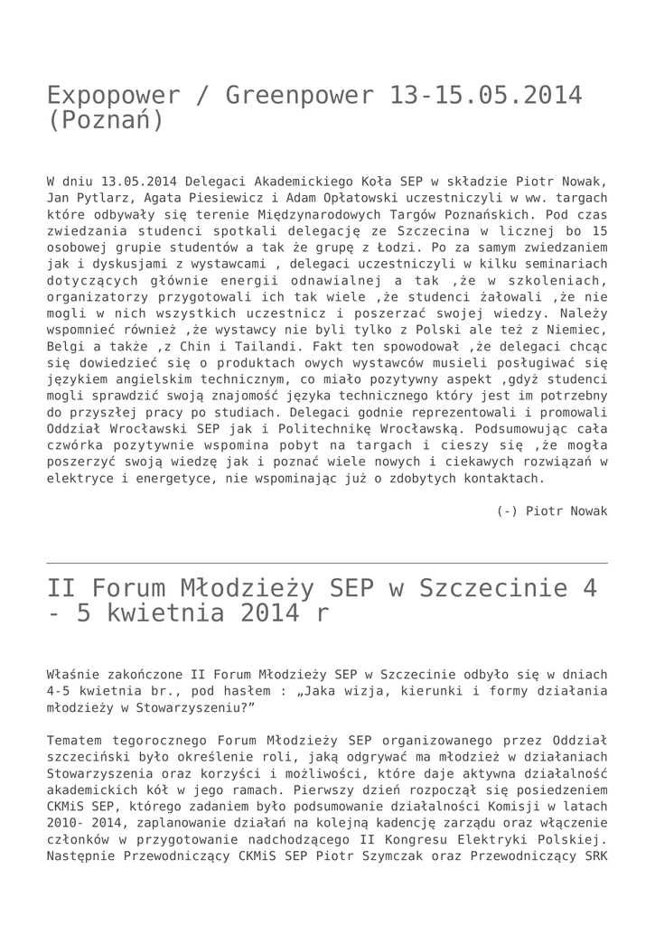 Expopower / Greenpower 13-15.05.2014 (Poznań) W dniu 13.05.2014 Delegaci Akademickiego Koła SEP w składzie Piotr Nowak, Jan Pytlarz, Agata Piesiewicz i Adam Opłatowski uczestniczyli w ww. targach które odbywały się terenie Międzynarodowych Targów Poznańskich. Pod czas zwiedzania studenci spotkali delegację ze Szczecina w licznej bo 15 osobowej grupie studentów a tak że grupę z Łodzi. Po za samym zwiedzaniem jak i dyskusjami z wystawcami , delegaci uczestniczyli w kilku seminariach dotyczących głównie energii odnawialnej a tak ,że w szkoleniach, organizatorzy przygotowali ich tak wiele ,że studenci żałowali ,że nie mogli w nich wszystkich uczestnicz i poszerzać swojej wiedzy. Należy wspomnieć również ,że wystawcy nie byli tylko z Polski ale też z Niemiec, Belgi a także ,z Chin i Tailandi. Fakt ten spowodował ,że delegaci chcąc się dowiedzieć się o produktach owych wystawców musieli posługiwać się językiem angielskim technicznym, co miało pozytywny aspekt ,gdyż studenci mogli sprawdzić swoją znajomość języka technicznego który jest im potrzebny do przyszłej pracy po studiach. Delegaci godnie reprezentowali i promowali Oddział Wrocławski SEP jak i Politechnikę Wrocławską. Podsumowując cała czwórka pozytywnie wspomina pobyt na targach i cieszy się ,że mogła poszerzyć swoją wiedzę jak i poznać wiele nowych i ciekawych rozwiązań w elektryce i energetyce, nie wspominając już o zdobytych kontaktach. (-) Piotr Nowak II Forum Młodzieży SEP w Szczecinie 4 - 5 kwietnia 2014 r Właśnie zakończone II Forum Młodzieży SEP w Szczecinie odbyło się w dniach 4-5 kwietnia br., pod hasłem : „Jaka wizja, kierunki i formy działania młodzieży w Stowarzyszeniu?” Tematem tegorocznego Forum Młodzieży SEP organizowanego przez Oddział szczeciński było określenie roli, jaką odgrywać ma młodzież w działaniach Stowarzyszenia oraz korzyści i możliwości, które daje aktywna działalność akademickich kół w jego ramach. Pierwszy dzień rozpoczął się posiedzeniem CKMiS SEP, którego zadaniem było podsumowanie działalności Komisji w latach 2010- 2014, zaplanowanie działań na kolejną kadencję zarządu oraz włączenie członków w przygotowanie nadchodzącego II Kongresu Elektryki Polskiej. Następnie Przewodniczący CKMiS SEP Piotr Szymczak oraz Przewodniczący SRK SEP Krzysztof Kalusiński powitali wszystkich gości, otwierając część wprowadzającą. Pierwszą część rozpoczęły wykłady Piotra Araka- koordynatora projektu raportu „Młodzi 2011” oraz dr Marcina Sińczucha- socjologa, adiunkta z Uniwersytetu Warszawskiego. Występujący poruszyli takie tematy jak potrzeby istnienia grup młodzieżowych z punktu widzenia socjologii czy sytuacja materialna i społeczna młodzieży na przestrzeni wieków oraz próbowali odpowiedzieć na pytanie, jak rozwiązać odwieczny problem, którym jest konflikt pokoleniowy, razem ze swoimi skutkami. Po wspólnym zdjęciu wszystkich uczestników Forum zgromadzeni w sali mogli wysłuchać debaty dotykającej tematu młodzieży oraz jej roli w publicznej strefie życia. Do udziału w debacie zaproszono gości z różnych środowisk, między innymi prof. Kazimierza Wentę (US, Szczecin), prof. Macieja Ogorzałka (UJ, Kraków), prof. Jacka Wróbla (ZUT,Szczecin), Małgorzatę Zakrzewską (US, Szczecin), Ewę Karmolińską- Jagodzik (UAM, Poznań) czy wspomnianego wcześniej dr Marcina Sińczucha. Dyskutanci wygłaszali swoje zdanie na temat pracy z młodzieżą, dochodzili do tego, jak zmieniła się ona przez ostatnie lata, jakie są sposoby na zwiększenie aktywności młodych ludzi w sferze publicznej oraz próbowali ocenić wpływ rewolucji informatycznej oraz nagłego rozwoju mediów społecznościowych na zaangażowanie społeczności studenckiej w sprawy życia codziennego. Kolejny wykład dotyczył działalności młodzieży w stowarzyszeniach. Prof. dr hab. Kazimierz Wenta oraz prof. dr hab. inż. Maciej Ogorzałek przedstawili wyniki badań społecznych dotyczących młodzieży SEP w ramach okręgu szczecińskiego oraz możliwości i korzyści, które niesie współpraca kół z IEEE, historię tej organizacji oraz perspektywy jej rozwoju. Pierwszą część zakończył wspólny obiad w Centrum Bankietowo- Konferencyjnym „Ambasador”. Część drugą rozpoczęli Jan Pytlarz oraz Paweł Cieślak panelem dyskusyjnym pod tytułem „Model działalności SRK SEP oraz rola jej liderów”. Dyskusja dotyczyła między innymi najbardziej efektywnych metod organizacji młodzieżowego koła SEP, sposobów na odkrywanie i kształcenie młodych liderów oraz najlepszego wykorzystania kreatywności członków koła. W czasie kolejnego panelu, prowadzonego przez Łukasza Turkowskiego, Marcina Rybickiego oraz Piotra Bzowskiego zgromadzeni szukali odpowiedzi na pytania dotyczące współpracy Akademickich Kół SEP z Zarządem Głównym. Poruszone problemy dotyczyły między innymi atrakcyjności kół SEP dla studentów, wizji Stowarzyszenia na temat działalności studentów czy współpracy z Kołami Pracowniczymi. Pierwszy dzień zakończyło plenarne posiedzenie SRK SEP podsumowujące działalność Rady w mijającej kadencji oraz wspólna kolacja integracyjna w Irish Pub Dublin w Szczecinie. Drugiego dnia po śniadaniu miała miejsce projekcja filmów biograficznych o wybitnych polskich inżynierachelektrykach, takich jak M. Doliwo- Dobrowolski czy Alfons Hoffmann oraz dyskusja na temat współczesnego modelu inżyniera. Po dyskusji nastąpił jeden z najważniejszych punktów Forum, czyli podsumowanie oraz listy postulatów na XXXVI WZD SEP oraz wniosków na II Kongres Elektryki Polskiej, obrazujących stanowisko młodzieży SEP w nadchodzących wydarzeniach. Forum zakończyły warsztaty Pawła Tkaczyka, w czasie których zebrani mogli usłyszeć o 10 rzeczach, najważniejszych dla budowania swojej marki jako dobrego pracownika oraz wywalczenia dobrego miejsca na ry