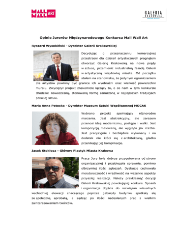 Opinie Jurorów Międzynarodowego Konkursu Mall Wall Art Ryszard Wysokiński - Dyrektor Galerii Krakowskiej Decydując o przeznaczeniu komercyjnej przestrzeni dla działań artystycznych pragnąłem otworzyć Galerię Krakowską na nowe prądy w sztuce, przemienić industrialną fasadę Galerii w artystyczną wizytówkę miasta. Od początku stałem na stanowisku, że jedynym ograniczeniem dla artystów powinny być granice ich wyobraźni oraz wielkość powierzchni muralu. Zwyciężył projekt znakomicie łączący to, o co nam w tym konkursie chodziło: nowoczesną, stonowaną formę zanurzoną w najlepszych tradycjach polskiej sztuki. Maria Anna Potocka - Dyrektor Muzeum Sztuki Współczesnej MOCAK Wybrano projekt marzenia. Jest spełniający abstrakcyjny, różnorodne ale zarazem przenosi ideę modernizmu, postępu i walki. Jest kompozycją malowaną, ale wygląda jak rzeźba. Jest precyzyjnie i bezbłędnie wykonany i na dodatek nie kłóci się z architekturą, gładko przenikając jej komplikacje. Jacek Stokłosa - Główny Plastyk Miasta Krakowa Praca Jury była dobrze przygotowana od strony organizacyjnej i przebiegała sprawnie, pomimo olbrzymiej ilości zgłoszeń. Dyskusje cechowała merytoryczność i wrażliwość na wszelkie aspekty przyszłej realizacji. Należy przyklasnąć decyzji Galerii Krakowskiej powołującej konkurs. Sposób i organizacja dojścia do rozwiązań wizualnych wschodniej ze społeczną elewacji znaczącego aprobatą, a zainteresowaniem twórców. sądząc poprzez po gabaryty ilości budynku nadesłanych spotkały prac z się wielkim Rozwiązanie totalne a jednocześnie atrakcyjne w każdym fragmencie, co jest istotne z uwagi na trudność oglądu w całości ścian Galerii. Twórcze nawiązanie do wspaniałych tradycji polskiej i krakowskiej sztuki. Przestrzenność rysunku dobrze wspomaga architekturę bocznej, zapomnianej dotychczas, elewacji budynku Galerii Krakowskiej. Motyw i tonacja obrazu współgrają z widokiem zabytkowego centrum Miasta. Magdalena Sroka - Zastępca Prezydenta Krakowa ds Kultury i Promocji Miasta Cieszę się że mogłam brać udział w obradach Jury. Wśród jego członków kompetentne, znalazły kochające się Kraków, osoby bardzo zainteresowane sztuką i street artem. W ścisłej czołówce obrad znalazły się prace o dużej rozpiętości tematycznej. Wybrany projekt Justyny Posiecz-Polkowskiej wzbudza ciekawość, porusza wyobraźnię i daje duże możliwości interpretacji. Na pewno będzie zaskakujący dla oglądających. Można w nim znaleźć odniesienia do Xawerego Dunikowskiego i jego rzeźbiarskiego stylu. Jestem przekonana, że wybrana praca całkowicie odmieni ścianę Galerii. Izabela Helbin - Dyrektor Krakowskiego Biura Festiwalowego Wygrała kompozycja monumentalna, dwudziestolecia w duchu międzywojennego, konstruktywistyczna w formie, bardzo rytmiczna. Wybraliśmy ją z powodu walorów malarskich, a także dlatego, że interesująca metaliczno-szara kolorystyka doskonale wpisuje się w sąsiedztwo stacji kolejowej. Artystka, której projekt wygrał, ma na koncie wielkoformatowe realizacje, działa w ramach gdańskiej szkoły muralu, także jej doświadczenie przekonuje, że realizacja tak dużego projektu ma szanse powodzenia. Zbigniew Bajek - Profesor Wydziału Malarstwa Akademia Sztuk Pięknych w Krakowie Nagrodzony w Międzynarodowym Konkursie Mall Wall Art projekt, którego autorką jest Justyna Posiecz-Polkowska spełnia wszystkie wymogi stawiane przez organizatorów konkursu, a jednocześnie wyróżnia się spośród ogromnej ilości pomysłów zgłoszonych na konkurs formą, kolorystyką, z budynkiem na którym się znajdzie, „sposobem z bezpośrednim dialogowania” otoczeniem oraz z... Krakowem – jego przeszłością i współczesnością. W moim odczuciu artystka nawiązuje do Warsztatów Krakowskich, powstałego na początku XX wieku stowarzyszenia skupiającego wybitnych artystów, projektantów i rzemieślników, którzy postulowali podniesienie jakości artystycznej przedmiotów powszechnego użytku. Nie wdając się w szczegóły, wspomnę tylko, że idea WK sprawdziła się, co potwierdził ogromny, światowy sukces na Międzynarodowej Wystawie Sztuk Dekoracyjnych i Nowoczesnego Przemysłu w Paryżu, w 1925 r. Nagrodzony projekt nawiązuje do snycerki – drewnianych reliefów, co sprawia, że jego rzeźbiarsko migotliwa struktura w sposób zasadniczy zmienia sztywną, geometryczną bryłę Galerii Krakowskiej, nie wchodząc jednocześnie z nią w konflikt. Łączy w sobie powagę i zabawę formą, sztukę wysoką z „ludową”; ma w sobie solidność i oddech. Jest do oglądania pod różnym kątem i z różnych odległości. Doświadczenie autorki w realizacji projektów wielkoformatowych na ścianach budynków, pozwala ufać, że i tym razem swój zamiar przełoży na właściwy objekt, zachowując wszystkie walory swojego pomysłu. Artur Wabik - Dyrektor Artystyczny konkursu Mall Wall Art, twórca murali Wyłoniony w konkursie projekt to bardzo ciekawa, zrównoważona kompozycja nawiązująca do realizacji rzeźbiarskich z lat 20-tych XX wieku. Spokojna w obszarze chromatycznym, podzielona mechanicznie na niewielkie, kwadratowe moduły jest jednocześnie niezwykle dynamiczna i pełna wewnętrznych naprężeń. Poprzecinane łuki, zagłębienia i wypukłości napierają na siebie tworząc wrażenie ciągłego ruchu. Wibrująca struktura przywodzi na myśl precyzyjny mechanizm, którego działanie widz będzie długo odkrywał. Propozycja unikalna na tle innych, powstających obecnie w Polsce murali. Bez wątpienia trudna do przeniesienia na ścianę, ze względu na dużą ilość szczegółów. Mimo to jestem dobrej myśli - gotowy mural najczęściej będzie oglądany z bliska, a każdy przechodzień powinien mieć szansę doświadczania go w pełni. Dawid Hajok - dziennikarz Gazety Wyborczej Mural nietrywialny. Podobno Józefa drewniany Dietla model stojącej dziś rzeźby przy