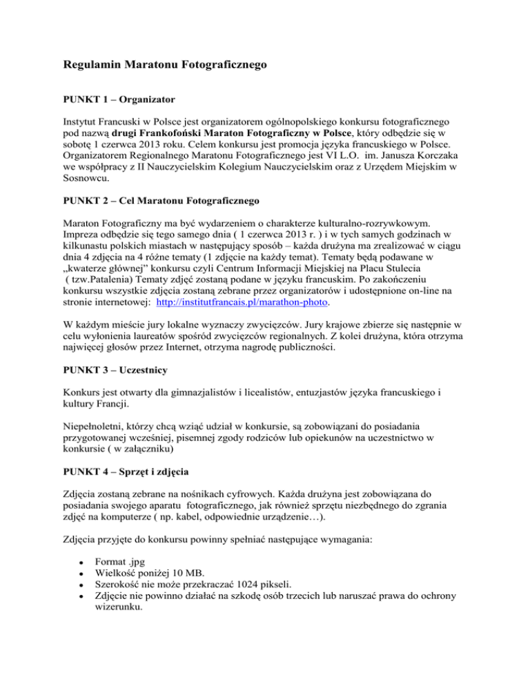 Regulamin Maratonu Fotograficznego PUNKT 1 – Organizator Instytut Francuski w Polsce jest organizatorem ogólnopolskiego konkursu fotograficznego pod nazwą drugi Frankofoński Maraton Fotograficzny w Polsce, który odbędzie się w sobotę 1 czerwca 2013 roku. Celem konkursu jest promocja języka francuskiego w Polsce. Organizatorem Regionalnego Maratonu Fotograficznego jest VI L.O. im. Janusza Korczaka we współpracy z II Nauczycielskim Kolegium Nauczycielskim oraz z Urzędem Miejskim w Sosnowcu. PUNKT 2 – Cel Maratonu Fotograficznego Maraton Fotograficzny ma być wydarzeniem o charakterze kulturalno-rozrywkowym. Impreza odbędzie się tego samego dnia ( 1 czerwca 2013 r. ) i w tych samych godzinach w kilkunastu polskich miastach w następujący sposób – każda drużyna ma zrealizować w ciągu dnia 4 zdjęcia na 4 różne tematy (1 zdjęcie na każdy temat). Tematy będą podawane w „kwaterze głównej” konkursu czyli Centrum Informacji Miejskiej na Placu Stulecia ( tzw.Patalenia) Tematy zdjęć zostaną podane w języku francuskim. Po zakończeniu konkursu wszystkie zdjęcia zostaną zebrane przez organizatorów i udostępnione on-line na stronie internetowej: http://institutfrancais.pl/marathon-photo. W każdym mieście jury lokalne wyznaczy zwycięzców. Jury krajowe zbierze się następnie w celu wyłonienia laureatów spośród zwycięzców regionalnych. Z kolei drużyna, która otrzyma najwięcej głosów przez Internet, otrzyma nagrodę publiczności. PUNKT 3 – Uczestnicy Konkurs jest otwarty dla gimnazjalistów i licealistów, entuzjastów języka francuskiego i kultury Francji. Niepełnoletni, którzy chcą wziąć udział w konkursie, są zobowiązani do posiadania przygotowanej wcześniej, pisemnej zgody rodziców lub opiekunów na uczestnictwo w konkursie ( w załączniku) PUNKT 4 – Sprzęt i zdjęcia Zdjęcia zostaną zebrane na nośnikach cyfrowych. Każda drużyna jest zobowiązana do posiadania swojego aparatu fotograficznego, jak również sprzętu niezbędnego do zgrania zdjęć na komputerze ( np. kabel, odpowiednie urządzenie…). Zdjęcia przyjęte do konkursu powinny spełniać następujące wymagania: Format .jpg Wielkość poniżej 10 MB. Szerokość nie może przekraczać 1024 pikseli. Zdjęcie nie powinno działać na szkodę osób trzecich lub naruszać prawa do ochrony wizerunku. Prawo do ochrony wizerunku ma zastosowanie jedynie w przypadku możliwości rozpoznania osoby przedstawionej na zdjęciu. Osoba sfotografowana w zwartym tłumie lub odwrócona plecami nie jest uznawana za możliwą do rozpoznania. Tak samo w przypadku zdjęcia wyretuszowanego lub zmienionego, na którym osoba nie jest już rozpoznawalna. Uczestnicy są zobowiązani uzyskać pozwolenie osoby widniejącej na zdjęciu na wykorzystanie jej wizerunku poprzez podpisanie przez nią zgody na zrobienie jej zdjęcia, która zostanie następnie przekazana organizatorom lokalnym. W czasie trwania Frankofońskiego Maratonu Fotograficznego, uczestnicy zobowiązują się wykonać samodzielnie wszystkie fotografie. W każdym przypadku będą więc traktowani przez organizatora konkursu jako autorzy zdjęć. Dozwolony jest retusz zdjęć (zmiana kolorów, odcieni). PUNKT 5 – Formy zapisu Zapisy odbywają się poprzez formularz na stronie www.korczak.edu.pl link maraton foto, do dnia 26 maja do północy. W dniu maratonu fotograficznego, uczestnicy zobowiązani są posiadać: 1) Zgodę na wykorzystanie swoich zdjęć przez organizatorów konkursu. ( w załączniku) 2) Osoby niepełnoletnie dołączają pisemną zgodę swoich rodziców lub opiekunów na udział w konkursie ( w załączniku) 3) i Zgoda na wykorzystanie zdjęcia prywatnego miejsca ( w załączniku) PUNKT 6 – Przebieg Frankofońskiego Maratonu Fotograficznego Dnia 1 czerwca 2013 roku o godzinie 9.30, uczestnicy stawią się wraz ze swoimi aparatami w „kwaterze głównej” konkursu w CIP na Placu Stulecia, wyznaczonej przez komitet lokalny. Dwa pierwsze tematy zostaną podane o godzinie 10. Natomiast dwa ostatnie o godzinie 14 zarówno w „kwaterze głównej” konkursu jak i na stronach internetowych Instytutu francuskiego w Warszawie i Instytutu francuskiego w Krakowie na Facebook’u. Uczestnicy muszą zgłosić się przed godziną 17 w „ kwaterze głównej” konkursu w celu oddania zdjęć organizatorom. PUNKT 7 – Nagrody Po zakończeniu konkursu wszystkie zdjęcia zostaną zgrane do komputera i udostępnione online na stronie http://institutfrancais.pl/marathon-photo. W każdym mieście jury lokalne wyznacza zwycięzców. Jury krajowe zbiera się następnie w celu wyłonienia zwycięzców spośród laureatów regionalnych. Drużyna, która otrzyma najwięcej głosów przez Internet otrzyma nagrodę publiczności. Wyniki zostaną opublikowane na stronie http://institutfrancais.pl/marathon-photo. Zdjęcia będę oceniane na podstawie następujących kryteriów: Zgodność z podanymi tematami. Kreatywność, oryginalne podejście do tematu. Jakość wykonania i kompozycji. Umiejętność powiązania zdjęć w tematyczną całość.