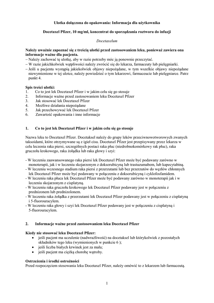 Ulotka dołączona do opakowania: Informacja dla użytkownika Docetaxel Pfizer, 10 mg/ml, koncentrat do sporządzania roztworu do infuzji Docetaxelum Należy uważnie zapoznać się z treścią ulotki przed zastosowaniem leku, ponieważ zawiera ona informacje ważne dla pacjenta. − Należy zachować tę ulotkę, aby w razie potrzeby móc ją ponownie przeczytać. − W razie jakichkolwiek wątpliwości należy zwrócić się do lekarza, farmaceuty lub pielęgniarki. − Jeśli u pacjenta wystąpią jakiekolwiek objawy niepożądane, w tym wszelkie objawy niepożądane niewymienione w tej ulotce, należy powiedzieć o tym lekarzowi, farmaceucie lub pielęgniarce. Patrz punkt 4. Spis treści ulotki: 1. Co to jest lek Docetaxel Pfizer i w jakim celu się go stosuje 2. Informacje ważne przed zastosowaniem leku Docetaxel Pfizer 3. Jak stosować lek Docetaxel Pfizer 4. Możliwe działania niepożądane 5. Jak przechowywać lek Docetaxel Pfizer 6. Zawartość opakowania i inne informacje 1. Co to jest lek Docetaxel Pfizer i w jakim celu się go stosuje Nazwa leku to Docetaxel Pfizer. Docetaksel należy do grupy leków przeciwnowotworowych zwanych taksoidami, które otrzymywane są z igieł cisu. Docetaxel Pfizer jest przepisywany przez lekarza w celu leczenia raka piersi, szczególnych postaci raka płuc (niedrobnokomórkowy rak płuc), raka gruczołu krokowego, raka żołądka lub raka głowy i szyi: - W leczeniu zaawansowanego raka piersi lek Docetaxel Pfizer może być podawany zarówno w monoterapii, jak i w leczeniu skojarzonym z doksorubicyną lub trastuzumabem, lub kapecytabiną. - W leczeniu wczesnego stadium raka piersi z przerzutami lub bez przerzutów do węzłów chłonnych lek Docetaxel Pfizer może być podawany w połączeniu z doksorubicyną i cyklofosfamidem. - W leczeniu raka płuca lek Docetaxel Pfizer może być podawany zarówno w monoterapii jak i w leczeniu skojarzonym z cisplatyną. - W leczeniu raka gruczołu krokowego lek Docetaxel Pfizer podawany jest w połączeniu z prednizonem lub prednizolonem. - W leczeniu raka żołądka z przerzutami lek Docetaxel Pfizer podawany jest w połączeniu z cisplatyną i 5-fluorouracylem. - W leczeniu raka głowy i szyi lek Docetaxel Pfizer podawany jest w połączeniu z cisplatyną i 5-fluorouracylem. 2. Informacje ważne przed zastosowaniem leku Docetaxel Pfizer Kiedy nie stosować leku Docetaxel Pfizer: • jeśli pacjent ma uczulenie (nadwrażliwość) na docetaksel lub którykolwiek z pozostałych składników tego leku (wymienionych w punkcie 6 ); • jeśli liczba białych krwinek jest za mała; • jeśli pacjent ma ciężką chorobę wątroby. Ostrzeżenia i środki ostrożności Przed rozpoczęciem stosowania leku Docetaxel Pfizer, należy omówić to z lekarzem lub farmaceutą. 1 Przed każdym podaniem leku Docetaxel Pfizer zostaną przeprowadzone badania krwi, aby sprawdzić, czy liczba komórek krwi i czynność wątroby są odpowiednie do podania leku Docetaxel Pfizer. Jeśli liczba białych krwinek jest za mała, może wystąpić gorączka lub rozwinąć się zakażenie. Należy powiedzieć lekarzowi, farmaceucie lub pielęgniarce o wystąpieniu problemów z widzeniem. W przypadku wystąpienia problemów z widzeniem, a zwłaszcza niewyraźnego widzenia, należy natychmiast poddać się badaniu oczu i wzroku. W przypadku wystąpienia ostrych lub pogarszających się problemów z płucami (gorączka, duszność lub kaszel), należy natychmiast powiedzieć o tym lekarzowi, farmaceucie lub pielęgniarce. Lekarz może natychmiast przerwać leczenie. Jeden dzień przed podaniem leku Docetaxel Pfizer oraz jeden do dwóch dni po jego podaniu, lekarz zaleci przyjęcie doustnych steroidów, takich jak deksametazon, w celu zmniejszenia nasilenia objawów niepożądanych, które mogą pojawić się po podaniu leku Docetaxel Pfizer. Te działania niepożądane to w szczególności reakcje alergiczne i zatrzymanie płynów (objawiające się obrzękiem rąk, stóp, nóg lub zwiększeniem masy ciała). Podczas leczenia może być zalecone przyjmowanie leków utrzymujących prawidłową liczbę komórek krwi. Lek Docetaxel Pfizer zawiera alkohol. Należy poinformować lekarza, jeśli pacjent jest uzależniony od alkoholu lub cierpi na niewydolność wątroby. Patrz także punkt „Docetaxel Pfizer zawiera etanol i glikol propylenowy”. Lek Docetaxel Pfizer a inne leki Należy powiedzieć lekarzowi lub farmaceucie o wszystkich lekach przyjmowanych przez pacjenta obecnie lub ostatnio, również tych, które wydawane są bez recepty. Lek Docetaxel Pfizer lub inne leki mogą nie działać zgodnie z oczekiwaniem albo może zwiększyć się ryzyko wystąpienia działań niepożądanych. Ilość alkoholu, którą zawiera ten produkt leczniczy, może wpływać na działanie innych leków. W razie wątpliwości należy skonsultować się z lekarzem. Ciąża, karmienie piersią i wpływ na płodność Przed zastosowaniem każdego leku należy poradzić się lekarza. NIE stosować leku Docetaxel Pfizer w czasie ciąży bez wyraźnego zalecenia lekarza. Kobietom w wieku rozrodczym należy zalecić, aby w czasie leczenia docetakselem unikały zachodzenia w ciążę. Konieczne jest w tym czasie stosowanie skutecznej antykoncepcji, gdyż docetaksel może być bardzo szkodliwy dla płodu. Jeśli pacjentka zajdzie w ciążę w trakcie leczenia, musi niezwłocznie poinformować o tym lekarza. Nie karmić piersią podczas leczenia lekiem Docetaxel Pfizer. Mężczyznom leczonym lekiem Docetaxel Pfizer odradza się poczęcie dziecka w czasie leczenia i przez 6 miesięcy po jego zakończeniu. Powinni oni zasięgnąć porady dotyczącej możliwości przechowania nasienia przed rozpoczęciem leczenia, gdyż docetaksel może zaburzać płodność mężczyzn. Prowadzenie pojazdów i obsługiwanie maszyn Zawartość alkoholu w tym produkcie leczniczym może zaburzać zdolność do prowadzenia pojazdów i obsługiwania maszyn. Docetaxel Pfizer zawiera etanol