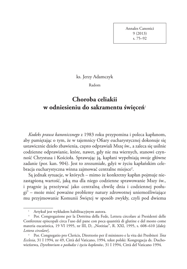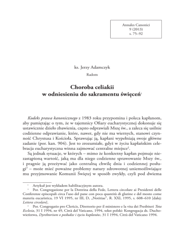 Annales Canonici 9 (2013) s. 75–92 ks. Jerzy Adamczyk Radom Choroba celiakii w odniesieniu do sakramentu święceń1 Kodeks prawa kanonicznego z 1983 roku przypomina i poleca kapłanom, aby pamiętając o tym, że w tajemnicy Ofiary eucharystycznej dokonuje się ustawicznie dzieło zbawienia, często odprawiali Mszę św., a zaleca się usilnie codzienne odprawianie, które, nawet, gdy nie ma wiernych, stanowi czynność Chrystusa i Kościoła. Sprawując ją, kapłani wypełniają swoje główne zadanie (por. kan. 904). Jest to zrozumiałe, gdyż w życiu kapłańskim celebracja eucharystyczna winna zajmować centralne miejsce2. Są jednak sytuacje, w których – mimo że konkretny kapłan pojmuje niezastąpioną wartość, jaką ma dla niego codzienne sprawowanie Mszy św., i pragnie ją przeżywać jako centralną chwilę dnia i codziennej posługi3 – może mieć poważne problemy natury zdrowotnej uniemożliwiające mu przyjmowanie Komunii Świętej w sposób zwykły, czyli pod dwiema Artykuł jest wykładem habilitacyjnym autora. Por. Congregazione per la Dottrina della Fede, Lettera circolare ai Presidenti delle Conferenze episcopali circa l’uso del pane con poca quantità di glutine e del mosto come materia eucaristica, 19 VI 1995, nr III, D, „Notitiae”, R. XXI, 1995, s. 608–610 [dalej: Lettera circolare]. 3 Por. Congregatio pro Clericis, Direttorio per il ministero e la vita dei Presbiteri Tota Ecclesia, 31 I 1994, nr 49, Città del Vaticano, 1994, tekst polski: Kongregacja ds. Duchowieństwa, Dyrektorium o posłudze i życiu kapłanów, 31 I 1994, Città del Vaticano 1994. 1 2 ks. Jerzy Adamczyk 76 postaciami. Przyjmowanie Ciała Pańskiego może uniemożliwiać choroba celiakii, a przyjmowanie Krwi Pańskiej pod postacią wina – alkoholizm lub inna choroba, w której przyjęcie nawet minimalnej ilości alkoholu stanowi przeciwwskazanie. Przedmiotem niniejszych dywagacji będzie problem celiakii w relacji do sakramentu święceń. Najpierw przedstawi się skrótowo i w formie popularno-naukowej zjawisko celiakii, potem omówi się możliwość przyjmowania Komunii Świętej przez dotkniętych chorobą trzewną, by na koniec, nieco obszerniej, wyeksplikować problem celiakii i dopuszczania do sakramentu święceń. 1. Zjawisko celiakii4 Celiakia (choroba trzewna) to trwająca całe życie immunologiczna choroba o podłożu genetycznym, charakteryzująca się nietolerancją glutenu, białka zapasowego zawartego w zbożach (pszenicy, życie, jęczmieniu, owsie). Nieprawidłowa reakcja immunologiczna wywoływana jest nadmierną odpowiedzią immunologiczną na grupę białek zbożowych zwanych prolaminami. Działający toksycznie gluten prowadzi do zaniku kosmków jelita cienkiego, maleńkich wypustek błony śluzowej, które zwiększają jego powierzchnię i są odpowiedzialne za wchłanianie składników odżywczych. W efekcie toksycznego działania glutenu wchłanianie pokarmu jest upośledzone, co prowadzi do wystąpienia różnorodnych objawów klinicznych. Celiakia nie jest alergią, choć często jest z nią mylona. Pierwsze wzmianki o chorobie trzewnej ukazały się w II wieku przed Chr. (Hipokrates i Arateus). Celiakia jest najpoważniejszą nietolerancją pokarmową człowieka. Patogeneza choroby trzewnej jest niejednoznaczna. Choroba nie jest wrodzona ani dziedziczna, może pojawić się w każdym okresie życia. Szacuje się, że nietolerancja glutenu występuje u 1 proc. populacji. Najczęściej rozwija się we wczesnym dzieciństwie i po 50 roku życia. Częściej występuje u kobiet niż u mężczyzn (2:1). Występowanie choroby u krewnego pierwszego stopnia zwiększa jej ryzyko. O rozwoju celiakii decyduje kilka czynników: genetyczny, metaboliczny, immunologiczny, środowiskowy i prawdopodobnie infekcyjny. Punkt ten opracowano na podstawie: Polskie Stowarzyszenie Osób z Celiakią i na Diecie Bezglutenowej, Celiakia, www.celiakia.pl (1.02.2012). 4 Choroba celiakii… 77 Gdy idzie o postacie kliniczne, to choroba trzewna może mieć postać klasyczną (aktywną), występuje u ok. 30 proc. przypadków, objawia się bólami brzucha, wzdęciami, biegunkami tłuszczowymi lub wodnistymi, objawami niedoborowymi składników pokarmowych (m.in. anemia), spadkiem masy ciała, zaburzeniami rozwoju u dzieci (m.in. niskorosłość), zmianami w zachowaniu (m.in. depresja). W postaci niemej (ubogoobjawowej) – występują typowe zmiany w błonie śluzowej jelita, nie występują jednak objawy choroby aktywnej. Może natomiast pojawić się m.in.: niedokrwistość, próchnica zębów, niedorozwój szkliwa zębowego, nawrotowe wrzodziejące zapalenia jamy ustnej, podwyższony poziom cholesterolu, zaburzenia neurologiczne, otępienie, schizofrenia, upośledzenie umysłowe, wczesna osteoporoza, nawykowe poronienia. Wreszcie celiakia występuje w postaci ukrytej (latentnej) – mimo że wynik biopsji jelita cienkiego jest prawidłowy. Jednak skąpoobjawowy lub bezobjawowy przebieg nieleczonej choroby trzewnej nie chroni przed wystąpieniem poważnych powikłań, tj. wspomnianej wcześniej niepłodności męskiej, poronień, zaburzeń mineralizacji kości, zwiększonego ryzyka rozwoju chorób o podłożu autoimmunologicznym czy chłoniaka jelita cienkiego. Gdy chodzi o epidemiologię choroby trzewnej, to określenie częstości jej występowania jest niezwykle trudne. Wynika to z jednej strony z faktu, że publikowane dane są niepełne lub dotyczą jedynie wybranego regionu czy populacji. Z drugiej zaś strony na częstość ujawnienia się celiakii wywierają wpływ lokalne nawyki żywieniowe i związany z tym czas wprowadzenia glutenu oraz jego zawartość w diecie. Częstość występowania celiakii w Europie i Stanach Zjednoczonych oszacowano od 1: 130 do 1: 350. W Polsce badania epidemiologiczne przeprowadzono w połowie lat dziewięćdziesiątych, a uzyskane dane były zbliżone do innych krajów europejskich: Szwecja 1: 250; Dania 1: 400; Włochy 1: 300; Francja 1