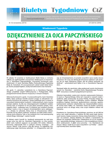 Biuletyn Tygodniowy CIZ Biuletyn Centrum Informacyjnego Zakonów opracowywany przez zespół portalu internetowego www.zyciezakonne.pl i sekretariat Konferencji Wyższych Przełożonych Zakonów Męskich 6-12 września 2016 37/2016 (394) Wiadomość Tygodnia DZIĘKCZYNIENIE ZA OJCA PAPCZYŃSKIEGO W sobotę 10 września w Sanktuarium Matki Bożej w Licheniu odbyły się ogólnopolskie uroczystości dziękczynne za kanonizację o. Stanisława Papczyńskiego. Uroczystej Eucharystii przewodniczył J. E. kard. Stanisław Ryłko, Przewodniczący Papieskiej Rady ds. Świeckich. W uroczystościach udział wzięli także biskupi, licznie przybyli kapłani, osoby konsekrowane oraz marianie. Ok. godz. 11, sylwetkę i przesłanie św. o. Stanisława Papczyńskiego przybliżył zespół folklorystyczny z Podegrodzia, który przygotował montaż słowno-muzyczny o nowym Świętym. Głównej Eucharystii o godz. 12 przewodniczył ks. kard. Stanisław Ryłko, który podczas homilii zwrócił uwagę na aktualność wezwania Chrystusa do świętości: „Święci pokazują nam, iż nawet w warunkach ekstremalnie trudnych i niekorzystnych, życie można przeżyć pięknie. Są dla nas niezastąpionymi świadkami nadziei; mówią nam, iż świętość to nie jest jakaś nierealna utopia, nieosiągalny ideał – pokazują nam, iż świętość jest możliwa również dzisiaj i warto o nią w naszym chrześcijańskim życiu zabiegać.” […] „Święty to człowiek, który trwa w Chrystusowej miłości. Pozwala się tej miłości dotknąć. Świętość ma tylko jedna miarę – mierzy się ja miłością. Tyle w nas świętości ile w nas autentycznej miłości Boga i bliźniego”. (całość homilii W dalszej części homilii ks. kardynał zastanawiał się nad tym, czego uczy nas dziś św. Stanisław Papczyński, co chce powiedzieć nam, ludziom żyjącym na początku XXI wieku. Zdaniem hierarchy odpowiedź tkwi w pełnym imieniu świętego – od Jezusa i Maryi; „Cały Jezusa i cały dla Jezusa. To najpełniej charakteryzuje jego duchową sylwetkę”. [..] „Przypomina nam dzi- siaj, że chrześcijaństwo, to przede wszystkim żywa osoba Jezusa Chrystusa. On uczy nas dzisiaj jak Chrystusa wybierać i jak otwierać się na Jego miłosierną miłość, jak tej miłości pozwolić się dotknąć” – powiedział kard. Ryłko o św. o. Stanisławie Papczyńskim. Nawiązał także do spuścizny, jaką podarował swoim duchowym synom św. Stanisław – szerzenie kultu Niepokalanego Poczęcia NMP oraz praca z osobami pogubionymi życiowo. Zdaniem kaznodziei, ważne jest również usytuowanie historyczne życia o. Papczyńskiego, który żył i nauczał w czasach wojen i epidemii, jakie przetaczały się przez Polskę. Przyszły święty dostrzegał nędzę moralną i materialną swoich rodaków. Widział problemy trapiące ówczesne społeczeństwo: prywatę, egoizm, nadużywanie wolności szlacheckiej czy niesprawiedliwe prawa. W ocenie kard. Ryłko, św. Stanisław starał się budzić sumienia, nawracał serca na drogę wiary oraz uczył rodaków miłości do Ojczyzny. Przesłanie św. Stanisława Papczyńskiego, pomimo, że żył 300 lat temu, jest nadal aktualne, a spełnia się dziś przez jego duchowych synów, księży marianów, którzy służą Kościołowi w Ojczyźnie i na świecie: „Dzisiaj dzielimy ich radość z wyniesienia na ołtarze ich świętego Założyciela i dziękujemy im za ich świadectwo i apostolską posługę, zwłaszcza w tym przepięknym licheńskim sanktuarium. Z głębi serca prosimy – św. Stanisławie od Jezusa i Maryi, módl się za nami wszystkimi i za Polskę” – zakończył homilię kard. Stanisław Ryłko. Biuletyn Tygodniowy CiZ 6-12 września 2016 37/2016 (394) ______________________________________________________________________________________________ Tuż przed zakończeniem Mszy św. ks. prałat Zbigniew Kras, kapelan Prezydenta RP Andrzeja Dudy, odczytał list wystosowany przez Prezydenta do uczestników licheńskich uroczystości, a następnie głos zabrał ks. Paweł Naumowicz MIC, przełożony Zgromadzenia Księży Marianów Polsce. papieskiego kardynała Tarcisio Bertone, zaś pośród pielgrzymów był także Prezydent Rzeczypospolitej Polskiej Lech Kaczyński. I dziś ponownie stajemy w tym sanktuarium, aby dziękować za wyniesienie na ołtarze naszego rodaka, ale i prosić za Jego wstawiennictwem o pomyślność dla naszej Ojczyzny i narodu. Prezydent Rzeczypospolitej Polskiej To dobrze, że w Roku Miłosierdzia i 1050. rocznicy Chrztu Polski możemy cieszyć się takim patronem. Wierzę, że ten gorliwy patriota, głosiciel sprawiedliwości społecznej i znakomity kaznodzieja, jedna z najwybitniejszych postaci XVIIwiecznej Rzeczypospolitej stanie się także życiowym wzorem dla wielu współczesnych. Warszawa, 10 września 2016 roku Uczestnicy i Organizatorzy uroczystej Mszy św. za dar kanonizacji bł. Ojca Stanisława Papczyńskiego w Bazylice Najświętszej Maryi Panny Licheńskiej w Licheniu Życzę wszystkim licheńskim pielgrzymom oraz Zgromadzeniu Księży Marianów, aby czerpali z tego wielkiego dziedzictwa. Życzę Państwu radosnego świętowania i wszelkiego dobra. Z wyrazami szacunku i sympatii Andrzej Duda Eminencjo Księże Kardynale! Ekscelencjo Księże Biskupie! Czcigodni Księża Marianie! Czcigodni Kapłani! Szanowni Państwo! Drodzy Pielgrzymi! Dzisiejsza uroczystość w Bazylice Najświętszej Maryi Panny Licheńskiej jest ogólnopolskim dziękczynieniem za kanonizację bł. Ojca Stanisława Papczyńskiego. To nie pierwsza okazja, aby podziękować za dar jego życia i osoby. W czerwcu tego roku uczestniczyłem wraz z Małżonką w uroczystości kanonizacyjnej w Rzymie. To wielkie przeżycie duchowe, które pozwala bezpośrednio doświadczyć powszechności Kościoła. Ks. Prowincjał zauważył, że „dziś każdy z nas jest zaproszony, aby odnaleźć w św. Stanisławie orędownika i przyjaciela”. Dziękował w