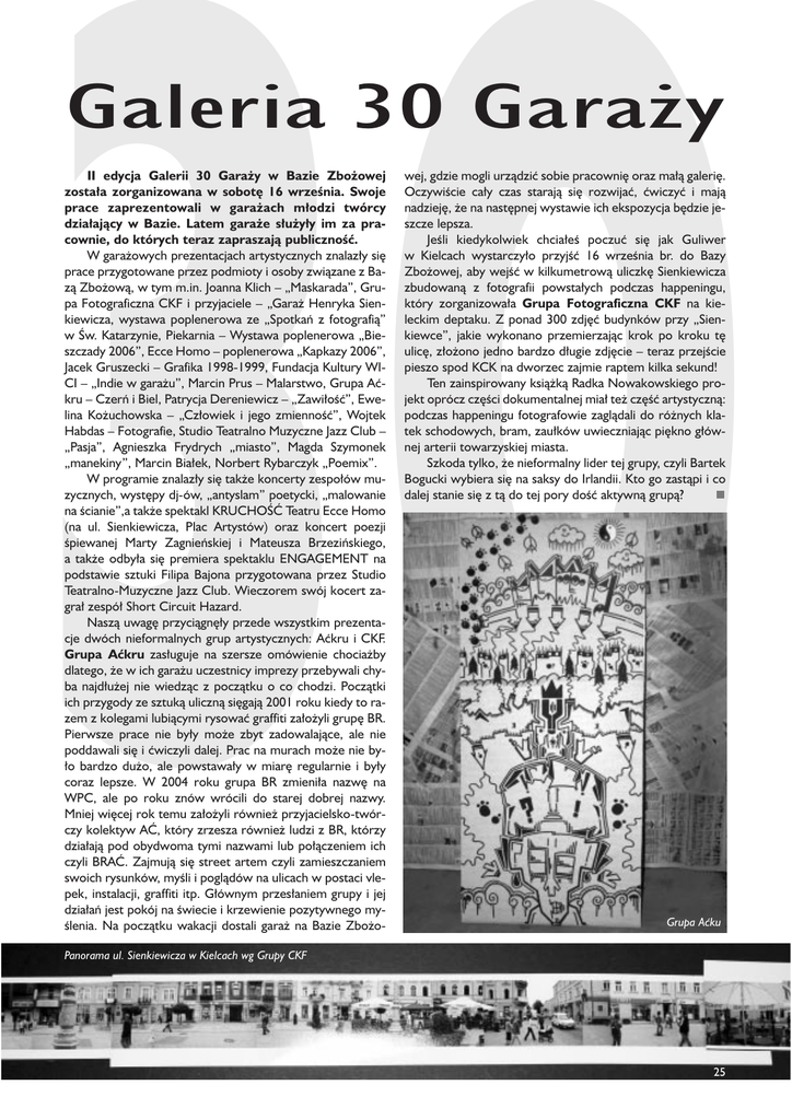 30 Galeria 30 Gara¿y II edycja Galerii 30 Gara¿y w Bazie Zbo¿owej zosta³a zorganizowana w sobotê 16 wrzeœnia. Swoje prace zaprezentowali w gara¿ach m³odzi twórcy dzia³aj¹cy w Bazie. Latem gara¿e s³u¿y³y im za pracownie, do których teraz zapraszaj¹ publicznoœæ. W gara¿owych prezentacjach artystycznych znalaz³y siê prace przygotowane przez podmioty i osoby zwi¹zane z Baz¹ Zbo¿ow¹, w tym m.in. Joanna Klich – „Maskarada”, Grupa Fotograficzna CKF i przyjaciele – „Gara¿ Henryka Sienkiewicza, wystawa poplenerowa ze „Spotkañ z fotografi¹” w Œw. Katarzynie, Piekarnia – Wystawa poplenerowa „Bieszczady 2006”, Ecce Homo – poplenerowa „Kapkazy 2006”, Jacek Gruszecki – Grafika 1998-1999, Fundacja Kultury WICI – „Indie w gara¿u”, Marcin Prus – Malarstwo, Grupa Aækru – Czerñ i Biel, Patrycja Dereniewicz – „Zawi³oœæ”, Ewelina Ko¿uchowska – „Cz³owiek i jego zmiennoœæ”, Wojtek Habdas – Fotografie, Studio Teatralno Muzyczne Jazz Club – „Pasja”, Agnieszka Frydrych „miasto”, Magda Szymonek „manekiny”, Marcin Bia³ek, Norbert Rybarczyk „Poemix”. W programie znalaz³y siê tak¿e koncerty zespo³ów muzycznych, wystêpy dj-ów, „antyslam” poetycki, „malowanie na œcianie”,a tak¿e spektakl KRUCHOŒÆ Teatru Ecce Homo (na ul. Sienkiewicza, Plac Artystów) oraz koncert poezji œpiewanej Marty Zagnieñskiej i Mateusza Brzeziñskiego, a tak¿e odby³a siê premiera spektaklu ENGAGEMENT na podstawie sztuki Filipa Bajona przygotowana przez Studio Teatralno-Muzyczne Jazz Club. Wieczorem swój kocert zagra³ zespó³ Short Circuit Hazard. Nasz¹ uwagê przyci¹gnê³y przede wszystkim prezentacje dwóch nieformalnych grup artystycznych: Aækru i CKF. Grupa Aækru zas³uguje na szersze omówienie chocia¿by dlatego, ¿e w ich gara¿u uczestnicy imprezy przebywali chyba najd³u¿ej nie wiedz¹c z pocz¹tku o co chodzi. Pocz¹tki ich przygody ze sztuk¹ uliczn¹ siêgaj¹ 2001 roku kiedy to razem z kolegami lubi¹cymi rysowaæ graffiti za³o¿yli grupê BR. Pierwsze prace nie by³y mo¿e zbyt zadowalaj¹ce, ale nie poddawali siê i æwiczyli dalej. Prac na murach mo¿e nie by³o bardzo du¿o, ale powstawa³y w miarê regularnie i by³y coraz lepsze. W 2004 roku grupa BR zmieni³a nazwê na WPC, ale po roku znów wrócili do starej dobrej nazwy. Mniej wiêcej rok temu za³o¿yli równie¿ przyjacielsko-twórczy kolektyw AÆ, który zrzesza równie¿ ludzi z BR, którzy dzia³aj¹ pod obydwoma tymi nazwami lub po³¹czeniem ich czyli BRAÆ. Zajmuj¹ siê street artem czyli zamieszczaniem swoich rysunków, myœli i pogl¹dów na ulicach w postaci vlepek, instalacji, graffiti itp. G³ównym przes³aniem grupy i jej dzia³añ jest pokój na œwiecie i krzewienie pozytywnego myœlenia. Na pocz¹tku wakacji dostali gara¿ na Bazie Zbo¿o- wej, gdzie mogli urz¹dziæ sobie pracowniê oraz ma³¹ galeriê. Oczywiœcie ca³y czas staraj¹ siê rozwijaæ, æwiczyæ i maj¹ nadziejê, ¿e na nastêpnej wystawie ich ekspozycja bêdzie jeszcze lepsza. Jeœli kiedykolwiek chcia³eœ poczuæ siê jak Guliwer w Kielcach wystarczy³o przyjœæ 16 wrzeœnia br. do Bazy Zbo¿owej, aby wejœæ w kilkumetrow¹ uliczkê Sienkiewicza zbudowan¹ z fotografii powsta³ych podczas happeningu, który zorganizowa³a Grupa Fotograficzna CKF na kieleckim deptaku. Z ponad 300 zdjêæ budynków przy „Sienkiewce”, jakie wykonano przemierzaj¹c krok po kroku tê ulicê, z³o¿ono jedno bardzo d³ugie zdjêcie – teraz przejœcie pieszo spod KCK na dworzec zajmie raptem kilka sekund! Ten zainspirowany ksi¹¿k¹ Radka Nowakowskiego projekt oprócz czêœci dokumentalnej mia³ te¿ czêœæ artystyczn¹: podczas happeningu fotografowie zagl¹dali do ró¿nych klatek schodowych, bram, zau³ków uwieczniaj¹c piêkno g³ównej arterii towarzyskiej miasta. Szkoda tylko, ¿e nieformalny lider tej grupy, czyli Bartek Bogucki wybiera siê na saksy do Irlandii. Kto go zast¹pi i co dalej stanie siê z t¹ do tej pory doœæ aktywn¹ grup¹? Grupa Aæku Panorama ul. Sienkiewicza w Kielcach wg Grupy CKF 25 Gara¿ grupy Aæku Galeria 30 Gara¿y Spektakl „Engagement”, fot. W. Habdas Aækru przy pracy El¿bieta Ko¿uchowska „Cz³owiek i jego zmiennoœæ” zdjêcia: T. Kosiñski Joanna Klich „Maskarada” 26 Jedna z ekspozycji przypominaj¹ca „suszenie sztuki”