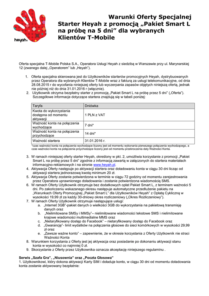 Warunki Oferty Specjalnej Starter Heyah z promocją „Pakiet Smart L na próbę na 5 dni” dla wybranych Klientów T-Mobile Oferta specjalna T-Mobile Polska S.A., Operatora Usługi Heyah z siedzibą w Warszawie przy ul. Marynarskiej 12 (zwanego dalej „Operatorem” lub „Heyah”). 1. Oferta specjalna skierowana jest do Użytkowników starterów promocyjnych Heyah, dystrybuowanych przez Operatora dla wybranych Klientów T-Mobile wraz z fakturą za usługi telekomunikacyjne, od dnia 28.08.2015 r do wycofania niniejszej oferty lub wyczerpania zapasów objętych niniejszą ofertą, jednak nie później niż do dnia 31.01.2016 r (włącznie). 2. Użytkownik otrzyma bezpłatny starter z promocją „Pakiet Smart L na próbę przez 5 dni” („Oferta”). Szczegółowe informacje dotyczące startera znajdują się w tabeli poniżej: Taryfa Kwota do wykorzystania dostępna od momentu aktywacji Ważność konta na połączenia wychodzące Ważność konta na połączenia przychodzące Dniówka Ważność startera 31.01.2016 r. 1 PLN z VAT 7 dni* 14 dni* *czas ważności konta na połączenia wychodzące liczony jest od momentu wykonania pierwszego połączenia wychodzącego, a czas ważności konta na połączenia przychodzące liczony jest od momentu przekroczenia daty Ważności Konta. 3. W ramach niniejszej oferty starter Heyah, określony w pkt. 2, umożliwia korzystanie z promocji „Pakiet Smart L na próbę przez 5 dni” zgodnie z informacją zawartą w załączonych do startera materiałach informacyjno-reklamowych i na stronie www.heyah.pl. 4. Aktywacja Oferty następuje po aktywacji startera oraz doładowaniu konta w ciągu 30 dni licząc od aktywacji startera jednorazową kwotą minimum 20 zł. 5. Aktywacja Oferty zostanie potwierdzona w terminie w ciągu 72 godziny od momentu zarejestrowania przez Operatora uprawnionego doładowania i zostanie potwierdzona wiadomością SMS. 6. W ramach Oferty Użytkownik otrzymuje bez dodatkowych opłat Pakiet Smart L, z terminem ważności 5 dni. Po zakończeniu wskazanego okresu następuje automatyczne przedłużenie pakietu na „Warunkach Oferty Promocyjnej „Pakiet Smart L” dla Użytkowników Heyah” z Opłatą Cykliczną w wysokości 19,99 zł za każdy 30-dniowy okres rozliczeniowy („Okres Rozliczeniowy”). 7. W ramach Oferty Użytkownik otrzymuje następujące usługi: a. „Internet 3GB”-pakiet danych o wielkości 3GB do wykorzystania na pakietową transmisję danych oraz b. „Nielimitowane SMSy i MMSy”– nielimitowane wiadomości tekstowe SMS i nielimitowane krajowe wiadomości multimedialne MMS oraz c. „Nietaryfikowany dostęp do Facebook” – nietaryfikowany dostęp do Facebook oraz d. „Gwarancję”- limit wydatków na połączenia głosowe do sieci komórkowych w wysokości 29,99 zł oraz e. „Zawsze ważne konto” – zapewnienie, że w okresie korzystania z Oferty Użytkownik nie straci Ważności Konta 8. Warunkiem korzystania z Oferty jest jej aktywacja oraz posiadanie po dokonaniu aktywacji stanu konta w wysokości co najmniej 0 zł. 9. Skorzystanie z Oferty przez Użytkownika oznacza akceptację niniejszego regulaminu . Serwis „Szafa Gra”, „Niusownia” oraz „Poczta Głosowa” 1. Użytkownikowi, który dokona aktywacji Karty SIM i doładuje konto, w ciągu 30 dni od momentu doładowania konta zostanie aktywowany bezpłatnie: serwis „Szafa Gra” (dalej również „Serwis”) i pakiet „Niusownia” (dalej również „Pakiet”). Po aktywacji Serwisu i odpowiednio Pakietu Użytkownik otrzyma SMS potwierdzający aktywację oraz informujący o sposobie rezygnacji z Serwisu i/lub Pakietu. 2. Serwis aktywowany jest z wybranym przez Operatora utworem, za który Operator nie pobierze opłaty. Zmiana utworu przez Użytkownika związana jest z opłatą wskazaną w Regulaminie Serwisu „Granie na Czekanie” / "Szafa Gra" dostępnym na stronie internetowej www.szafagra.heyah.pl. Operator nie pobierze Opłaty Cyklicznej za korzystanie z Serwisu w trakcie okresu promocyjnego trwającego prze pierwszy Cykl 30 dniowy. 3. Przed zakończeniem okresu promocyjnego, o którym mowa w pkt. 2, Użytkownik otrzyma SMS informujący o tym, iż za dalsze korzystanie z Serwisu pobierana będzie przez Operatora Opłata Cykliczna oraz o sposobie bezpłatnej rezygnacji z Serwisu. 4. Po zakończeniu okresu promocyjnego, za dalsze korzystanie z Serwisu Operator będzie pobierał Opłatę Cykliczną, określoną w Regulaminie Serwisu „Granie na Czekanie” /„Szafa Gra”, w wysokości 2,00 zł brutto / Cykl 30 dniowy. 5. Użytkownik może w dowolnym momencie zrezygnować z Serwisu wysyłając SMS o treści NIE na bezpłatny na terenie kraju numer 80333. 6. Korzystanie z Pakietu jest bezpłatne w promocyjnym okresie 7 dni, licząc od dnia otrzymania SMS z potwierdzeniem aktywacji Pakietu. 7. Przed zakończeniem okresu promocyjnego, o którym mowa w pkt 6, Użytkownik otrzyma SMS informujący o opłatach za dalsze korzystanie z Pakietu oraz o sposobie bezpłatnej rezygnacji z Pakietu. 8. Po zakończeniu okresu promocyjnego opłata za jedną otrzymaną wiadomość wyniesie 0,10 zł brutto odpowiednio za: Niusownia SMS „Angielski flirt” lub Niusownia MMS „MMS na dzień dobry” Wiadomości w Pakiecie wysyłane są raz dziennie, od poniedziałku do piątku. 9. Niusownia MMS zostanie aktywowana tylko Użytkownikom korzystającym z aparatów telefonicznych obsługujących wiadomości MMS. Niusownia SMS zostanie aktywowana Użytkownikom korzystającym z aparatów telefonicznych nieobsługujących wiadomości MMS. 10. W dowolnym momencie Użytkownik możne zrezygnować z poszczególnych Niusownii wysyłając na bezpłatny na terenie kraju numer 8880 komunikat: Niusownia SMS „Angielski flirt” - SMS o treści AF ANULUJ Niusownia MMS „MMS na dzień dobry” - SMS o treści MD ANULUJ 11. Użytkownik nie może wykorzystywać kwoty zgromadzonej na koncie w chwili aktywacji Startera na usługi o podwyższonej opłacie, 
