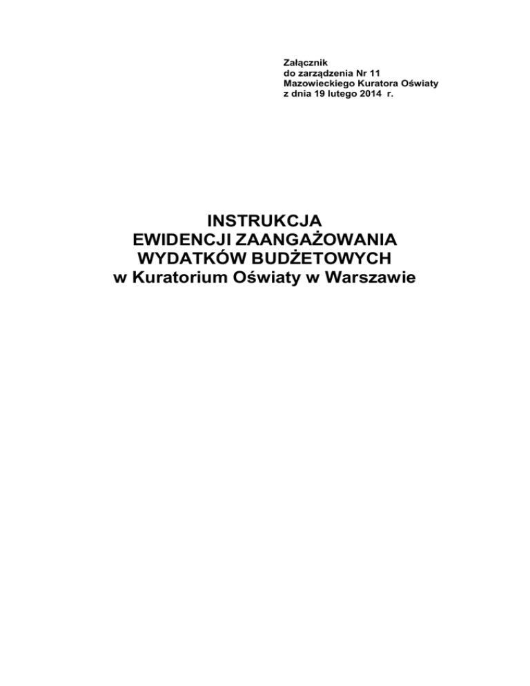 Załącznik do zarządzenia Nr 11 Mazowieckiego Kuratora Oświaty z dnia 19 lutego 2014 r. INSTRUKCJA EWIDENCJI ZAANGAŻOWANIA WYDATKÓW BUDŻETOWYCH w Kuratorium Oświaty w Warszawie 1. Zaangażowanie to czynności prawne, na podstawie których kierownik jednostki budżetowej kształtuje zobowiązania, z których wynika obciążenie planu finansowego w bieżącym roku budżetowym oraz w latach następnych. 2. Zaangażowanie jest etapem poprzedzającym dokonanie wydatku. Wartość zaangażowania nie może przekroczyć limitów wydatków określonych w planie finansowym danego roku budżetowego. 3. Na zaangażowanie wydatków budżetowych składa się równowartość zawartych: 1) umów oraz aneksów do umów; 2) umów o pracę wraz z pochodnymi; 3) zleceń; 4) decyzji; 5) porozumień; 6) innych dokumentów powodujących konieczność dokonania wydatków budżetowych: a) faktury, rachunki – bez pisemnej formy umowy lub zlecenia, b) koszty podróży służbowych – ewidencja na podstawie rozliczonych delegacji; 7) kwoty rocznego odpisu na Zakładowy Fundusz Świadczeń Socjalnych; 8) kwoty dokumentów księgowych wynikających z zawartych umów bezkwotowych – ewidencja na podstawie faktur, rachunków, not księgowych; 9) kwoty dotacji celowych wynikające z wydanych decyzji Wojewody Mazowieckiego przeznaczonych na sfinansowanie stypendiów Prezesa Rady Ministrów; 10) kwoty dotacji celowych wynikających z wydanych decyzji Wojewody Mazowieckiego przeznaczonych na sfinansowanie prac komisji kwalifikacyjnych w zakresie awansu zawodowego nauczycieli. 4. Szczegółowy zakres zaangażowania wydatków budżetowych zawiera załącznik Nr 1. 5. Do wydatków, które nie pociągają za sobą zobowiązań finansowych (jednorazowe wydatki) nie uruchamia się limitów – księguje się je na podstawie faktur VAT, rachunków, not księgowych. 6. W przypadku umów wieloletnich, w zaangażowanie wydatków budżetowych bieżącego roku ujmuje się tylko kwoty obciążające plan finansowy danego roku, a kwotę obciążającą lata następne ujmuje się w zaangażowaniu na lata przyszłe. 7. Ewidencja zaangażowania wydatków budżetowych roku bieżącego i lat przyszłych prowadzona jest w szczegółowości: dział, rozdział, paragraf klasyfikacji budżetowej. 8. Merytoryczne komórki organizacyjne zobowiązane są do złożenia „Zestawienia zaangażowania wydatków budżetowych” w zakresie wymienionym w pkt.3 w miesiącu zawarcia umowy, ale przed dokonaniem wydatku zgodnie ze wzorem zestawienia stanowiącym załącznik Nr 2. 9. „Zestawienia zaangażowania wydatków budżetowych” obejmujące wartość umów, aneksów do umów, porozumień należy przekazywać do Wydziału Finansów i Kadr w terminie 7 dni od daty ich sporządzenia (podpisania), a dokumenty sporządzone w końcu danego miesiąca nie później niż do 5-go każdego dnia miesiąca za miesiąc poprzedni. Umowy zlecenia i umowy o dzieło powinny być angażowane bez zbędnej zwłoki, maksymalnie w terminie do trzech dni od daty ich sporządzenia/podpisania. 2 10. Główny księgowy dokonuje sprawdzenia i akceptacji ww. dokumentów zgodnie z zasadami i w terminach wskazanych w niniejszej instrukcji. Data podpisania dokumentu przez głównego księgowego jest jednocześnie datą potwierdzającą jego wpływ do Wydziału Finansów i Kadr celem ujęcia w ewidencji księgowej. 11. Wszystkie dokumenty płatnicze (faktury, rachunki, listy wypłat) powstałe w wyniku wcześniej zaewidencjonowanych dokumentów muszą w opisie zatwierdzającym te dokumenty do realizacji powoływać się na przekazany wcześniej do księgowania dokument o zaangażowaniu. 12. Ewidencja zaangażowania dotyczącego wynagrodzeń odbywa się na podstawie „Zestawienia rocznego zaangażowania z tytułu zawartych umów o pracę”, z wyszczególnieniem: a) wynagrodzenia brutto, b) dodatkowego wynagrodzenia rocznego, c) nagród jubileuszowych, d) odpraw emerytalnych, e) pochodnych od wynagrodzeń (składki płacone przez pracodawcę), f) rocznego odpisu na ZFŚS. 13. Ewidencja zaangażowania na podstawie zawartych i podpisanych umów bez wskazania konkretnej kwoty (w szczególności umowy na dostaw energii elektrycznej, wody, gazu, odprowadzania ścieków, świadczenia usług telekomunikacyjnych i inne) odbywa się na podstawie otrzymanych faktur VAT, rachunków. 14. Jednorazowe wydatki dotyczące dostaw i usług nie objęte wcześniej zawartymi umowami, ewidencjonuje się na podstawie otrzymanych faktur VAT, rachunków, not księgowych natomiast ewidencja kosztów podróży służbowych odbywa się na podstawie rozliczonej delegacji. 15. Dokumenty płatnicze (faktury, rachunki, listy wypłat, rachunki za delegacje służbowe itp.), które nie były wcześniej ewidencjonowane w ewidencji zaangażowania, muszą zostać opatrzone pieczęcią o treści „Dokument podlega księgowaniu w ewidencji zaangażowania”. 16. W ciągu roku budżetowego komórki merytoryczne dokonują korekt i weryfikacji wartości zaangażowania wynikających z aneksów do umów, zmian decyzji, zmian kadrowych itp. i przekazują niezwłocznie korektę do Wydziału Finansów i Kadr. 17. „Zestawienia zaangażowania wydatków budżetowych” dotyczące zwolnień środków z umów oraz korekty zaangażowania (w tym również zwolnień środków z umów na koniec roku obrotowego) należy przedkładać w Wydziale Finansów i Kadr w terminie do 5-go każdego miesiąca za miesiąc poprzedni. 18. Szczegółowy opis w zakresie udokumentowania budżetowych określa załącznik Nr 3. 19. Do ewidencji księgowej zaangażowania wydatków budżetowych ujętych w planie finansowym Kuratorium Oświaty w Warszawie służą konta pozabilansowe: zaangażowania wydatków 998 „Zaangażowanie wydatków budżetowych roku bieżącego” 999 „Zaangażowanie wydatków budżetowych przyszłych lat” 983 „Zaangażowanie wydatków środków europejskich roku bieżącego” 984 „Zaangażowanie wydatków środk