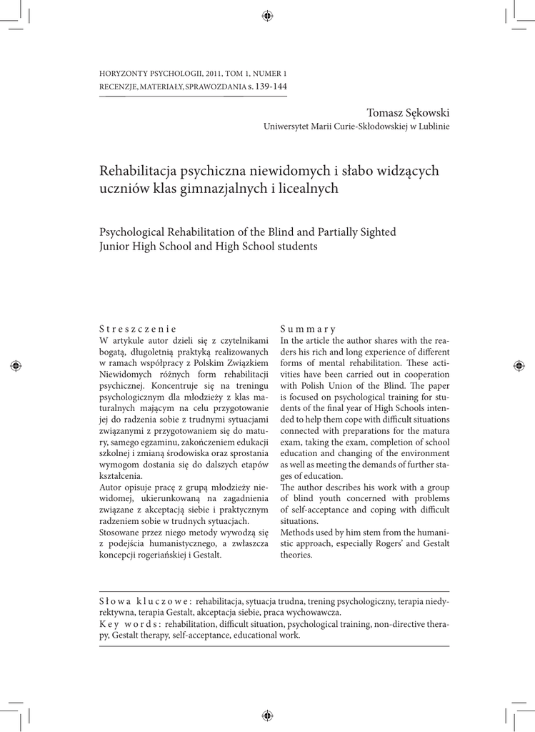 HORYZONTY PSYCHOLOGII, 2011, TOM 1, NUMER 1 RECENZJE, MATERIAŁY, SPRAWOZDANIA s. 139-144 Tomasz Sękowski Uniwersytet Marii Curie-Skłodowskiej w Lublinie Rehabilitacja psychiczna niewidomych i słabo widzących uczniów klas gimnazjalnych i licealnych Psychological Rehabilitation of the Blind and Partially Sighted Junior High School and High School students S t r e s z c z e n i e W artykule autor dzieli się z czytelnikami bogatą, długoletnią praktyką realizowanych w ramach współpracy z Polskim Związkiem Niewidomych różnych form rehabilitacji psychicznej. Koncentruje się na treningu psychologicznym dla młodzieży z klas maturalnych mającym na celu przygotowanie jej do radzenia sobie z trudnymi sytuacjami związanymi z przygotowaniem się do matury, samego egzaminu, zakończeniem edukacji szkolnej i zmianą środowiska oraz sprostania wymogom dostania się do dalszych etapów kształcenia. Autor opisuje pracę z grupą młodzieży niewidomej, ukierunkowaną na zagadnienia związane z akceptacją siebie i praktycznym radzeniem sobie w trudnych sytuacjach. Stosowane przez niego metody wywodzą się z podejścia humanistycznego, a zwłaszcza koncepcji rogeriańskiej i Gestalt. Summary In the article the author shares with the readers his rich and long experience of different forms of mental rehabilitation. These activities have been carried out in cooperation with Polish Union of the Blind. The paper is focused on psychological training for students of the final year of High Schools intended to help them cope with difficult situations connected with preparations for the matura exam, taking the exam, completion of school education and changing of the environment as well as meeting the demands of further stages of education. The author describes his work with a group of blind youth concerned with problems of self-acceptance and coping with difficult situations. Methods used by him stem from the humanistic approach, especially Rogers’ and Gestalt theories. S ł o w a k l u c z o w e : rehabilitacja, sytuacja trudna, trening psychologiczny, terapia niedy- rektywna, terapia Gestalt, akceptacja siebie, praca wychowawcza. K e y w o r d s : rehabilitation, difficult situation, psychological training, non-directive therapy, Gestalt therapy, self-acceptance, educational work. 140 T. Sękowski, Rehabilitacja psychiczna niewidomych i słabo widzących uczniów... HORYZONTY PSYCHOLOGII, 2011, TOM 1, NUMER 1 – ROZPRAWY I ARTYKUŁY NAUKOWE W artykule tym pragnę podzielić się swoimi ponad dwudziestoletnimi doświadczeniami w dziedzinie prowadzonej przeze mnie rehabilitacji psychicznej osób niewidomych i słabo widzących członków Polskiego Związku Niewidomych. Formy podejmowanej pracy mają bardzo różnorodny charakter, począwszy od pojedynczych wykładów lub warsztatowych spotkań na zebraniach różnych sekcji PZN (np. osób niewidomych i słabo widzących, chorych na cukrzycę czy klubu uczącej się młodzieży), poprzez cykle sesji pracy indywidualnej i grupowej, aż do kilkunastodniowych turnusów rehabilitacyjnych. Turnusy te gromadziły, pod względem określonego kryterium, jednorodną grupę, której członkowie mogli spotykać się z podobnymi problemami, np. nowi członkowie PZN, dzieci i młodzież, niewidomi w podeszłym wieku. W ostatnich latach miałem możliwość zebrać wiele doświadczeń w prowadzeniu rehabilitacji psychicznej z niewidomą i słabo widzącą młodzieżą, zgłaszającą się z problemami i trudnościami w funkcjonowaniu osobistym, rodzinnym i szkolnym. Poniżej przedstawiam zagadnienia związane z problemami ujawniającymi się na gruncie szkoły. Przeszkoda, którą stanowi brak wzroku lub trudności w normalnym po sługiwaniu się nim, sprawia, że każda sytuacja, w jakiej znajdzie się osoba niepełnosprawna, nabiera znamion sytuacji trudnej (por. Larkowa 1987). Osoba niewidoma na skutek swojej niepełnosprawności jest narażona na trudności w zaspokajaniu wielu potrzeb. Konsekwencje braku wzroku lub ograniczonych możliwości posługiwania się nim mogą wiązać się z trudnościami w dziedzinie poznawania i orientowania się w świecie, a także funkcjonowania psychicznego i społecznego. Brak wzroku uniemożliwia człowiekowi niewidomemu poznawanie świata w taki sposób, w jaki czynią to ludzie pełnosprawni. Muszą zastąpić go inne zmysły. Ważną funkcję w poznawaniu i rozumieniu świata przez ludzi niewidomych i ze znacznym upośledzeniem wzroku, spełnia drugi układ sygnałowy. U osoby niewidomej występuje zjawisko kompensacji, polegające na wykorzystywaniu pozostałych sprawnych zmysłów oraz wyobrażeń, pamięci i myślenia. Dzięki temu w korze mózgowej powstają strukturalne układy dynamiczne określające sposoby przebiegu procesów w sytuacji poznawczej (por. Grzegorzewska 1964). Dzięki zjawisku kompensacji niewidomy człowiek tworzy własny obraz poznawanego przedmiotu, który nie jest rezultatem sumy wrażeń pozostałych zmysłów, lecz nową skomplikowaną jakością. Funkcjonowanie w świecie i problemy związane ze zdobywaniem wiedzy, w przypadku niewidomych i słabo widzących uczniów szkoły specjalnej, w sytuacjach dostarczających szczególnie wysokiej stymulacji, jak sprawdziany, występy przed audytorium (klasy, szkoły), testy i egzaminy, wymaga od nich dużej odporności i dojrzałości psychicznej. Mający trudności z poradzeniem sobie z takimi sytuacjami uczniowie klas gimnazjalnych i licealnych po rozmowach z pedagogiem szkolnym wyrazili zainteresowanie i chęć uczestniczenia w psychologicznych spotkaniach grupowych, T. Sękowski, Rehabilitacja psychiczna niewidomych i słabo widzących uczniów... HORYZONTY PSYCHOLOGII, 2011, TOM 1, NUMER 1 – ROZPRAWY I ARTYKUŁY NAUKOWE 141 licząc na to, że pomogą im one w mniejszym stopniu koncentrować się na przeżywanych obawach i stresach, a zaoszczędzona energia ułatwi efektywniejszą naukę i lepsze samopoczucie. Trening psychologiczny 